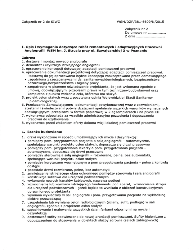 Załącznik nr 2 do SIWZ w sM / DzP / 38 1 _ 6609/N/20 1 5 Załącznik nr 2 Do umowy nr .......,.......,.... Z dnia I. Opis iwymagania dotyczące robót remontowych i adaptacyjnych Pracowni Angiografii WSM im. J. Strusia przy ul. Szwajcarskiej 3 w Poznaniu Zakres: dostawa i montaż nowego angiografu demontaz i utylizacja istniejącego angiografu opracowanie koncepcji dotyczącej adaptacji pomieszczeń pracowni opracowanie dokumentacji projektowej dotyczącej adaptacji pomieszczeń pracowni. Podstawą do jej opracowania będzie koncepcja zaakceptowana przez Zamawiającego. . uzgodniona z rzeczoznawcami ds. sanitarno-epidemiologicznych, bezpieczeństwa pożaroweg o,bezpieczeństwa i higieny pracy . zaopatrzona w pisemne oświadczenie projektanta, że jest wykonana zgodnie z umową, obowiązującymi przepisami prawa w tym techniczno-budowlanymi oraz kompletna z punktu widzenia celu, któremu ma słuzyć. 5. projekt osłon stałych wrazz pozytywną opinią Wojewódzkiej Stacji SanitarnoEpidemiologicznej. 6. Przekazanie Zamawiającemu dokumentacji powykonawczej wrazz zezwoleniami, atestami i Świadectwami potwierdzającymi spełnienie wszelkich warunków wymaganych obowiązującymi przepisami w formie papierowej w 2 egzemplarzach i na płycie CD 7. wykonawca odpowiada za wszelkie administracyjne pozwolenia i dopuszczenia pracowni do uzytkowania 8. wykonawca przed złozeniem oferty dokona wizji lokalnej pomieszczeń pracowni 1. 2. 3. 4. 1. Branża budowtana: 1. drzwi wykończone w sposób umożliwiający ich mycie i dezynfekcję: o pomiędzy pom, przygotowania pacjenta a salą angiografii - automatyczne, spełniające warunki projektu osłon stałych, dopuszcza się drzwi przesuwne o pomiędzy pom. przygotowania lekarzy a pom. przygotowania pacjenta automatyczne, dopuszcza się drzwi przesuwne o pomiędzy sterownią a salą angiografii - rozwierane, pełne, bez automatyki, spełniające warunki projektu osłon stałych o pomiędzy korytarzem wewnętrznym a pom przygotowania pacjenta - pełne z kontrolą dostępu o pozostałe drzwi rozwierane, pełne, bez automatyki 2. zmniejszenie istniejącego okna ochronnego pomiędzy sterownią i salą angiografii 3. konstrukcja sufitowa dla urządzeń podwieszanych 4. wykonanie nowych kanałów kablowych, naprawa podłogi 5. wzmocnienie lub wymiana istniejącego fundamentu pod aparat, wzmocnienie stropu dla urządzeń podwieszanych - jezeli będzie to wynikało z obliczeń konstrukcyjnych uprawn ionego projektanta 6. wymiana wykładziny w sali angiografii i pom. przygotowaniu pacjenta na wykładzinę elektro przewodzącą 7. uzupełnienie lub wymiana osłon radiologicznych (Ściany, sufit, podłoga) w sali angiografii, zgodnie z projektem osłon stałych B. szpachlowanie i malowanie wszystkich ścianfarbami odpornymi na mycie i dezynfekcję 9. dostosować sufity podwieszone do nowej aranżacji pomieszczeń. Sufity higieniczne z dopuszczeniem do stosowania w obiektach służbyzdrowia (salach zabiegowych) 10.szafa wnękowa od strony korytarza wewnętrznego w sali angiografii z możliwościąjej mycia i dezynfekcji 11.zabudowa meblowa w pom. przygotowania pacjenta z możliwościąjej mycia i dezynfekcji 12. wymagane jest takie usytuowanie pomieszczeń, aby umozliwić przejście ze sterowni do pom przygotowania pacjenta. Usytuowanie ścianek działowych zgodnie z zaa kceptowa ną przez Za mawiaj ącego koncepcją. 2. Branża etektryczna: 1. dostosowanie iewentualnąwymianę zasilania itras na potrzeby zasilania aparatu i pracowni Istniejący kabel Cu 5x50 ekranowany o długoŚci ok. 40 m, zabezpieczenie w rozdzielni głównej bloku B 160A. W przypadku konieczności zwiększenia przekroju kabla względnie dołozenia nowego nalezy go zmufować i przenieśćdo innego pola rozdzielni nn(długośćprzedłużenia ok. 10 m). 2. zasilanie urządzeń klimatyzacji i wentylacji 3. montaz systemu sieci IT - np. Bender (system kontroli izolacji) - w tym: tra nsformator seperacyj ny medyczny, mod uł ko ntrol no zasi lający, kaseta sygnalizacyjna 4. montaż nowego osprzętu na Ścianach oraz opraw oświetleniowych - oprawy podstawowe, awaryjne, ewakuacyjne, oraz,,Uwaga promieniowanie" na potrzeby pracowni 5. instalację sieci strukturalnej na potrzeby pracowni z wyposażeniem PD w ewentualny sprzęt pasywny (patch panele, organizery kabli, patchcordy) 6. instalację systemu Kontroli Dostępu KD - drzwi wejŚciowe w korytarzu 7. instalacja systemu SAP - uzupełnienia i prace instalacyjne związane z nową aranzacją pomieszczeń B. pomiary elektryczne 9. dostawy i montażu sprzętu aktywnego (switch) 10. gniazda sieciowe systemu komputerowego szpitala w pomieszczeniu sterowni 3. Branża sanitarna: 1. 4. dostosowaĆ system wentylacji w pracowni do aktualnych potrzeb i wymagań nowego aparatu. zdemontowaĆ istniejący układ schładzania powietrza w sali angiografii z czynnikiem chłodniczym R22 i zamontować w sali angiografii oraz sterowni klimatyzator typu Multi Split z pro-ekologicznym czynnikiem chłodniczym. Dostosować wydajność klimatyzatora w pomieszczeniu technicznym do nowych urządzeń w oparciu o bilans obciązeń chłod niczych. myjnia chirurgiczna dwustanowiskowa (koryto ze stali nierdzewnej) z bateriami a utomatyczny mi, bezdotykowym i i podaj n i ka m i środ ków d ezynfekcyj nych w pom ieszczen iu przygotowa n ia leka rzy korekta instalacji c.o. wraz z grzejnikami 4. Gazy medyczne: 2. 3, demontaz i montaz w nowym miejscu 2 punktów poboru gazów medycznych (tlen, podtlenek azotu, próżnia, spręzone powietrze) wraz z instalacjami, zlokalizowanych na Ścianie między salą angiografii a pokojem przygotowania pacjenta (w przypadku powiększenia sali angiografii) rnstalacje gazów medycznych muszą być gwarantowane certyfikacją wyrobu medycznego - znak CE. Wykonawca na poparcie swoich kwalifikacji powinien przedstawić certyfikat jakoŚci PN-EN ISO 13485-2OL2. II. Wymagania dotyczące projektu uwzględniać wszystkie branże, zgodnie z zakresem wymagań Z