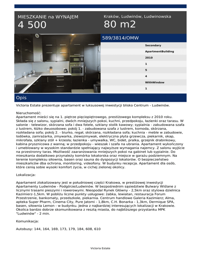 Kraków, Ludwinów, Ludwinowska MIESZKANIE na WYNAJEM 80 m2 4 500 589/3814/OMW Secondary ApartmentBuilding 2010 1 5 4 WithWindow 1 Opis Victoria Estate prezentuje apartament w luksusowej inwestycji blisko Centrum - Ludwinów. Nieruchomość: Apartament mieści się na 1. piętrze pięciopiętrowego, prestiżowego kompleksu z 2010 roku. Składa się z salonu, sypialni, dwóch mniejszych pokoi, kuchni, przedpokoju, łazienki oraz tarasu. W salonie - telewizor, skórzana sofa i dwa fotele, szklany stolik kawowy; sypialnia - zabudowana szafa z lustrem, łóżko dwuosobowe; pokój 1. - zabudowana szafa z lustrem, komoda, skórzana, rozkładana sofa; pokój 2. - biurko, regał, skórzana, rozkładana sofa; kuchnia - meble w zabudowie, lodówka, zamrażarka, zmywarka, zlewozmywak, elektryczna płyta grzewcza, piekarnik, okap, mikrofala, szklany stół + krzesła; łazienka - umywalka, WC, bidet, pralka, grzejnik drabinkowy, kabina prysznicowa z wanną; w przedpokoju - wieszak i szafa na ubrania. Apartament wykończony i umeblowany w wysokim standardzie spełniający najwyższe wymagania najemcy. Z salonu wyjście na przestronny taras. Możliwość zaaranżowania mniejszych pokoi na gabinet lub sypialnie. Do mieszkania dodatkowo przynależy komórka lokatorska oraz miejsce w garażu podziemnym. Na terenie kompleksu siłownia, basen oraz sauna do dyspozycji lokatorów. O bezpieczeństwo mieszkańców dba ochrona, monitoring, videofony. W budynku recepcja. Apartament dla osób, które cenią sobie wysoki komfort życia, w cichej zielonej okolicy. Lokalizacja: Apartament zlokalizowany jest w południowej części Krakowa, w prestiżowej inwestycji Apartamenty Ludwinów - Podgórze/Ludwinów. W bezpośrednim sąsiedztwie Bulwary Wiślane z licznymi trasami pieszymi i rowerowymi. Nieopodal Rynek Główny - 2,5km oraz stylowa dzielnica Kazimierz-1,5km. W pobliżu liczne punkty usługowe: żabka, lewiatan, restauracja Forum Przestrzenie, bankomaty, przedszkole, piekarnia. Centrum handlowe Galeria Kazimierz; Alma, apteka Super Pharm, Cinema City, Pure Jatomi - 1,8km, C.H. Bonarka - 1,3km, Dermique SPA, basen, siłownia Lemon - w budynku. Jedna z najbardziej interesujących lokalizacji w Krakowie. Okolica bardzo dobrze skomunikowana z resztą miasta, do najbliższego przystanku MPK "Ludwinów" - 2 min. Komunikacja: Autobusy: 144, 164, 169, 173, 179, 184, 608, 610 Victoria Estate Opłaty: 4500zł najem + media Polecam i zapraszam do oglądania! Małgorzata Wicha tel. +48 511 560 721 email: [email protected] Victoria Estate Powered by TCPDF (www.tcpdf.org)
