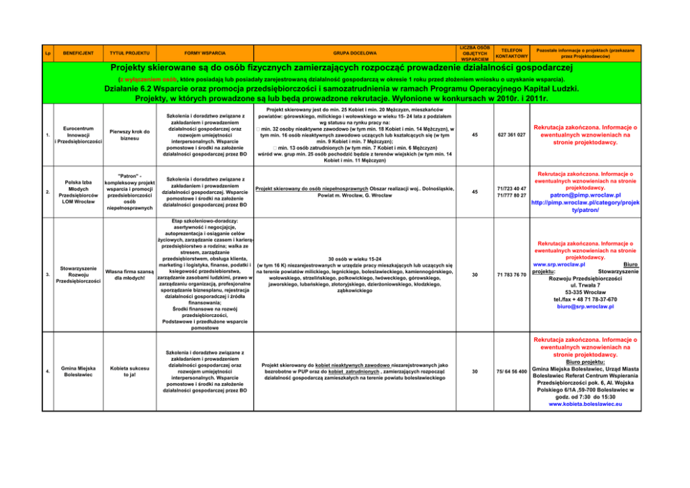 Lp BENEFICJENT TYTUŁ PROJEKTU FORMY WSPARCIA GRUPA DOCELOWA LICZBA OSÓB OBJĘTYCH WSPARCIEM TELEFON KONTAKTOWY Pozostałe informacje o projektach (przekazane przez Projektodawców) Projekty skierowane są do osób fizycznych zamierzających rozpocząć prowadzenie działalności gospodarczej (z wyłączeniem osób, które posiadają lub posiadały zarejestrowaną działalność gospodarczą w okresie 1 roku przed złożeniem wniosku o uzyskanie wsparcia). Działanie 6.2 Wsparcie oraz promocja przedsiębiorczości i samozatrudnienia w ramach Programu Operacyjnego Kapitał Ludzki. Projekty, w których prowadzone są lub będą prowadzone rekrutacje. Wyłonione w konkursach w 2010r. i 2011r. 1. 2. 3. 4. Eurocentrum Innowacji i Przedsiębiorczości Polska Izba Młodych Przedsiębiorców LOM Wrocław Pierwszy krok do biznesu "Patron" kompleksowy projekt wsparcia i promocji przedsiebiorczości osób niepełnosprawnych Szkolenia i doradztwo związane z zakładaniem i prowadzeniem działalności gospodarczej oraz rozwojem umiejętności interpersonalnych. Wsparcie pomostowe i środki na założenie działalności gospodarczej przez BO Szkolenia i doradztwo związane z zakładaniem i prowadzeniem działalności gospodarczej. Wsparcie pomostowe i środki na założenie działalności gospodarczej przez BO Projekt skierowany jest do min. 25 Kobiet i min. 20 Mężczyzn, mieszkańców powiatów: górowskiego, milickiego i wołowskiego w wieku 15- 24 lata z podziałem wg statusu na rynku pracy na: tym min. 16 osób nieaktywnych zawodowo uczących lub kształcących się (w tym min. 9 Kobiet i min. 7 Mężczyzn); Gmina Miejska Bolesławiec Kobieta sukcesu to ja! 627 361 027 Rekrutacja zakończona. Informacje o ewentualnych wznowieniach na stronie projektodawcy. wśród ww. grup min. 25 osób pochodzić będzie z terenów wiejskich (w tym min. 14 Kobiet i min. 11 Mężczyzn) Projekt skierowany do osób niepełnosprawnych Obszar realizacji woj.. Dolnośląskie, Powiat m. Wrocław, G. Wrocław Etap szkoleniowo-doradczy: asertywność i negocjajcje, autoprezentacja i osiąganie celów życiowych, zarządzanie czasem i karierąprzedsiębiorstwo a rodzina; walka ze stresem, zarządzanie przedsiębiorstwem, obsługa klienta, 30 osób w wieku 15-24 marketing i logistyka, finanse, podatki i (w tym 16 K) niezarejestrowanych w urzędzie pracy mieszkających lub uczących się Stowarzyszenie ksiegowość przedsiebiorstwa, Własna firma szansą na terenie powiatów milickiego, legnickiego, boleslawieckiego, kamiennogórskiego, Rozwoju zarządzanie zasobami ludzkimi, prawo w dla młodych! wołowskiego, strzelińskiego, polkowickiego, lwóweckiego, górowskiego, Przedsiębiorczości zarządzaniu organizacją, profesjonalne jaworskiego, lubańskiego, złotoryjskiego, dzierżoniowskiego, kłodzkiego, sporządzanie biznesplanu, rejestracja ząbkowickiego działalności gosporadczej i źródła finansowania; Środki finansowe na rozwój przedsiębiorczości, Podstawowe i przedłużone wsparcie pomostowe Szkolenia i doradztwo związane z zakładaniem i prowadzeniem działalności gospodarczej oraz rozwojem umiejętności interpersonalnych. Wsparcie pomostowe i środki na założenie działalności gospodarczej przez BO 45 45 30 71/723 40 47 71/777 80 27 71 783 76 70 Rekrutacja zakończona. Informacje o ewentualnych wznowieniach na stronie projektodawcy. [email protected] http://pimp.wroclaw.pl/category/projek ty/patron/ Rekrutacja zakończona. Informacje o ewentualnych wznowieniach na stronie projektodawcy. www.srp.wroclaw.pl Biuro projektu: Stowarzyszenie Rozwoju Przedsiębiorczości ul. Trwała 7 53-335 Wrocław tel./fax + 48 71 78-37-670 [email protected] Rekrutacja zakończona. Informacje o ewentualnych wznowieniach na stronie projektodawcy. Projekt skierowany do kobiet nieaktywnych zawodowo niezarejstrowanych jako bezrobotne w PUP oraz do kobiet zatrudnionych , zamierzających rozpocząć działalność gospodarczą zamieszkałych na terenie powiatu bolesławieckiego 30 75/ 64 56 400 Biuro projektu: Gmina Miejska Bolesławiec, Urząd Miasta Bolesławiec Referat Centrum Wspierania Przedsiębiorczości pok. 6, Al. Wojska Polskiego 6/1A ,59-700 Bolesławiec w godz. od 7:30 do 15:30 www.kobieta.boleslawiec.eu