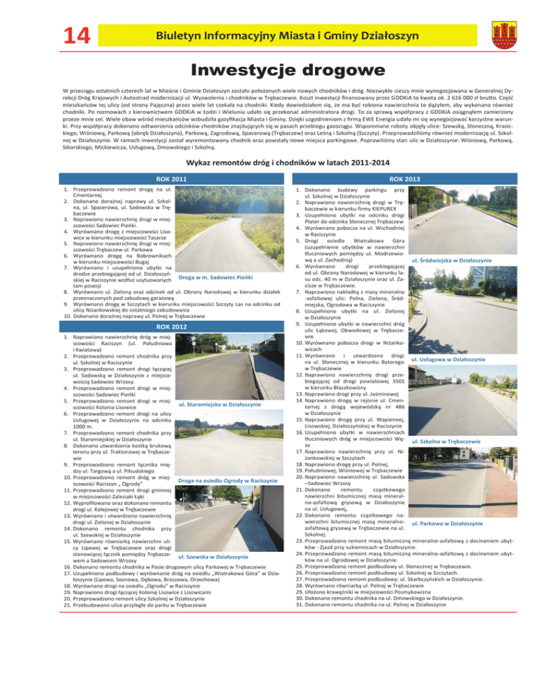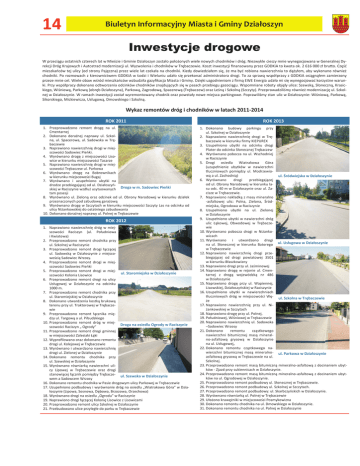 14 Biuletyn Informacyjny Miasta i Gminy Działoszyn Inwestycje drogowe W przeciągu ostatnich czterech lat w Mieście i Gminie Działoszyn zostało położonych wiele nowych chodników i dróg. Niezwykle cieszy mnie wynegocjowana w Generalnej Dyrekcji Dróg Krajowych i Autostrad modernizacji ul. Wyzwolenia i chodników w Trębaczewie. Koszt inwestycji finansowany przez GDDKiA to kwota ok. 2 616 000 zł brutto. Część mieszkańców tej ulicy (od strony Pajęczna) przez wiele lat czekała na chodniki. Kiedy dowiedziałem się, że ma być robiona nawierzchnia to dążyłem, aby wykonano również chodniki. Po rozmowach z kierownictwem GDDKiA w Łodzi i Wieluniu udało się przekonać administratora drogi. To za sprawą współpracy z GDDKiA osiągnąłem zamierzony przeze mnie cel. Wiele obaw wśród mieszkańców wzbudziła gazyfikacja Miasta i Gminy. Dzięki uzgodnieniom z firmą EWE Energia udało mi się wynegocjować korzystne warunki. Przy współpracy dokonano odtworzenia odcinków chodników znajdujących się w pasach przebiegu gazociągu. Wspomniane roboty objęły ulice: Szewską, Słoneczną, Krasickiego, Wiśniową, Parkową (obręb Działoszyna), Parkową, Zagrodową, Spacerową (Trębaczew) oraz Leśną i Szkolną (Szczyty). Przeprowadziliśmy również modernizację ul. Szkolnej w Działoszynie. W ramach inwestycji został wyremontowany chodnik oraz powstały nowe miejsca parkingowe. Poprawiliśmy stan ulic w Działoszynie: Wiśniową, Parkową, Sikorskiego, Mickiewicza, Usługową, Dmowskiego i Szkolną. Wykaz remontów dróg i chodników w latach 2011-2014 ROK 2011 ROK 2013 1. Przeprowadzono remont drogę na ul. Cmentarnej 2. Dokonano doraźnej naprawy ul. Szkolna, ul. Spacerowa, ul. Sadowska w Trębaczewie 3. Naprawiono nawierzchnię drogi w miejscowości Sadowiec Pieńki. 4. Wyrównano drogę z miejscowości Lisowice w kierunku miejscowości Tasarze 5. Naprawiono nawierzchnię drogi w miejscowości Trębaczew ul. Parkowa 6. Wyrównano drogę na Bobrownikach w kierunku miejscowości Bugaj 7. Wyrównano i uzupełniono ubytki na drodze przebiegającej od ul. Działoszyńskiej w Raciszynie wzdłuż usytuowanych Droga w m. Sadowiec Pieńki tam posesji 8. Wyrównano ul. Zieloną oraz odcinek od ul. Obrony Narodowej w kierunku działek przeznaczonych pod zabudowę garażową 9. Wyrównano drogę w Szczytach w kierunku miejscowości Szczyty Las na odcinku od ulicy Niżankowskiej do ostatniego zabudowania 10. Dokonano doraźnej naprawy ul. Polnej w Trębaczewie 1. Dokonano budowy parkingu przy ul. Szkolnej w Działoszynie 2. Naprawiono nawierzchnię drogi w Trębaczewie w kierunku firmy KIEPUREX 3. Uzupełniono ubytki na odcinku drogi Plater do odcinka Słonecznej Trębaczew 4. Wyrównano pobocza na ul. Wschodniej w Raciszynie 5. Drogi osiedla Wiatrakowa Góra (uzupełnienie ubytków w nawierzchni tłuczniowych pomiędzy ul. Modrzewiową a ul. Zachodnią) ul. Śródwiejska w Działoszynie 6. Wyrównano drogi przebiegającej od ul. Obrony Narodowej w kierunku lasu odc. 40 m w Działoszynie oraz ul. Zacisze w Trębaczewie. 7. Naprawiono nakładką z masy mineralno -asfaltowej ulic: Polna, Zielona, Śródmiejska, Ogrodowa w Raciszynie 8. Uzupełniono ubytki na ul. Zielonej w Działoszynie 9. Uzupełniono ubytki w nawierzchni dróg ulic Łąkowej, Obwodowej w Trębaczewie 10. Wyrównano pobocza drogi w Niżankowicach 11. Wyrównano i utwardzono drogi na ul. Słonecznej w kierunku Batorego ul. Usługowa w Działoszynie w Trębaczewie 12. Naprawiono nawierzchnię drogi przebiegającej od drogi powiatowej 3501 w kierunku Błaszkowizny 13. Naprawiono drogi przy ul. Jaśminowej 14. Naprawiono drogę w rejonie ul. Cmentarnej z drogą wojewódzką nr 486 w Działoszynie 15. Naprawiono drogę przy ul. Wapiennej, Lisowskiej, Działoszyńskiej w Raciszynie 16. Uzupełniono ubytki w nawierzchniach tłuczniowych dróg w miejscowości Węul. Szkolna w Trębaczewie że 17. Naprawiono nawierzchnię przy ul. Niżankowskiej w Szczytach 18. Naprawiono drogę przy ul. Polnej, 19. Południowej, Wiśniowej w Trębaczewie 20. Naprawiono nawierzchnię ul. Sadowska –Sadowiec Wrzosy 21. Dokonano remontu cząstkowego nawierzchni bitumicznej masą mineralno-asfaltową grysową w Działoszynie na ul. Usługowej, 22. Dokonano remontu cząstkowego nawierzchni bitumicznej masą mineralno- ul. Parkowa w Działoszynie asfaltową grysową w Trębaczewie na ul. Szkolnej. 23. Przeprowadzono remont masą bitumiczną mineralno-asfaltową z docinaniem ubytków - Zjazd przy sukiennicach w Działoszynie. 24. Przeprowadzono remont masą bitumiczną mineralno-asfaltową z docinaniem ubytków na ul. Ogrodowej w Działoszynie. 25. Przeprowadzono remont podbudowy ul. Słonecznej w Trębaczewie. 26. Przeprowadzono remont podbudowy ul. Szkolnej w Szczytach. 27. Przeprowadzono remont podbudowy: ul. Skarbczyńskich w Działoszynie. 28. Wyrównano równiarką ul. Polnej w Trębaczewie 29. Ułożono krawężniki w miejscowości Posmykowizna 30. Dokonano remontu chodnika na ul. Dmowskiego w Działoszynie. 31. Dokonano remontu chodnika na ul. Polnej w Działoszynie ROK 2012 1. Naprawiono nawierzchnię dróg w miejscowości Raciszyn (ul. Południowa i Kwiatowa) 2. Przeprowadzono remont chodnika przy ul. Szkolnej w Raciszynie 3. Przeprowadzono remont drogi łączącej ul. Sadowską w Działoszynie z miejscowością Sadowiec Wrzosy. 4. Przeprowadzono remont drogi w miejscowości Sadowiec Pieńki 5. Przeprowadzono remont drogi w miejul. Staromiejska w Działoszynie scowości Kolonia Lisowice 6. Przeprowadzono remont drogi na ulicy Usługowej w Działoszynie na odcinku 1000 m. 7. Przeprowadzono remont chodnika przy ul. Staromiejskiej w Działoszynie 8. Dokonano utwardzenia kostką brukową terenu przy ul. Traktorowej w Trębaczewie 9. Przeprowadzono remont łącznika między ul. Targową a ul. Piłsudskiego 10. Przeprowadzono remont dróg w miejDroga na osiedlu Ogrody w Raciszynie scowości Raciszyn „ Ogrody” 11. Przeprowadzono remo