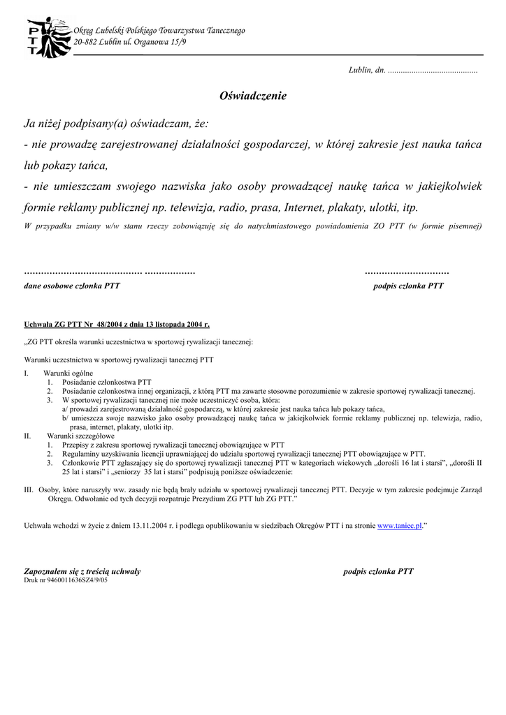 Okręg Lubelski Polskiego Towarzystwa Tanecznego 20-882 Lublin ul. Organowa 15/9 Lublin, dn. .......................................... Oświadczenie Ja niŜej podpisany(a) oświadczam, Ŝe: - nie prowadzę zarejestrowanej działalności gospodarczej, w której zakresie jest nauka tańca lub pokazy tańca, - nie umieszczam swojego nazwiska jako osoby prowadzącej naukę tańca w jakiejkolwiek formie reklamy publicznej np. telewizja, radio, prasa, Internet, plakaty, ulotki, itp. W przypadku zmiany w/w stanu rzeczy zobowiązuję się do natychmiastowego powiadomienia ZO PTT (w formie pisemnej) …………………………………… ……………… dane osobowe członka PTT ………………………… podpis członka PTT Uchwała ZG PTT Nr 48/2004 z dnia 13 listopada 2004 r. „ZG PTT określa warunki uczestnictwa w sportowej rywalizacji tanecznej: Warunki uczestnictwa w sportowej rywalizacji tanecznej PTT I. II. Warunki ogólne 1. Posiadanie członkostwa PTT 2. Posiadanie członkostwa innej organizacji, z którą PTT ma zawarte stosowne porozumienie w zakresie sportowej rywalizacji tanecznej. 3. W sportowej rywalizacji tanecznej nie moŜe uczestniczyć osoba, która: a/ prowadzi zarejestrowaną działalność gospodarczą, w której zakresie jest nauka tańca lub pokazy tańca, b/ umieszcza swoje nazwisko jako osoby prowadzącej naukę tańca w jakiejkolwiek formie reklamy publicznej np. telewizja, radio, prasa, internet, plakaty, ulotki itp. Warunki szczegółowe 1. Przepisy z zakresu sportowej rywalizacji tanecznej obowiązujące w PTT 2. Regulaminy uzyskiwania licencji uprawniającej do udziału sportowej rywalizacji tanecznej PTT obowiązujące w PTT. 3. Członkowie PTT zgłaszający się do sportowej rywalizacji tanecznej PTT w kategoriach wiekowych „dorośli 16 lat i starsi”, „dorośli II 25 lat i starsi” i „seniorzy 35 lat i starsi” podpisują poniŜsze oświadczenie: III. Osoby, które naruszyły ww. zasady nie będą brały udziału w sportowej rywalizacji tanecznej PTT. Decyzje w tym zakresie podejmuje Zarząd Okręgu. Odwołanie od tych decyzji rozpatruje Prezydium ZG PTT lub ZG PTT.” Uchwała wchodzi w Ŝycie z dniem 13.11.2004 r. i podlega opublikowaniu w siedzibach Okręgów PTT i na stronie www.taniec.pl.” Zapoznałem się z treścią uchwały Druk nr 9460011636SZ4/9/05 podpis członka PTT