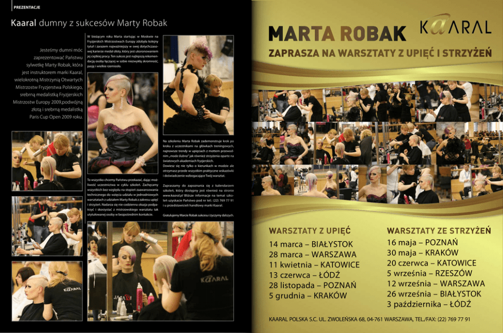 PREZENTACJE Kaaral dumny z sukcesów Marty Robak Jesteśmy dumni móc zaprezentować Państwu sylwetkę Marty Robak, która jest instruktorem marki Kaaral, wielokrotną Mistrzynią Otwartych Mistrzostw Fryzjerstwa Polskiego, srebrną medalistką Fryzjerskich Mistrzostw Europy 2009,podwójną złotą i srebrną medalistką Paris Cup Open 2009 roku. W bieżącym roku Marta startując w Moskwie na Fryzjerskich Mistrzostwach Europy zdobyła kolejny tytuł i zarazem najważniejszy w swej dotychczasowej karierze medal-złoty, który jest ukoronowaniem jej ciężkiej pracy. Ten sukces jest najlepszą rekomendacją osoby łączącej w sobie niezwykłą skromność, pasję i wielkie rzemiosło. Na szkoleniu Marta Robak zademonstruje krok po kroku z uczestnikami na główkach treningowych, najnowsze trendy w upięciach z mottem przewodnim „moda ślubna” jak również strzyżenia oparte na światowych akademiach fryzjerskich. Dowiesz się nie tylko o kierunkach w modzie ale otrzymasz przede wszystkim praktyczne wskazówki i doświadczenie wzbogacające Twój warsztat. To wszystko chcemy Państwu przekazać, dając możliwość uczestnictwa w cyklu szkoleń. Zachęcamy wszystkich bez względu na stopień zaawansowania technicznego do wzięcia udziału w jednodniowych warsztatach z udziałem Marty Robak z zakresu upięć i strzyżeń. Nadarza się nie codzienna okazja podpatrzyć i skorzystać z mistrzowskiego warsztatu tak utytułowanej osoby w bezpośrednim kontakcie. Zapraszamy do zapoznania się z kalendarzem szkoleń, który dostępny jest również na stronie www.kaaral.pl Bliższe informacje na temat szkoleń uzyskacie Państwo pod nr tel.: (22) 769 77 91 i u przedstawicieli handlowy marki Kaaral. Gratulujemy Marcie Robak sukcesu i życzymy dalszych. 14 marca – BIAŁYSTOK 28 marca – WARSZAWA 11 kwietnia – KATOWICE 13 czerwca – ŁÓDŹ 28 listopada – POZNAŃ 5 grudnia – KRAKÓW 16 maja – POZNAŃ 30 maja – KRAKÓW 20 czerwca – KATOWICE 5 września – RZESZÓW 12 września – WARSZAWA 26 września – BIAŁYSTOK 3 października – ŁÓDŹ KAARAL POLSKA S.C. UL. ZWOLEŃSKA 68, 04-761 WARSZAWA, TEL./FAX: (22) 769 77 91