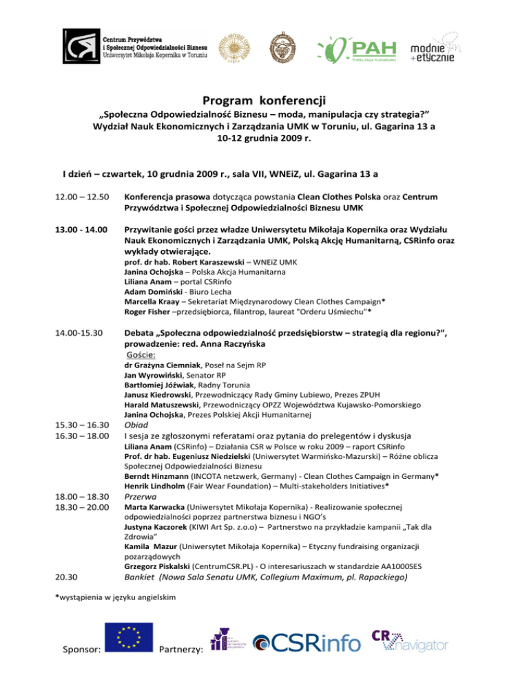 Program konferencji „Społeczna Odpowiedzialnośd Biznesu – moda, manipulacja czy strategia?” Wydział Nauk Ekonomicznych i Zarządzania UMK w Toruniu, ul. Gagarina 13 a 10-12 grudnia 2009 r. I dzieo – czwartek, 10 grudnia 2009 r., sala VII, WNEiZ, ul. Gagarina 13 a 12.00 – 12.50 Konferencja prasowa dotycząca powstania Clean Clothes Polska oraz Centrum Przywództwa i Społecznej Odpowiedzialności Biznesu UMK 13.00 - 14.00 Przywitanie gości przez władze Uniwersytetu Mikołaja Kopernika oraz Wydziału Nauk Ekonomicznych i Zarządzania UMK, Polską Akcję Humanitarną, CSRinfo oraz wykłady otwierające. prof. dr hab. Robert Karaszewski – WNEiZ UMK Janina Ochojska – Polska Akcja Humanitarna Liliana Anam – portal CSRinfo Adam Domioski - Biuro Lecha Marcella Kraay – Sekretariat Międzynarodowy Clean Clothes Campaign* Roger Fisher –przedsiębiorca, filantrop, laureat "Orderu Uśmiechu"* 14.00-15.30 Debata „Społeczna odpowiedzialnośd przedsiębiorstw – strategią dla regionu?”, prowadzenie: red. Anna Raczyoska Goście: dr Grażyna Ciemniak, Poseł na Sejm RP Jan Wyrowioski, Senator RP Bartłomiej Jóźwiak, Radny Torunia Janusz Kiedrowski, Przewodniczący Rady Gminy Lubiewo, Prezes ZPUH Harald Matuszewski, Przewodniczący OPZZ Województwa Kujawsko-Pomorskiego Janina Ochojska, Prezes Polskiej Akcji Humanitarnej 15.30 – 16.30 16.30 – 18.00 Obiad I sesja ze zgłoszonymi referatami oraz pytania do prelegentów i dyskusja Liliana Anam (CSRinfo) – Działania CSR w Polsce w roku 2009 – raport CSRinfo Prof. dr hab. Eugeniusz Niedzielski (Uniwersytet Warmiosko-Mazurski) – Różne oblicza Społecznej Odpowiedzialności Biznesu Berndt Hinzmann (INCOTA netzwerk, Germany) - Clean Clothes Campaign in Germany* Henrik Lindholm (Fair Wear Foundation) – Multi-stakeholders Initiatives* 18.00 – 18.30 18.30 – 20.00 Przerwa 20.30 Bankiet (Nowa Sala Senatu UMK, Collegium Maximum, pl. Rapackiego) Marta Karwacka (Uniwersytet Mikołaja Kopernika) - Realizowanie społecznej odpowiedzialności poprzez partnerstwa biznesu i NGO’s Justyna Kaczorek (KIWI Art Sp. z.o.o) – Partnerstwo na przykładzie kampanii „Tak dla Zdrowia” Kamila Mazur (Uniwersytet Mikołaja Kopernika) – Etyczny fundraising organizacji pozarządowych Grzegorz Piskalski (CentrumCSR.PL) - O interesariuszach w standardzie AA1000SES *wystąpienia w języku angielskim Sponsor: Partnerzy: II dzieo – piątek, 11 grudnia 2009 r., Nowa Sala Rady Wydziału, WNEiZ, ul. Gagarina 13 a 9.00 – 10.30 II sesja ze zgłoszonymi referatami oraz pytania do prelegentów Dyskusja Dr Katarzyna Jasikowska ( Uniwersytet Jagiellooski) - Nowy lepszy świat? Globalizacja po korekcie Dr Małgorzata Koszewska (Politechnika Łódzka) - Normy i standardy w obszarze CSR jako istotny czynniki determinujący zachowania nabywcze konsumentów Dr Monika Malinowska-Olszowy (Politechnika Łódzka) - Ochrona własności przemysłowej a etyka biznesu ze szczególnym uwzględnieniem działalności przedsiębiorstw na rynku odzieżowym Anna Batorczak (Uniwersytet Warszawski) - Czy edukacja dla zrównoważonego rozwoju może pomóc w kształtowaniu postaw konsumenckich? Refleksje z okazji połowy, ogłoszonej przez ONZ, Dekady Edukacji dla Zrównoważonego Rozwoju 10.30 – 10.45 10.45 - 13.30 10.45 - 13.30 13.30 - 14.00 14.00 - 15.00 15.00– 16.00 16.00 – 17.30 17.30 – 18.00 18.00 – 20.00 Przerwa kawowa Równolegle: Warsztat „Społeczna Odpowiedzialnośd Biznesu w praktyce”, prowadzony przez trenerkę CSRinfo – Lilianę Anam, s.58 (dawna Sala Rady Wydziału) Gra symulacyjna „Etyczne przedsiębiorstwo”, prowadzona przez zespół projektu „Modnie i etycznie” PAH Relacje z warsztatów oraz ogłoszenie zwycięzcy gry symulacyjnej. Prezentacja efektów pracy zwycięskiego zespołu z gry symulacyjnej „Etyczne przedsiębiorstwo” Obiad Debata oksfordzka „Czy CSR to moda?” – moderowana przez Ewę Zamościoską Prezentacje studentów EMBA cohort 8 – moderacja prof. dr hab. Robert Karaszewski Przerwa kawowa III sesja ze zgłoszonymi referatami oraz pytania do prelegentów Dyskusja Tomasz Murawski (Uniwersytet Mikołaja Kopernika) – Społecznie odpowiedzialny biznes w bankowości międzynarodowej Dr Dorota Tenewska-Skwiercz (Uniwersytet Ekonomiczny we Wrocławiu) - CSR w globalnym łaocuchu dostaw na przykładzie firmy Reed Elsevier Jan Kruszyoski (UAM) - Małe jest piękne? Społeczna Odpowiedzialnośd Małych i Średnich Przedsiębiorstw Ewa Jastrzębska (Szkoła Główna Handlowa) - System społecznej odpowiedzialności warunkiem skutecznego wdrażania koncepcji CSR 20.00 Kolacja 21.30 Pokaz mody ekologicznej wraz z oprawą muzyczną przygotowany przez studentów EMBA Sponsor: Partnerzy: III dzieo - sobota, 12 grudnia 2009 r., Nowa Sala Rady Wydziału, WNEiZ, ul. Gagarina 13a 9.00 – 11.00 IV sesja ze zgłoszonymi referatami oraz pytania do prelegentów Dyskusja Dr Piotr Gała (Bericap Polska Sp. z o.o.)- Zarządzanie ryzykiem jako sposób na bardziej odpowiedzialne i świadome prowadzenie działalności gospodarczej przedsiębiorstwa (zarys problematyki) Katarzyna Klimkiewicz (Akademia Górniczo-Hutnicza w Krakowie) - Odpowiedzialne przedsiębiorstwo w odpowiedzialnym otoczeniu, czyli idea Społecznej Odpowiedzialności Przedsiębiorstwa w kontekście uwarunkowao wewnętrznych i zewnętrznych Daria Bukalska (Uniwersytet Warszawski) – Społeczna Odpowiedzialnośd Biznesu – nowa jakośd współpracy organizacji pozarządowych z firmami. Analiza działalności organizacji pozarządowych Wojciech Spirewski (Uniwersytet Mikołaja Kopernika) - Fair Trade, jako instrument realizacji założeo Społecznej Odpowiedzialni Biznesu 11.00 – 11.30 11.30 – 13.00 Przerwa Prezentacje studentów EMBA cohort 9 – moderacja prof. dr hab. Robert Karaszewski 13.00 – 14.00 V sesja ze zgłoszonymi referatami oraz pytania do prelegentów Dyskusja Dr Waldemar Rogowski, dr Joanna Korpus (Biuro Informacji Kredytowej S.A, Szkoł