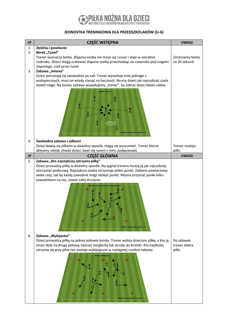 JEDNOSTKA TRENINGOWA DLA PRZEDSZKOLAKÓW (U-6) LP 1. 2. 3. 4. LP 5. 6. CZĘŚD WSTĘPNA Zbiórka i powitanie Berek „Tunel” Trener wyznacza berka. Złapana osoba nie może się ruszad i staje w szerokim rozkroku. Dzieci mogą uratowad złapane osoby przechodząc na czworaka pod nogami złapanego, czyli przez tunel. Zabawa „Imiona” Dzieci poruszają się swobodnie po sali. Trener wywołuje imię jednego z podopiecznych, musi on wtedy stanąd na bacznośd. Reszta dzieci jak najszybciej siada wokół niego. Na koniec zabawy wywołujemy „trener”, by zebrad dzieci blisko siebie. Swobodna zabawa z piłkami Dzieci bawią się piłkami w dowolny sposób, mogą się wyszumied. Trener bierze aktywny udział, chwali dzieci, bawi się razem z nimi, podpowiada. CZĘŚD GŁÓWNA UWAGI Zmieniamy berka co 30 sekund. Trener rozdaje piłki. UWAGI Zabawa „Kto najszybciej zatrzyma piłkę” Dzieci prowadzą piłkę w dowolny sposób. Na sygnał trenera muszą ją jak najszybciej zatrzymad podeszwą. Najszybsza osoba otrzymuje jeden punkt. Zadanie powtarzamy wiele razy, tak by każdy zawodnik mógł zdobyd punkt. Można przyznad punkt kilku zawodnikom na raz, nawet całej drużynie. Zabawa „Wybijanka” Dzieci prowadzą piłkę na jednej połowie boiska. Trener wybija dzieciom piłkę, a kto ją straci idzie na drugą połowę dwiczyd żonglerkę lub strzały do bramki. Kto najdłużej utrzyma się przy piłce ten zostaje wybijającym w następnej rundzie zabawy. Po zabawie trener zbiera piłki. 7. 8. 9. LP 10. 11. 12. 13. Starty z różnych pozycji Trener wyznacza linię początkową i koocową oraz pozycje startowe (stojąca, siad skrzyżny, leżenie itp.). Zadaniem dzieci jest jak najszybciej przebiec do linii koocowej. --- PRZERWA --- Ok. 1-2 minuty. Zabawa „Traf trenera” Dzieci prowadząc piłkę uderzają ją tak, by trafid uciekającego przed nimi trenera w nogi. Trener ustala ilośd punktów po której dzieci wygrywają zabawę (3-10 pkt.). Trener rozdaje piłki. Zabawa „Kto przebije więcej piłek” Dwa zespoły ustawione po przeciwnych stronach linii środkowej, której nie mogą przekraczad. Zadaniem dzieci jest przebijad (na początek kulając, potem nogą) piłki na drugą połowę. Punkt zdobywa drużyna, która ma mniej piłek na swojej połowie. Trener wyznacza czas rundy np. 60 sekund. CZĘŚD KOOCOWA UWAGI Gra 3 na 3 bez bramkarzy na ogromne bramki Gra dzięki której dzieci mogą zdobyd dużo bramek, co przynosi im wiele radości. Gra 3 na 3 z bramkarzami Zabawa „Minutka” Odmiana „10 sekund”. Dzieci kładą się na plecach, po sygnale trenera każdy liczy po cichu i próbuje odmierzyd 10 sekund, a następnie staje na bacznośd. Gdy wszystkie dzieci wstaną nagradzamy brawami osoby, która były najbliżej 10 sekund. Okrzyk drużynowy i pożegnanie WWW.PILKANOZNADLADZIECI.PL Trener mierzy czas na stoperze.