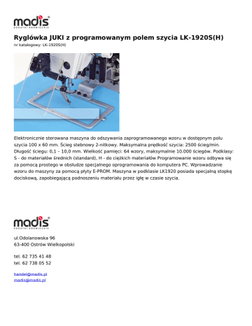 Ryglówka JUKI z programowanym polem szycia LK-1920S(H) nr katalogowy: LK-1920S(H) Elektronicznie sterowana maszyna do odszywania zaprogramowanego wzoru w dostępnym polu szycia 100 x 60 mm. Ścieg stebnowy 2-nitkowy. Maksymalna prędkość szycia: 2500 ścieg/min. Długość ściegu: 0,1 – 10,0 mm. Wielkość pamięci: 64 wzory, maksymalnie 10.000 ściegów. Podklasy: S - do materiałów średnich (standard), H - do ciężkich materiałów Programowanie wzoru odbywa się za pomocą prostego w obsłudze specjalnego oprogramowania do komputera PC. Wprowadzanie wzoru do maszyny za pomocą płyty E-PROM. Maszyna w podklasie LK1920 posiada specjalną stopkę dociskową, zapobiegającą podnoszeniu materiału przez igłę w czasie szycia. ul.Odolanowska 96 63-400 Ostrów Wielkopolski tel. 62 735 41 48 tel. 62 738 05 52 [email protected] [email protected]