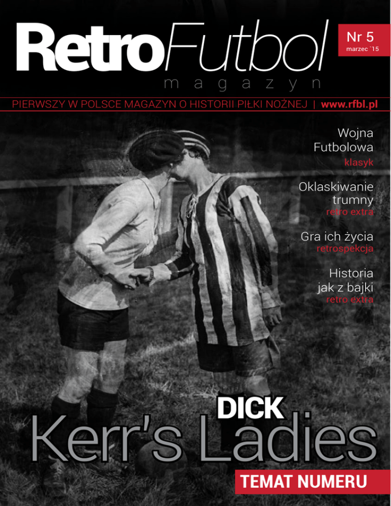RetroFutbol Nr 5 marzec `15 m a g a z y n pierwszy w polsce magazyn o historii piłki nożnej | www.rfbl.pl Wojna Futbolowa klasyk Oklaskiwanie trumny retro extra Gra ich życia retrospekcja Historia jak z bajki retro extra Dick Kerr’s Ladies TEMAT NUMERU Spis TREŚCI 03 07 12 19 24 28 33 kalendarium piłkarsko-historyczne 21 lutego – 31 marca Hubert Walko 47 48 56 61 70 trudnym okresem. Większość z nas nie zdążyła się jeszcze pogodzić ze stratą mistrza olimpijskiego 1972 czy mistrza Francji, niezwykle ciepłego, byłego bramkarza re- wojna futbolowa prezentacji Polski Mariana Szei, a już uderzyła Damian Bednarz w nas kolejna zła nowina. zppn czyli zanim powstał pzpn Piotr Grabowski oklaskiwanie trumny. kiedy umierasz za coś co kochasz Zmarł mistrz słowa, fenomenalny komentator sportowy, człowiek dzięki któremu już od zawsze tenis kojarzy mi się z jego słynnym Kamil Rogólski powitaniem „Halooo Łymbledon”. Ostatni ro- Lefter bohater z tureckiego Shangri-La mantyczny dziennikarz sportowy. W raz z nim Grzegorz Ignatowski umiera pewna epoka. Bohdan Tomaszewski ucieczka od spalonego BURZLIWA Andrzej Gomołysek historia pań z piłką 40 K oniec lutego dla polskiego kibica jest Paweł Klama trójkolorowa podwójna korona Patryk Idasiak Douglas DC-3 LAN Chile Flight 210 Foto nieugięty hajduk Jakub Budny Historia jak z bajki Kamil Kijanka na zawsze pozostanie herosem swojego fachu. W piątym numerze Retro Futbol, który moim zdaniem jest szczególnym, odniesiemy się do wielu ważnych w życiu człowieka wartości. Tworząc nową, świecką tradycję nie wymienię tekstów, godnych polecenia, ponieważ takich nie ma. Wszystkie są wyśmienite! Delikatnie przedłużony okres oczekiwania na nasz kolejny numer, zrekompensuje Wam niezwykła treść tego co zastaniecie. Na koniec ważna informacja: od teraz Retro Futbol będzie dostępne pierwszego dnia każdego miesiąca. gra ich życia Wsiadamy w futbolowy wehikuł czasu Paweł Wilamowski i startujemy! Mecze niespokojne 1919-1920... Część II Paweł Gaszyński RetroFutbol magazyn | str. 2 Miłej lektury! Damian Bednarz redaktor naczelny str. 3 | RetroFutbol magazyn kalendarium kalendarium piłkarsko-historyczne 21 lutego – 31 marca 21 lutego W 1893 Założono Argentyński Związek Piłki Nożnej (Asociación del Fútbol Argentino – AFA). Bayern Monachium 24-krotny mistrz Niemiec, zdobywca Ligi Mistrzów/Pucharu Europy: 1974, 1975, 1976, 2001, 2013, klubowy mistrz świata 2013 zydenta RP Krzyżem Komandorskim Orderu Odrodzenia Polski, w 2001 roku otrzymał Złoty Medal Zasługi dla FIFA (zm. 2006) 28 lutego W 1983 Widzew Łódź - Liverpool FC 2:0, 1/4 finału Pucharu Europy, stadion ŁKS; bramki: Miroslaw Tlokinski 48’, Wiesław Wraga 80’ 22 lutego W 1969 Urodził się Brian Laudrup, duński pomocnik/napastnik, mistrz Europy 1992, zdobywca Pucharu Konfederacji 1995 oraz Ligi Mistrzów 1994 z Milanem 24 lutego W 1910 Założono szwedzki klub Malmö FF – 18-krotny mistrz Szwecji 26 lutego W 1946 Urodził się Roman Jakóbczak, polski pomocnik, zdobywca trzeciego miejsca na mistrzostwach świata 1974 27 lutego W 1900 Założono klub piłkarski RetroFutbol magazyn | str. 4 W 1942 Urodził się Dino Zoff, włoski bramkarz, mistrz świata 1982 i wicemistrz świata 1970, mistrz Europy 1968 3 marca 2 marca W 1921 We Lwowie urodził się Kazimierz Górski, piłkarz, trener, selekcjoner reprezentacji Polski, z którą zdobył złoto na Olimpiadzie w 1972 i srebro w 1976 oraz III miejsce na mundialu 1974, pracował w greckich klubach, min. w Panathinaikosie Ateny i Olympiakosie Pireus, prezes PZPN, odznaczony przez Pre- W 1922 Urodził się Nándor Hidegkuti, węgierski napastnik, mistrz olimpijski 1952 i wicemistrz świata 1954 (zm. 2002) W 1924 Urodził się Ottmar Walter, niemiecki napastnik, mistrz świata 1954 (zm. 2013) W 1956 Urodził się Zbigniew Boniek, zdobywca III miejsca na Mundialu 1982, z Juventusem zdobył Puchar Mistrzów 1985, Puchar Zdobywców Pucharów 1984, Superpuchar Europy 1985 i m istrzostwo Włoch 1984, mistrz Polski 1981, 1982 z Widzewem 8 marca 13 marca W 1899 Założono klub piłkarski Eintracht Frankfurt; mistrz Niemiec 1959 i zdobywca pucharu UEFA 1980 4 marca W 1949 Urodził się Teófilo Cubillas, peruwiański p o m o c nik, jeden z najlepszych piłkarzy z Peru w historii W 1932 urodził się Edward Szymkowiak, bramkarz, mistrz Polski 1951 z Ruchem Chorzów, 1955, 1956 z Legią Warszawa, 1962 z Polonią Bytom (zm. 1990) W 1945 Założono klub piłkarski Crvena Zvezda Belgrad W 1951 Urodził się Kenny Dalglish, szkocki napastnik, zawodnik Celticu i Liverpoolu, zdobywca Pucharu Europy 1978, 1981, 1984, później pracował jako trener 5 marca W 1916 Założono hiszpański klub RCD Mallorca W 1948 Urodził się Jan van Beveren, holenderski bramkarz, zdobywca pucharu UEFA 1978 z PSV (zm. 2011) 6 marca W 1902 Założono klub Real Madryt; 10-krotny zdobywca Pucharu Europy/Ligi Mistrzów, Klubowy Mistrz Świata 2014, wielokrotny mistrz Hiszpanii i zdobywca krajowych pucharów 9 marca W 1908 Założono klub piłkarski Inter Mediolan; Klubowy mistrz świata 2010, zdobywca Ligi Mistrzów 1967, 1972, 1964, 1965, 2010, 18-krotny mistrz Włoch 10 marca W 1905 Założono londyński klub piłkarski Chelsea FC; klubowy mistrz świata 2012, zdobywca Ligi Mistrzów 2012, 4-krotny mistrz Anglii W 1971 Górnik Zabrze - Manchester City 2:0, PZP 1/4 finału w Chorzowie; bramki: Włodzimierz Lubański 34’, Erwin Wilczek 40’ W 1968 Górnik Zabrze - Manchester United 1:0, Puchar Europy, 1/4 finału; gol: Włodzimierz Lubański 72’ 14 marca W 1948 W swoim debiucie w piłkarskiej ekstraklasie Widzew Łódź pokonał Lecha Poznań 4:3 15 marca W 1892 John Houlding wraz z najbliższymi współpracownikami założyli klub Liverpool FC; klubowy mistrz świata 2005, zdobywca Ligi Mistrzów/ Pucharu Europy 1977, 1978, 1981, 1984, 2005 16 marca W 1996 Legia Warszawa - Panathinaikos Ateny 0:0, 1/4 finału Ligi 