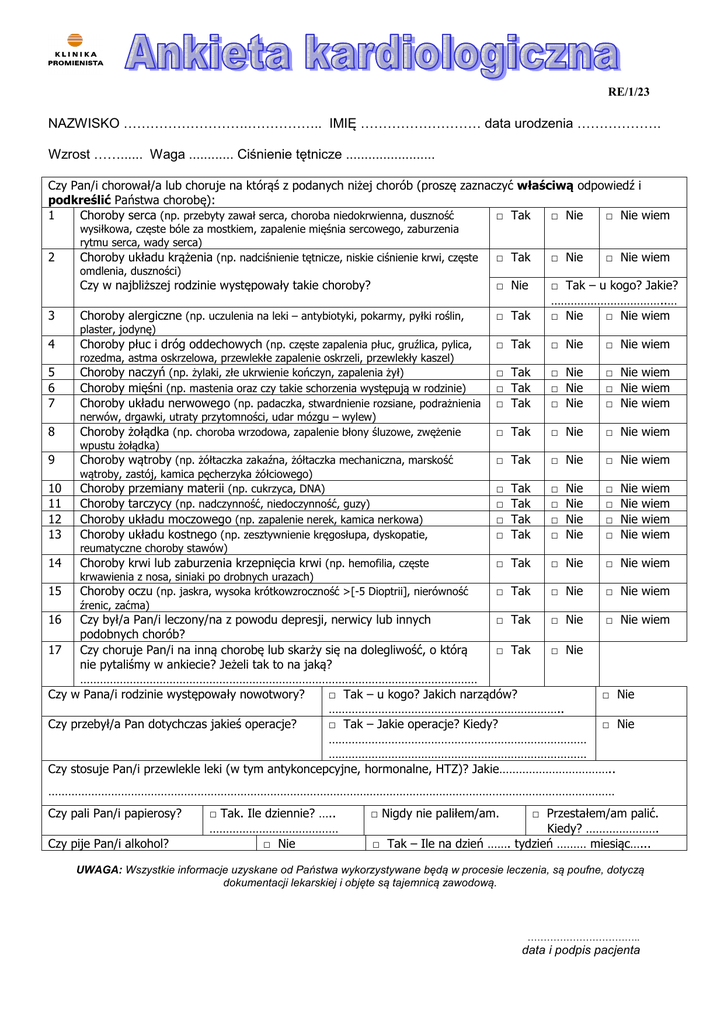 ankieta kardiologiczna - Klinika Promienista Poznań