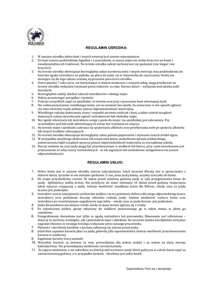 REGULAMIN OŚRODKA: 1. 2. 3. 4. 5. 6. 7. 8. 9. 10. 11. 12. 13. 14. W naszym ośrodku dobro koni i innych zwierząt jest zawsze najważniejsze. Do koni zawsze podchodzimy łagodnie i z szacunkiem, w naszej stajni nie wolno krzyczeć na konie i nieodpowiednio ich traktować. Na terenie ośrodka należy zachowywać się spokojnie (nie biegać i nie krzyczeć). Na terenie ośrodka obowiązuje bezwzględny zakaz karmienia koni i innych zwierząt oraz podchodzenia do koni bez zgody instruktora na padoku, na placu do jazdy czy w stanowisku do czyszczenia. Osoby nie stosujące się do tego zakazu zostaną wyproszone poza teren ośrodka. Dzieci poniżej 7 roku życia, nie korzystające w danym momencie z naszych usług. mogą przebywać na terenie ośrodka wyłącznie trzymane przez rodziców za rękę. Starsze dzieci – wyłącznie pod opieką osób dorosłych. Bezwzględnie należy słuchać zaleceń instruktorów i obsługi stajni. Należy przestrzegać porządku i czystości. Podczas wszystkich zajęć na ujeżdżalni i w terenie oraz przy czyszczeniu koni obowiązuje kask. Nie wolno pozostawiać osiodłanego konia ani na moment bez opieki. Za zniszczone w ten sposób ogłowie czy inne elementy rzędu jeździec ponosi odpowiedzialność materialną. Wszelkiego rodzaju skaleczenia, urazy i wypadki zarówno osób jak i koni, a także usterki urządzeń stajennych należy niezwłocznie zgłosić instruktorowi lub obsłudze stajni Bez zgody właściciela lub instruktora wstęp z psem do stajni i na ujeżdżalnię jest zabroniony. Psy uczestników jazd lub osób odwiedzających winny być trzymane na smyczy. Na terenie stajni i ujeżdżalni zabrania się spożywania alkoholu oraz przebywania osób po spożyciu alkoholu lub innych środków odurzających. Na terenie ośrodka obowiązuje bezwzględny zakaz palenia papierosów i używania innych źródeł ognia. W przypadku umyślnego okaleczenia lub oszpecenia konia, uszkodzenia sprzętu jeździeckiego, pomieszczenia bądź urządzeń sprawca ponosi odpowiedzialność materialną za wyrządzoną szkodę. Rzeczy osobiste na czas jazdy mogą być przechowywane w siodlarni lub biurze, przy czym niewskazane jest przynoszenie ze sobą rzeczy wartościowych - za ich zaginięcie lub uszkodzenie usługodawca nie ponosi odpowiedzialności. REGULAMIN USŁUG: Dobro konia jest w naszym ośrodku zawsze najważniejsze. Jeżeli życzenie Klienta stoi w sprzeczności z dobrem konia, życzenie to nie zostanie spełnione. U nas, poza jazdą konną, uczymy szacunku do konia. 2. Do stajni przychodzimy zawsze 30 minut przed ustaloną godziną jazdy w celu przygotowania konia do jazdy. Spóźnialscy jeżdżą krócej. Nie przybycie do stajni minimum 10 minut przed godziną rozpoczęcia lekcji oznacza rezygnację z jazdy. Istnieje możliwość osiodłania konia dla Klienta, wtedy cena za jazdę liczona jest podwójnie. 3. Instruktor ocenia umiejętności jeździeckie jeźdźca i na tej podstawie dobiera dla niego odpowiedniego konia, instruktora oraz podejmuje decyzję odnośnie rodzaju jazdy. Istnieje możliwość wyboru konia oraz instruktora po wcześniejszym uzgodnieniu tego faktu – wtedy cena za jazdę liczona jest podwójnie. 4. Jazda dwuosobowa ma miejsce wtedy, kiedy na dany termin zgłoszą się 2 osoby. 5. Po zakończonej jeździe sprzęt odnosimy do siodlarni pozostawiając go w takim stanie, w jakim go zastaliśmy. 6. Fotografowanie dozwolone jest tylko za zgodą instruktora lub pracownika, filmowanie jest zabronione – dotyczy to zarówno treningów, jak i pozostałych zajęć i obiektów. Na życzenie można nieodpłatnie otrzymać nagranie filmowe ze swojego treningu wykonane przez naszego pracownika. 7. Płatności i skreślenia koników z karnetu odbywają się zawsze przed jazdą. 8. Jeżeli ktoś zapomni karnetu płaci za jazdę gotówką (dla zapominalskich istnieje możliwość przechowywania karnetu w siodlarni). 9. Zagubione karnety tracą ważność. 10. Wszystkie karnety są imienne (a więc przewidziane dla jednej osoby) i są ważne na dany miesiąc kalendarzowy. Nie przewidujemy możliwości zwrotu karnetu. 11. Za zajęcia umówione, a nie odwołane na dzień przed terminem jazdy klient pokrywa w całości koszt zajęć za zarezerwowaną godzinę, a w przypadku karnetu - skreślany jest jeden konik. 1. Zapoznałam/-łem się i akceptuję: