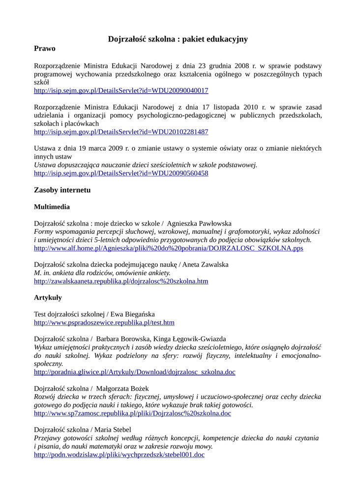 Dojrzałość szkolna : pakiet edukacyjny Prawo Rozporządzenie Ministra Edukacji Narodowej z dnia 23 grudnia 2008 r. w sprawie podstawy programowej wychowania przedszkolnego oraz kształcenia ogólnego w poszczególnych typach szkół http://isip.sejm.gov.pl/DetailsServlet?id=WDU20090040017 Rozporządzenie Ministra Edukacji Narodowej z dnia 17 listopada 2010 r. w sprawie zasad udzielania i organizacji pomocy psychologiczno-pedagogicznej w publicznych przedszkolach, szkołach i placówkach http://isip.sejm.gov.pl/DetailsServlet?id=WDU20102281487 Ustawa z dnia 19 marca 2009 r. o zmianie ustawy o systemie oświaty oraz o zmianie niektórych innych ustaw Ustawa dopuszczająca nauczanie dzieci sześcioletnich w szkole podstawowej. http://isip.sejm.gov.pl/DetailsServlet?id=WDU20090560458 Zasoby internetu Multimedia Dojrzałość szkolna : moje dziecko w szkole / Agnieszka Pawłowska Formy wspomagania percepcji słuchowej, wzrokowej, manualnej i grafomotoryki, wykaz zdolności i umiejętności dzieci 5-letnich odpowiednio przygotowanych do podjęcia obowiązków szkolnych. http://www.alf.home.pl/Agnieszka/pliki%20do%20pobrania/DOJRZALOSC_SZKOLNA.pps Dojrzałość szkolna dziecka podejmującego naukę / Aneta Zawalska M. in. ankieta dla rodziców, omówienie ankiety. http://zawalskaaneta.republika.pl/dojrzalosc%20szkolna.htm Artykuły Test dojrzałości szkolnej / Ewa Biegańska http://www.pspradoszewice.republika.pl/test.htm Dojrzałość szkolna / Barbara Borowska, Kinga Łęgowik-Gwiazda Wykaz umiejętności praktycznych i zasób wiedzy dziecka sześcioletniego, które osiągnęło dojrzałość do nauki szkolnej. Wykaz podzielony na sfery: rozwój fizyczny, intelektualny i emocjonalnospołeczny. http://poradnia.gliwice.pl/Artykuly/Download/dojrzalosc_szkolna.doc Dojrzałość szkolna / Małgorzata Bożek Rozwój dziecka w trzech sferach: fizycznej, umysłowej i uczuciowo-społecznej oraz cechy dziecka gotowego do podjęcia nauki i takiego, które wykazuje brak takiej gotowości. http://www.sp7zamosc.republika.pl/pliki/Dojrzalosc%20szkolna.doc Dojrzałość szkolna / Maria Stebel Przejawy gotowości szkolnej według różnych koncepcji, kompetencje dziecka do nauki czytania i pisania, do nauki matematyki oraz w zakresie rozwoju mowy. http://podn.wodzislaw.pl/pliki/wychprzedszk/stebel001.doc Dojrzałość szkolna dzieci / Helena Cisowska Rola wychowania przedszkolnego w osiąganiu dojrzałości szkolnej, zadania dla rodziców wspomagające rozwój kompetencji szkolnych, lista umiejętności dziecka rozpoczynającego naukę. http://www.awans.net/strony/wychowanie_przedszkolne/cisowska/cisowska1.html Dojrzałość szkolna dziecka 6 letniego / Urszula Żugaj Charakterystyka dziecka przygotowanego do nauki w szkole i jego umiejętności, czynniki i warunki mające wpływ na dojrzałość szkolną. http://www.przed.webd.pl/publikacje/p47.php Dojrzałość szkolna dziecka / Beata Grzelczak Charakterystyka dziecka dojrzałego pod względem fizycznym, umysłowym i emocjonalnospołecznym do podjęcia nauki w szkole, dojrzałość do czytania i pisania oraz nauki matematyki, lista różnych umiejętności, które powinno posiadać dziecko wstępujące do szkoły. http://www.psychologia.net.pl/artykul.php?level=223 Dojrzałość szkolna / Jolanta Maruszewska Rola rodziców w przygotowaniu dziecka do nauki szkolnej, sposoby wspomagania dziecka w osiąganiu dojrzałości w różnych sferach rozwoju. http://szkolnictwo.pl/index.php?id=PU5014 Dojrzałość szkolna gwarancją sukcesu szkolnego / Alina Mrozik Teoretyczne kryteria dojrzałości szkolnej, charakterystyka dojrzałości dziecka w sferze fizycznej, umysłowej, społecznej i emocjonalno-wolicjonalnej. http://www.kajet.pl/publikacje-43.html Metoda obserwacji skróconej i karta badania dojrzałości szkolnej dziecka 7-letniego / Marlena Bieńkowska http://www.nauczyciel.szm.com/nauczaniepoczatkowe/Bienkowskametoda.htm Dojrzałość szkolna Cechy dziecka gotowego do podjęcia nauki szkolnej, zestaw pytań o umiejętności i kompetencje dziecka wstępującego do szkoły. http://www.sosw.edu.lodz.pl/Programy/pro7dojrz.doc Dojrzałość szkolna warunkiem powodzenia w nauce Rozwój psychofizyczny dziecka gotowego do podjęcia nauki w szkole, czynniki mające wpływ na dojrzałość szkolną, wykaz umiejętności dziecka sześcioletniego. http://www.przedszkola.edu.pl/_publikacje06/DOJRZALOSC_SZKOLNA.doc O dojrzałości szkolnej dziecka / Beata Grzybowska Rozwój psychofizyczny dziecka rozpoczynającego naukę szkolną, zadania dla rodziców w zakresie kształtowania dojrzałości szkolnej. http://www.gimkorycin.com.pl/beata_grzybowska_O_%20dojrzalosci_%20ucznia.htm Diagnozowanie dojrzałości szkolnej – zbyteczność czy konieczność / Katarzyna DmitrukSierocińska Artykuł w czasopiśmie Aspekty 2004 nr 2: prezentacja wymagań stawianych dziecku rozpoczynającemu naukę w szkole, diagnozowanie dojrzałości szkolnej metodą studium indywidualnego przypadku, zestaw pytań do diagnozy gotowości szkolnej. http://www.bialystok.edu.pl/cen/archiwum/aspekty/aspekty_2_21_2004/art14.htm Dojrzałość szkolna i dojrzałość do nauki matematyki / Danuta Korycik http://www.profesor.pl/mat/na2/na2_dako_020103_2.php Dojrzałość szkolna uczniów klasy pierwszej / Elżbieta Piekarczyk Rozwój fizyczny i umysłowy pod kątem nauki czytania i pisania oraz matematyki, dojrzałość społeczna i emocjonalna, wskazania dla rodziców. http://www.sp32.lublin.pl/pliki/referaty/dojrzalosc_szkolna.pdf Gotowość czy dojrzałość szkolna? : kilka praktycznych i teoretycznych uwag / Małgorzata Chojak Warunki dojrzałości dziecka w różnych sferach, różnice w pojęciach gotowość szkolna i dojrzałość szkolna. http://images.nexto.pl/upload/wysiwyg/magazines/2009/raabe/public/wych_w_przedszk_200908_d emo.pdf Najważniejsze to dobrze zacząć : jak pomóc dziecku osiągnąć sukces szkolny? / Katarzyna Farbaniec Dojrzałość szkolna w różnych sferach, rola rodziców