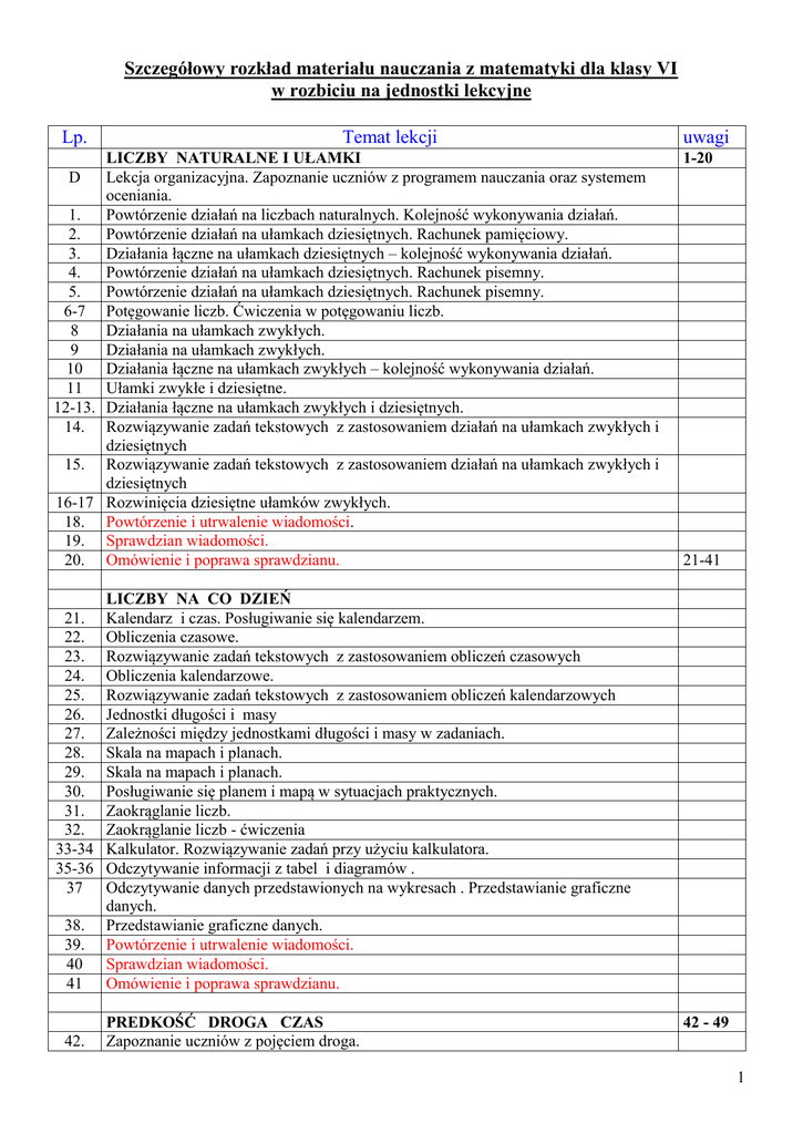 Szczegółowy rozkład materiału nauczania z matematyki dla klasy VI w rozbiciu na jednostki lekcyjne Lp. Temat lekcji LICZBY NATURALNE I UŁAMKI Lekcja organizacyjna. Zapoznanie uczniów z programem nauczania oraz systemem oceniania. 1. Powtórzenie działań na liczbach naturalnych. Kolejność wykonywania działań. 2. Powtórzenie działań na ułamkach dziesiętnych. Rachunek pamięciowy. 3. Działania łączne na ułamkach dziesiętnych – kolejność wykonywania działań. 4. Powtórzenie działań na ułamkach dziesiętnych. Rachunek pisemny. 5. Powtórzenie działań na ułamkach dziesiętnych. Rachunek pisemny. 6-7 Potęgowanie liczb. Ćwiczenia w potęgowaniu liczb. 8 Działania na ułamkach zwykłych. 9 Działania na ułamkach zwykłych. 10 Działania łączne na ułamkach zwykłych – kolejność wykonywania działań. 11 Ułamki zwykłe i dziesiętne. 12-13. Działania łączne na ułamkach zwykłych i dziesiętnych. 14. Rozwiązywanie zadań tekstowych z zastosowaniem działań na ułamkach zwykłych i dziesiętnych 15. Rozwiązywanie zadań tekstowych z zastosowaniem działań na ułamkach zwykłych i dziesiętnych 16-17 Rozwinięcia dziesiętne ułamków zwykłych. 18. Powtórzenie i utrwalenie wiadomości. 19. Sprawdzian wiadomości. 20. Omówienie i poprawa sprawdzianu. uwagi 1-20 D 38. 39. 40 41 LICZBY NA CO DZIEŃ Kalendarz i czas. Posługiwanie się kalendarzem. Obliczenia czasowe. Rozwiązywanie zadań tekstowych z zastosowaniem obliczeń czasowych Obliczenia kalendarzowe. Rozwiązywanie zadań tekstowych z zastosowaniem obliczeń kalendarzowych Jednostki długości i masy Zależności między jednostkami długości i masy w zadaniach. Skala na mapach i planach. Skala na mapach i planach. Posługiwanie się planem i mapą w sytuacjach praktycznych. Zaokrąglanie liczb. Zaokrąglanie liczb - ćwiczenia Kalkulator. Rozwiązywanie zadań przy użyciu kalkulatora. Odczytywanie informacji z tabel i diagramów . Odczytywanie danych przedstawionych na wykresach . Przedstawianie graficzne danych. Przedstawianie graficzne danych. Powtórzenie i utrwalenie wiadomości. Sprawdzian wiadomości. Omówienie i poprawa sprawdzianu. 42. PREDKOŚĆ DROGA CZAS Zapoznanie uczniów z pojęciem droga. 21. 22. 23. 24. 25. 26. 27. 28. 29. 30. 31. 32. 33-34 35-36 37 21-41 42 - 49 1 43. 44. 45 46. 47 48. 49. Zapoznanie uczniów z pojęciem prędkość. Zapoznanie uczniów z pojęciem czas. Rozwiązywanie zadań praktycznych z zastosowaniem pojęć prędkość - droga- czas. Rozwiązywanie zadań praktycznych z zastosowaniem pojęć prędkość - droga- czas. Rozwiązywanie zadań praktycznych z zastosowaniem pojęć prędkość - droga- czas. Sprawdzian wiadomości. Omówienie i poprawa sprawdzianu. FIGURY NA PŁASZCZYŹNIE Proste, odcinki, okręgi , koła – przypomnienie podstawowych pojęć geometrii Proste, odcinki, okręgi , koła – ćwiczenia Kąty. Przypomnienie rodzajów kątów w zależności od miary. Kąty wierzchołkowe, przyległe, naprzemianlegle, odpowiadające. Rozwiązywanie zadań z wykorzystaniem własności kątów. Wielokąty – przypomnienie pojęć przekątna, obwód Trójkąty. Przypomnienie własności trójkątów. Czworokąty. Przypomnienie własności czworokątów. Rozwiązywanie zadań z wykorzystaniem własności czworokątów. Kąty w trójkątach i czworokątach Kąty w trójkątach i czworokątach- ćwiczenia Konstrukcje geometryczne – przenoszenie odcinków, dodawanie i odejmowanie odcinków. 62 Podział odcinka na połowy. Wyznaczenie środka odcinka. Konstrukcje prostych prostopadłych. 63 Konstrukcje geometryczne – przenoszenie kątów, dodawanie i odejmowanie kątów. 64. Konstrukcje kątów 300, 450, 600,900, 1200, 2700. 65. Konstrukcje trójkątów. Nierówność trójkąta. 66. Konstrukcje różnych trójkątów i czworokątów. 67-68 Konstrukcje geometryczne – zadania różne. 69. Powtórzenie i utrwalenie wiadomości. 70. Sprawdzian wiadomości. 71. Omówienie i poprawa sprawdzianu. 50-71 50. 51. 52. 53. 54. 55. 56. 57. 58. 59. 60. 61. 72. 73. 74. 75. 76. 77. 78. 79. 80. 81. 82. 83. 84. 85. POLA WIELOKĄTÓW Przypomnienie sposobu obliczania pola prostokąta. Zależności między jednostkami pola. Zależności między jednostkami pola. Przypomnienie sposobu obliczania pól trójkąta, równoległoboku, rombu, trapezu. Obliczanie pól figur płaskich z zastosowaniem wzorów na pola figur Obliczanie pól figur płaskich Obliczanie pól figur płaskich w sytuacjach praktycznych z zastosowaniem wzorów na pola wielokątów. Obliczanie pól figur płaskich w sytuacjach praktycznych z zastosowaniem wzorów na pola wielokątów. Obliczanie pól figur płaskich w sytuacjach praktycznych z zastosowaniem wzorów na pola wielokątów. Obliczanie pól różnych wielokątów Obliczanie pól różnych wielokątów Powtórzenie i utrwalenie wiadomości. Sprawdzian wiadomości. Omówienie i poprawa sprawdzianu. 72-85 2 LICZBY WYMIERNE 86-99 86 Liczby dodatnie i ujemne 87. Zaznaczanie liczb dodatnich i ujemnych na osi liczbowej. 88. Porównywanie liczb wymiernych. 89-91 Dodawanie i odejmowanie liczb wymiernych 92-93 Mnożenie i dzielenie liczb wymiernych. 94-95 Działania łączne na liczbach wymiernych. 96. Rozwiązywanie zadań tekstowych prowadzących do obliczeń na liczbach wymiernych. 97 Powtórzenie i utrwalenie wiadomości. 98 Sprawdzian wiadomości. 99 Omówienie i poprawa sprawdzianu. 100-118 WYRAZENIA ALGEBRAICZNE RÓWNANIA I NIERÓWNOŚCI 100 Czytanie i zapisywanie wyrażeń algebraicznych. 101 Czytanie i zapisywanie wyrażeń algebraicznych. 102 Obliczanie wartości wyrażeń algebraicznych. 103 Obliczanie wartości wyrażeń algebraicznych. 104 Sumy algebraiczne. Redukcja wyrazów podobnych. 105 Sumy algebraiczne. Redukcja wyrazów podobnych. 106 Mnożenie i dzielenie wyrażeń algebraicznych przez liczby. 107 Mnożenie i dzielenie wyrażeń algebraicznych przez liczby. 108 Zapisywanie równań. Liczba spełniająca równanie. 109 Zapisyw