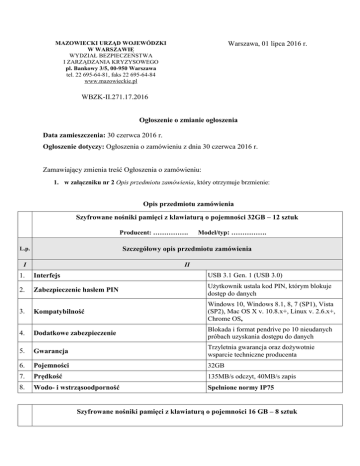 MAZOWIECKI URZĄD WOJEWÓDZKI W WARSZAWIE WYDZIAŁ BEZPIECZEŃSTWA I ZARZĄDZANIA KRYZYSOWEGO pl. Bankowy 3/5, 00-950 Warszawa tel. 22 695-64-81, faks 22 695-64-84 www.mazowieckie.pl Warszawa, 01 lipca 2016 r. WBZK-II.271.17.2016 Ogłoszenie o zmianie ogłoszenia Data zamieszczenia: 30 czerwca 2016 r. Ogłoszenie dotyczy: Ogłoszenia o zamówieniu z dnia 30 czerwca 2016 r. Zamawiający zmienia treść Ogłoszenia o zamówieniu: 1. w załączniku nr 2 Opis przedmiotu zamówienia, który otrzymuje brzmienie: Opis przedmiotu zamówienia Szyfrowane nośniki pamięci z klawiaturą o pojemności 32GB – 12 sztuk Producent: ……………. Model/typ: ……………. L.p. Szczegółowy opis przedmiotu zamówienia I II 1. Interfejs USB 3.1 Gen. 1 (USB 3.0) 2. Zabezpieczenie hasłem PIN Użytkownik ustala kod PIN, którym blokuje dostęp do danych 3. Kompatybilność Windows 10, Windows 8.1, 8, 7 (SP1), Vista (SP2), Mac OS X v. 10.8.x+, Linux v. 2.6.x+, Chrome OS, 4. Dodatkowe zabezpieczenie Blokada i format pendrive po 10 nieudanych próbach uzyskania dostępu do danych 5. Gwarancja Trzyletnia gwarancja oraz dożywotnie wsparcie techniczne producenta 6. Pojemności 32GB 7. Prędkość 135MB/s odczyt, 40MB/s zapis 8. Wodo- i wstrząsoodporność Spełnione normy IP75 Szyfrowane nośniki pamięci z klawiaturą o pojemności 16 GB – 8 sztuk Producent: ……………. Model/typ: ……………. L.p. Szczegółowy opis przedmiotu zamówienia I II 1. Interfejs USB 3.1 Gen. 1 (USB 3.0) 2. Zabezpieczenie hasłem PIN Użytkownik ustala kod PIN, którym blokuje dostęp do danych 3. Kompatybilność Windows 10, Windows 8.1, 8, 7 (SP1), Vista (SP2), Mac OS X v. 10.8.x+, Linux v. 2.6.x+, Chrome OS, 4. Dodatkowe zabezpieczenie Blokada i format pendrive po 10 nieudanych próbach uzyskania dostępu do danych 5. Gwarancja Co najmniej trzyletnia gwarancja oraz dożywotnie wsparcie techniczne producenta 6. Pojemności 16GB 7. Prędkość 120MB/s odczyt, 20MB/s zapis 8. Wodo- i wstrząsoodporność Spełnione normy IP75 Szyfrowany dysk zewnętrzny SSD o pojemności 256 GB – 10 sztuk Producent: ……………. Model/typ: ……………. L.p. Szczegółowy opis przedmiotu zamówienia I II 1. Pojemność Co najmniej 250 GB 2. Dysk Typu SSD wykonany w technologii MLC, 3. Złącze USB 3.0, 4. Czytnik kart Karty RFID z obsługą do 3 kart RFID (co najmniej jedna karta w komplecie z urządzeniem) 5. Szyfrowanie AES 256-bit 6. Ekran LCD umożliwia podawanie hasła bezpośrednio na urządzeniu 7. Dodatkowe funkcje • możliwe ustawienie samozniszczenia danych w przypadku próby złamania kodu, • obudowa z zabezpieczeniem przed otwarciem 8. • zgodność z systemami Windows 7 - 10, MAC OSX 10.x, Zgodność • zgodność z interfejsami USB 2.0 i USB 3.0. • zgodność z FIPS 140-2 9. dysk wielkości 2,5”, maksymalna waga 500 gram. Wymiary 10. Gwarancja Co najmniej trzyletnia gwarancja Dyski zewnętrzne SSD o pojemności 1 TB – 2 sztuki Producent: ……………. Model/typ: ……………. L.p. Szczegółowy opis przedmiotu zamówienia I II 1. Pojemność Co najmniej 1 TB 2. Dysk Typu SSD 3. Złącze USB 3.0 lub 3.1 4. Odczyt i zapis Szybkość co najmniej 450 MB/s. 5. Szyfrowanie AES 256-bit Zgodność • zgodność z systemami Windows 7 - 10, MAC OSX 10.x, 6. • zgodność z interfejsami USB 2.0 i USB 3.0. 7. Wymiary dysk wielkości 2,5”, maksymalna waga 60 gram. 8. Gwarancja Co najmniej trzyletnia gwarancja Dysk zewnętrzny (do systemów monitoringu przemysłowego) – 5 sztuki Producent: ……………. Model/typ: ……………. L.p. Szczegółowy opis przedmiotu zamówienia I II 1. Interfejs SATA 6Gb/s 2. Szybkość obrotowa InteliPower 3. Wielkość bufora 64MB 4. Ilość cykli startu powyżej 300.000 5. Szybkość transmisji 6 Gb/s 6. Pojemność 2TB 7. Wielkość 3.5" 8. Pobór mocy do 4.4 W 9. Zasilanie SATA 10. Złącze SATA 11. Zapis danych [MB/s] 145 12. Odczyt danych [MB/s]: 145 2. Jednocześnie informuję, że Zamawiający nie przedłuża terminu składania ofert Dyrektor Wydziału Bezpieczeństwa i Zarządzania Kryzysowego /-/ Krzysztof Dąbrowski