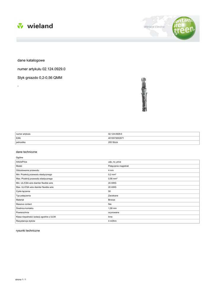 dane katalogowe numer artykułu 02.124.0929.0 Styk gniazdo 0,2-0,56 QMM - numer artykułu 02.124.0929.0 EAN 4015573053571 jednostka 200 Stück dane techniczne Ogólne ArticlePrice udp_no_price Model Połączenie magistrali Odizolowanie przewodu 4 mm Min. Przekrój przewodu elastycznego 0,2 mm² Max. Przekrój przewodu elastycznego 0,56 mm² Min. UL/CSA wire diamter flexible wire 24 AWG Max. UL/CSA wire diamter flexible wire 20 AWG Cykle łączenia 50 Typ połączenia Zaciskane Materiał Bronze Massive contact Nie Średnica kontaktu 1,58 mm Powierzchnia ocynowane Klasa niepalności izolacji zgodnie z UL94 Inne Rezystancja styków 4 mOhm rysunki techniczne strona 1 / 1