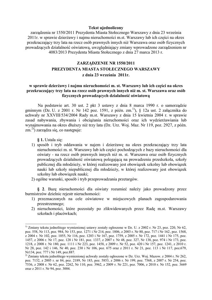 Tekst ujednolicony zarządzenia nr 1550/2011 Prezydenta Miasta Stołecznego Warszawy z dnia 23 września 2011r. w sprawie dzierżawy i najmu nieruchomości m.st. Warszawy lub ich części na okres przekraczający trzy lata na rzecz osób prawnych innych niż Warszawa oraz osób fizycznych prowadzących działalność oświatową, uwzględniający zmiany wprowadzone zarządzeniem nr 4083/2013 Prezydenta Miasta Stołecznego z dnia 27 marca 2013 r. ZARZĄDZENIE NR 1550/2011 PREZYDENTA MIASTA STOŁECZNEGO WARSZAWY z dnia 23 września 2011r. w sprawie dzierżawy i najmu nieruchomości m. st. Warszawy lub ich części na okres przekraczający trzy lata na rzecz osób prawnych innych niż m. st. Warszawa oraz osób fizycznych prowadzących działalność oświatową Na podstawie art. 30 ust. 2 pkt 3 ustawy z dnia 8 marca 1990 r. o samorządzie gminnym (Dz. U. z 2001 r. Nr 142 poz. 1591, z późn. zm.1)), § 12a ust. 2 załącznika do uchwały nr XXVIII/534/2004 Rady m.st. Warszawy z dnia 15 kwietnia 2004 r. w sprawie zasad nabywania, zbywania i obciążania nieruchomości oraz ich wydzierżawiania lub wynajmowania na okres dłuższy niż trzy lata (Dz. Urz. Woj. Maz. Nr 119, poz. 2927, z późn. zm.2)) zarządza się, co następuje: § 1. Ustala się: 1) sposób i tryb oddawania w najem i dzierżawę na okres przekraczający trzy lata nieruchomości m. st. Warszawy lub ich części pochodzących z bazy nieruchomości dla oświaty - na rzecz osób prawnych innych niż m. st. Warszawa oraz osób fizycznych prowadzących działalność oświatową polegającą na prowadzeniu przedszkola, szkoły publicznej dla młodzieży, w której realizowany jest obowiązek szkolny lub obowiązek nauki lub szkoły niepublicznej dla młodzieży, w której realizowany jest obowiązek szkolny lub obowiązek nauki; 2) ogólne warunki, sposób i tryb przeprowadzania przetargów. § 2. Bazę nieruchomości dla oświaty rozumieć należy jako prowadzony przez burmistrzów dzielnic rejestr nieruchomości: 1) przeznaczonych na cele oświatowe w miejscowych planach zagospodarowania przestrzennego; 2) nieruchomości, które pozostały po zlikwidowanych przez Radę m.st. Warszawy szkołach i placówkach; 1) Zmiany tekstu jednolitego wymienionej ustawy zostały ogłoszone w Dz. U. z 2002 r. Nr 23, poz. 220, Nr 62, poz. 558, Nr 113, poz. 984, Nr 153, poz. 1271 i Nr 214, poz. 1806, z 2003 r. Nr 80, poz. 717 i Nr 162, poz. 1568, z 2004 r. Nr 102, poz. 1055, Nr 116, poz. 1203 i Nr 167, poz. 1759, z 2005 r. Nr 172, poz. 1441 i Nr 175, poz. 1457, z 2006 r. Nr 17, poz. 128 i Nr 181, poz. 1337, z 2007 r. Nr 48, poz. 327, Nr 138, poz. 974 i Nr 173, poz. 1218, z 2008 r. Nr 180, poz. 1111 i Nr 223, poz. 1458, z 2009 r. Nr 52, poz. 420 i Nr 157, poz. 1241, z 2010 r. Nr 28, poz. 142 i 146, Nr 40, poz. 230 i Nr 106, poz. 675 oraz z 2011 r. Nr 21, poz. 113 i Nr 117, poz.679, Nr134, poz. 777 i Nr 149, poz.887. 2) Zmiany tekstu jednolitego wymienionej uchwały zostały ogłoszone w Dz. Urz. Woj. Mazow. z 2004 r. Nr 262, poz. 7132, z 2005 r. nr 84, poz. 2189, Nr 183, poz. 5853, z 2006 r. Nr 199, poz. 7568, z 2007 r. Nr 254, poz. 7536, z 2008 r. Nr 62, poz. 2262, Nr 110, poz. 3962, z 2009 r. Nr 221, poz. 7006, z 2010 r. Nr 152, poz. 3669 oraz z 2011 r. Nr 94, poz. 3004. 3) nieruchomości wskazanych przez burmistrzów dzielnic m. st. Warszawy spośród nieruchomości pozostających w ich zarządzie i administrowaniu: a) stanowiące własność m.st. Warszawy, dla których uzyskano ostateczne decyzje komunalizacyjne, b) nabyte na własność m. st. Warszawy w inny sposób niż określony w lit. a. § 3.1. Nieruchomości m. st. Warszawy wydzierżawia się lub wynajmuje w drodze przetargu ograniczonego pisemnego, ogłoszonego i przeprowadzonego zgodnie z obowiązującymi przepisami prawa oraz na podstawie regulaminu, o którym mowa w § 6 ust.1 zarządzenia, z wyjątkiem przypadku określonego w § 12ba uchwały nr XXVIII/534/2004 Rady m. st. Warszawy w sprawie zasad nabywania, zbywania i obciążania nieruchomości oraz ich wydzierżawiania lub wynajmowania na okres dłuższy niż trzy lata (Dz. Urz. Woj. Maz. Nr 119, poz. 2927, z późn. zm.2)), w którym ma zastosowanie tryb negocjacji. 2. Nieruchomość m. st. Warszawy lub jej część, przeznaczoną do najmu lub dzierżawy na okres przekraczający trzy lata przygotowuje odpowiedni wydział w urzędzie dzielnicy Urzędu m. st. Warszawy właściwy ze względu na miejsce położenia nieruchomości lub Zakład Gospodarowania Nieruchomościami w dzielnicy m. st. Warszawy. 3. Przygotowanie nieruchomości m. st. Warszawy lub jej części przeznaczonej do oddania w najem lub dzierżawę obejmuje w szczególności wykonanie następujących czynności: 1) zbadanie stanu prawnego nieruchomości w szczególności co do roszczeń, toczących się postępowań administracyjnych i sądowych; 2) uzyskanie opinii Biura Architektury i Planowania Przestrzennego Urzędu m.st. Warszawy dotyczących możliwego wykorzystania terenu, a w razie potrzeby opinii Wojewódzkiego Konserwatora Zabytków i Wojewódzkiego Konserwatora Przyrody; 3) określenie powierzchni terenu do oddania w najem lub dzierżawę wraz z zaznaczeniem go na podkładzie geodezyjnym terenu; 4) przeprowadzenie wizji lokalnej. 4. Z czynności wymienionych w ust. 3 sporządza się pisemne protokoły, podlegające włączeniu do akt. 5. Wydział w urzędzie dzielnicy Urzędu m. st. Warszawy odpowiedni ze względu na zakres prowadzonych spraw lub Zakład Gospodarowania Nieruchomościami w dzielnicy m. st. Warszawy przygotowuje wykaz nieruchomości m. st. Warszawy lub ich części, przeznaczonych do oddania w najem lub dzierżawę w trybie przetargu ograniczonego, zgodnie z art. 35 ust. 2 ustawy z dnia 21 sierpnia 1997 r. o gospodarce nieruchomościami (Dz. U. z 2010 r. Nr 102, poz. 651, z późn. zm.). 6. Wykaz nieruchomości lub ich części przeznaczonych do oddania w najem lub dzierżawę zatwierdza burmistrz dzielnicy m. st. Warszawy lub inna oso