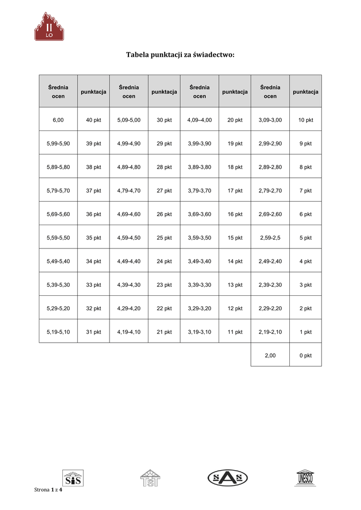 Tabela punktacji za świadectwo: Średnia ocen punktacja Średnia ocen punktacja Średnia ocen punktacja Średnia ocen punktacja 6,00 40 pkt 5,09-5,00 30 pkt 4,09–4,00 20 pkt 3,09-3,00 10 pkt 5,99-5,90 39 pkt 4,99-4,90 29 pkt 3,99-3,90 19 pkt 2,99-2,90 9 pkt 5,89-5,80 38 pkt 4,89-4,80 28 pkt 3,89-3,80 18 pkt 2,89-2,80 8 pkt 5,79-5,70 37 pkt 4,79-4,70 27 pkt 3,79-3,70 17 pkt 2,79-2,70 7 pkt 5,69-5,60 36 pkt 4,69-4,60 26 pkt 3,69-3,60 16 pkt 2,69-2,60 6 pkt 5,59-5,50 35 pkt 4,59-4,50 25 pkt 3,59-3,50 15 pkt 2,59-2,5 5 pkt 5,49-5,40 34 pkt 4,49-4,40 24 pkt 3,49-3,40 14 pkt 2,49-2,40 4 pkt 5,39-5,30 33 pkt 4,39-4,30 23 pkt 3,39-3,30 13 pkt 2,39-2,30 3 pkt 5,29-5,20 32 pkt 4,29-4,20 22 pkt 3,29-3,20 12 pkt 2,29-2,20 2 pkt 5,19-5,10 31 pkt 4,19-4,10 21 pkt 3,19-3,10 11 pkt 2,19-2,10 1 pkt 2,00 0 pkt Strona 1 z 4 Wykaz zawodów wiedzy, artystycznych i sportowych, organizowanych przez kuratora oświaty lub inne podmioty działające na terenie szkoły, które mogą być wymienione na świadectwie ukończenia szkoły podstawowej oraz miejsc uznanych za wysokie w tych zawodach w roku szkolnym 2015/16 w województwie dolnośląskim. Wraz z punktacją w tabeli – punkty od I do IV (Załącznik nr 1 do Zarządzenia Dolnośląskiego Kuratora Oświaty Nr 5 z dnia 26 lutego 2016 r.) I. Zawody wiedzy będące konkursem o zasięgu ponadwojewódzkim organizowanym przez kuratorów oświaty na podstawie zawartych porozumień: Lp. Nazwa konkursu 1. Ogólnopolski Konkurs historyczny im. majora Marka Gajewskiego „Losy żołnierza i dzieje oręża polskiego” Organizator Zasięg Małopolski Kurator Oświaty w porozumieniu krajowy z Dolnośląskim Kuratorem Oświaty Edycja 2013/14 2014/15 2015/16 Tytuł laureaci finaliści Punktacja Laureaci przyjmowani są poza kolejnością, Finaliści – 7 pkt II. Konkursy przedmiotowe organizowane przez Dolnośląskiego Kuratora Oświaty dla uczniów szkół podstawowych: Lp. Nazwa konkursu 1. Konkurs „zDolny Ślązaczek” 2013/14 2. Konkurs „zDolny Ślązaczek” cześć polonistyczna 2014/15 3. Konkurs „zDolny Ślązaczek” cześć matematyczna 4. Konkurs „zDolny Ślązaczek” język angielski 5. Konkurs „zDolny Ślązaczek” język niemiecki Strona 2 z 4 Zasięg wojewódzki Edycja 2015/16 Tytuł Laureaci finaliści Punktacja Laureaci przyjmowani są poza kolejnością, Finaliści – 7 pkt 2015/16 III. Konkursy wiedzy i artystyczne dla uczniów szkół podstawowych przez Dolnośląskiego Kuratora Oświaty i inne podmioty działające na terenie szkoły: Lp. Nazwa konkursu Organizator 1. Międzynarodowy Konkurs Kreatywności Odyseja Umysłu Odyssey of the Mind Polska 2. Ogólnopolski konkurs „Ojczyzna Polszczyzna” Stowarzyszenie Ojczyzny Polszczyzny 3. Ogólnopolski Festiwal Obrazu Technikum nr 15 im. Marii SkłodowskiejCurie we Wrocławiu 4. Konkurs Historyczny „Losy Polaków na Wschodzie w latach 1939 – 1956”. Dolnośląski Kurator Oświaty Edycja Tytuł 2015/16 laureaci krajowy 2013/14 2014/15 2015/16 laureaci finaliści* 3 pkt krajowy 2015/16 miejsca: 1-3 3 pkt wojewódzki 2013/14 2014/15 2015/16 laureaci 2 pkt 5. Szkoła Podstawowa nr 17 we Wrocławiu, Konkurs Historyczny Gimnazjum nr 14 „Od Solidarności do Trzeciej we Wrocławiu, Liceum Rzeczpospolitej”. Ogólnokształcące nr XIII we Wrocławiu wojewódzki 2013/14 2014/15 2015/16 miejsca: 1-3 2 pkt 6. Konkurs Historyczny „Znam historię polskich symboli narodowych”, Szkoła Podstawowa Nr 93 im. Tradycji Orła Białego we Wrocławiu wojewódzki 2015/16 miejsca: 1-3 2 pkt 7. X Dolnośląski Przegląd Pieśni i Piosenki Patriotycznej Dolnośląski Kurator Oświaty wojewódzki 2015/16 laureaci 2 pkt 8. Konkursy wiedzy i artystyczne Konkurs Być Kimś 1 Disce Puer Junior, Mały Poliglota, Kangur, Fox) 2015/16 laureaci; finaliści, miejsca: 1-3 Podmioty działające na terenie szkół Zasięg międzynarodowy krajowy powiatowy *) finaliści etapu krajowego rozumiani jako laureaci etapu wojewódzkiego Strona 3 z 4 Punktacja 4 pkt 3 pkt laureaci 1 pkt, finaliści – 0,5 pkt IV. Zawody sportowe organizowane przez inne podmioty działające na terenie szkoły: Lp. Organizator 1. Zawody sportowe organizowane przez światowe i europejskie federacje sportowe 2. Zawody sportowe organizowane przez polskie związki sportowe 3. 4. Zawody sportowe organizowane przez Szkolny Związek Sportowy Zawody sportowe organizowane przez jednostki samorządu terytorialnego i gminne związki sportowe Strona 4 z 4 Dyscypliny Zasięg Zawody indywidualne Międzyi zespołowe: aerobik, akrobatyka narodowy sportowa, badminton, biathlon, bieg na orientację, bieg przełajowy, gimnastyka, hokej, jeździectwo, judo, kajakarstwo, krajowy karate, kolarstwo, kręglarstwo, wojewódzki lekkoatletyka, łucznictwo, łyżwiarstwo, mini koszykówka, mini piłka nożna, mini piłka ręczna, mini piłka siatkowa, piłka siatkowa plażowa, narciarstwo, wojewódzki pływanie, pływanie synchroniczne, skoki do wody, snowboard, sporty motorowe, sporty saneczkowe, sporty wrotkarskie, strzelectwo sportowe, szachy, szermierka, taekwondo, taniec sportowy, tenis, powiatowy tenis stołowy, unihokej, wioślarstwo, zapasy, żeglarstwo. Tytuł miejsca: 1-10 miejsca: 1-5 1-3 Punktacja 4 pkt Krajowy: 3 pkt wojewódzki: - 2 pkt miejsca: 1-3 2 pkt miejsca: 1-3 1 pkt