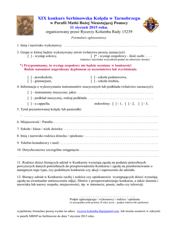 XIX konkurs Serbinowska Kolęda w Tarnobrzegu w Parafii Matki Bożej Nieustającej Pomocy 11 styczeń 2015 roku. organizowany przez Rycerzy Kolumba Rady 15239 Formularz zgłoszeniowy 1. Imię i nazwisko wykonawcy . . . . . . . . . . . . . . . . . . . . . . . . . . . . . . . . . . . . . . . . . . . . . . . . . . . . 3. Grupa w której będzie wykonywany utwór (właściwe proszę zaznaczyć): [ ] - występ solowy, [ ]* - występ zespołowy - ilość osób: . . . . (imiona i nazwiska wszystkich podać na odwrocie strony) *) Przypominamy, że występ zespołowy nie będzie oceniany w konkursie! Bedzie natomiast nagrodzony dyplomem za uczestnictwo lub wyróżnienie. [ ] - przedszkole, [ ] - gimnazjum, [ ] - szkoła podstawowa, [ ] - szkoła średnia, 4. Informacja o wykorzystaniu instrumentów muzycznych lub podkładu (właściwe zaznaczyć): [ ] - instrumenty muzyczne, jakie . . . . . . . . . . . . . . . . . . . . . . . . . . . . . . . . . . . . . . . . . . . [ ] - podkład muzyczny, rodzaj podkładu . . . . . . . . . . . . . . . . . . . . . . . . . . . . . . . . . . . . . [ ] - a cappella, mikrofony: [ ] - 1, [ ] - 2, [ ] - 3, 5. Tytuł prezentowanej kolędy lub pastorałki: – ........................................................................... 6. Miejscowość / Parafia: . . . . . . . . . . . . . . . . . . . . . . . . . . . . . . . . . . . . . . . . . . . . . . . . . . . . . . . . . . 7. Szkoła / klasa / wiek dziecka: . . . . . . . . . . . . . . . . . . . . . . . . . . . . . . . . . . . . . . . . . . . . . . . . . . . . . 8. Imię i nazwisko rodzica dziecka / opiekuna : . . . . . . . . . . . . . . . . . . . . . . . . . . . . . . . . . . . . . . . . . 9. Telefon kontaktowy i mail: . . . . . . . . . . . . . . . . . . . . . . . . . . . . . . . . . . . . . . . . . . . . . . . . . . . . . . . 10. Dotychczasowe szczególne osiągnięcia: . . . . . . . . . . . . . . . . . . . . . . . . . . . . . . . . . . . . . . . . . . . . ............................................................................... 11. Rodzice dzieci biorących udział w Konkursie wyrażają zgodę na podanie potrzebnych powyższych danych potrzebnych do przeprowadzenia Konkursu i zgodę na poinformowanie o następnym tego typu, czy podobnym konkursie czy akcji i zaproszenie do udziału. 12. Biorący udział w Konkursie osoby i rodzice czy opiekunowie występujących dzieci wyrażają zgodę na ewentualne umieszczenie zdjęć, filmów z przeprowadzonego konkursu, a także imienia i nazwiska lub nazwy zespołu, miejscowości, itp. w internecie, prasie, radiu czy telewizji. ............................... Podpis zgłaszającego / wykonawcy / rodzica / opiekuna (w przypadku osób poniżej 18 roku życia – podpis rodzica lub opiekuna) wypełniony formularz proszę wysłać na adres: [email protected] lub można zostawić w zakrystii w parafii MBNP na Serbinowie do dnia 7 stycznia 2015 roku.