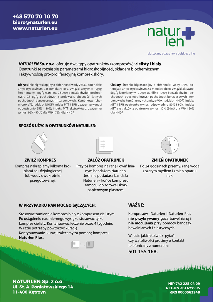 NATURLEN Sp. z o.o. oferuje dwa typy opatrunków (kompresów): cielisty i biały. Opatrunki te różnią się parametrami higroskopijności, składem biochemicznym i aktywnością pro-proliferacyjną komórek skóry. Kompres nakrapiamy kilkoma kroplami soli fizjologicznej lub wody dwukrotnie przegotowanej. Przyłóż kompres na ranę i owiń lnianym bandażem Naturlen. Jeśli nie posiadasz bandaża Naturlen – końce kompresu zamocuj do zdrowej skóry papierowym plastrem. Po 24 godzinach przemyj ranę wodą z szarym mydłem i zmień opatrunek. WAŻNE: Stosować zamiennie kompres biały z kompresem cielistym. Po ustąpieniu nadmiernego wysięku stosować tylko kompres cielisty. Kontynuować leczenie przez 4 tygodnie. W razie potrzeby powtórzyć kurację. Kontynuowanie kuracji zalecamy za pomocą kompresu Naturlen Plus. Kompresów Naturlen i Naturlen Plus nie przykrywamy gazą bawełnianą i nie mocujemy przy pomocy bandaży bawełnianych i elastycznych. W razie jakichkolwiek pytań czy wątpliwości prosimy o kontakt telefoniczny z numerem: 501 155 168.