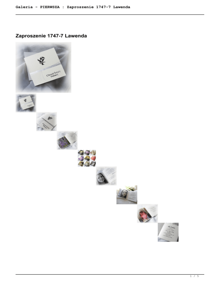 Galeria - PIERWSZA : Zaproszenie 1747-7 Lawenda Zaproszenie 1747-7 Lawenda 1 / 5 Galeria - PIERWSZA : Zaproszenie 1747-7 Lawenda Ocena: Nie ma jeszcze oceny Cena Cena sprzeda?y brutto: 4,70 z? Cena sprzeda?y netto: 3,82 z? Kwota podatku: 0,88 z? Zadaj pytanie o produkt Producent: Art.Design Studio Szczegó?y produktu Zaproszenia 1747-7 Lawenda wraz z kopert? Zaproszenie o wielu mo?liwo?ciach. na ?lub i Wesele, na Chrzest, na Komuni?. Wyj?tkowe zaproszenia na ka?d? okazje. W tym przypadku jako Zaproszenie na Chrzest ?wi?ty twojego Dziecka. Zaproszenie o wielu mo?liwo?ciach. Zobacz nasz? Jako??. Nowoczesne zaproszenia, w których ok?adka w kolorze naturalnej bieli jest ??czona z ?rodkiem z kalki z nadrukowanym motywem Lawendy. Nadruk tekstu na kalce nadaje zaproszeniom lekko?ci i szyku... Opis Produktu rozmiary: zamkni?ta 152x152mm otwarta 152x304mm ?rodek 145x300mm koperta 154x154mm ok?adka: bardzo wysokiej jako?ci papier ozdobny, g?adki, matowy w kolorze ?nie?nej bieli, 260g, zdobiony ozdobnym srebrnym motywem przewi?zanej wst??eczki, oraz ci?ciem laserowym przez które wida? nadrukowany pergamin. GRAFIKA Laserowa: nr. 7 | GRAFIKA Drukowana na Kalce: Lawenda 2 / 5 Galeria - PIERWSZA : Zaproszenie 1747-7 Lawenda Rodzaj wycinanej na ok?adce i drukowanej na kalce grafiki do wyboru. (podaj rodzaj Grafiki Ci?cia i Nadruku w mailu potwierdzaj?cym zamówienie) Laserowe Ci?cie Imion, inicja?ów lub dowolnego napisu w cenie zaproszenia lub na ?yczenie Mo?liwo?? nadruku imion, inicja?ów lub dowolnego napisu na ok?adce - za dodatkow? op?at? ?rodek: stosujemy bardzo wysokiej jako?ci pó?prze?roczyst? kalk?, 120 gram. Mo?liwo?? nadruku zdj?cia za dodatkow? op?at? lub dowolnej grafiki do wyboru na wewn?trznej stronie wk?adki. koperta: stosujemy bardzo wysokiej jako?ci papier g?adki, matowy w kolorze naturalnej bieli, 120 gram. sposób ??czenia ?rodka z ok?adk?: wklejanie Zaproszenie 1747_7 lawenda jest dopasowane graficznie do menu M1747, winietki W1747, pude?eczka PD07 Rabaty Ilo?ciowe Zaproszenia ?lubne (z nadrukiem): od 51 do 100 sztuk - 5% od 101 do 150 sztuk - 8% od 151 do 200 sztuk - 10% od 201 sztuk - do uzgodnienia Rabaty ilo?ciowe obejmuj? zamówienia z?o?one na jeden wzór i dotycz? z?o?onych zamówie? na zaproszenia ?lubne z nadrukiem, rabat odliczany jest od cen zaprosze? z nadrukiem. W przypadku zamówienia zaprosze? bez nadruku, rabat nie jest uwzgl?dniany. Rabaty obejmuj? wy??cznie artyku?y z grupy "Zaproszenia ?lubne". Nie dotycz? galerii: OKAZJE Rabaty nie obejmuj? dodatkowych opcji jak: Personalizacja, Wycinanie Laserowe, T?oczenie, Z?ocenie, Dodatkowy Nadruk, Nadruk i Personalizacja na kopertach. * Rabaty nie ??cz? si? z innymi promocjami i okazjami. Dodatkowe Opcje Nadruk dowolnej tre?ci w ?rodku: + 0,70 z?/szt. mo?liwo?? nadruku w ?rodku, po prawej stronie wklejonej wk?adki po roz?o?eniu zaproszenia - nadruk 1 stronny (strona 3 wk?adki). Personalizacja nazwisk: + 0,70 z?/szt. mo?liwo?? wpisania nazwisk go?ci w tre?? zaproszenia, np: mamy zaszczyt zaprosi? "Sz.P. Jana Kowalskiego z osob? towarzysz?c?" itp. 3 / 5 Galeria - PIERWSZA : Zaproszenie 1747-7 Lawenda * Inne Opcje Dodatkowe Jak Zamawia? Z?ó? zamówienie mailem: [email protected], podaj?c wszelkie informacje potrzebne do zrealizowania zamówienia, takie jak: 1. Model Zaproszenia, 2. Ilo?? (ewentualny podzia?, np. wszystkich: 82 szt, w tym 40 szt. zaprosze? na ?lub i wesele, 20 szt. na sam ?lub i 20 szt. jako zawiadomienia, i 2 szt. dla rodziców) 3. Tre?? Zaprosze? (w pliku tekstowym: Word, Excel, Notatnik, w tre?ci wiadomo?ci mailowej), ewentualny podzia? na poszczególne tre?ci (?lub, ?lub i wesele, zawiadomienie, dla Rodziców itp.), 4. Je?li b?dziemy wykonywa? Personalizacj? (osobny plik z imionami i nazwiskami, wypnktowany. W tre?? zaproszenia: w dope?niaczu, je?li na koperty: w mianowniku) 5. Krój Czcionki z naszych propozycji, lub podaj nazw? czcionki. 6. Wybierz Kolor Nadruku, 7. Ewentualny Ozdobnik drukowany na stronach gdzie drukowana b?dzie tre??. 8. Form? zap?aty: Przelew (przedp?ata), Pobranie, P?atno?? gotówk? przy odbiorze osobistym u nas w biurze 9. Form? Wysy?ki: Poczta Polska, Kurier, Odbiór Osobisty Maksymalnie nast?pnego dnia wy?lemy do Ciebie tzw. Sk?ad do Akceptu w PDF, po akceptacji, przyst?pimy do druku i przygotujemy zamówienie do wysy?ki lub odbioru. Je?li masz dodatkowe wytyczne do swojego zamówienia, opisz je w mailu, pomo?e nam to przygotowa? sk?ad i unikn?? zb?dnych poprawek. Wybierz Nadruk Nadruk mo?e by? zupe?nie dowolny. Nadrukujemy ka?d? tre?? nades?an? przez Pa?stwa. Mo?na tak?e wybra? teksty z naszych propozycji. Pozosta?e Informacje Zamówienia realizujemy w czasie 5-7 dni od dnia z?o?enia zamówienia, Maksymalnie nast?pnego dnia wysy?amy Sk?ady do Akceptu (projekt) w PDF, dopiero po akceptacji przyst?pujemy do drukowania zamówienia, Gotowe zamówienie wysy?amy Kurierem UPS, Poczt? Polsk?, lub umawiamy si? na odbiór osobisty w naszym Biurze, Mo?esz zap?aci? przelewem, gotówk? przy odbiorze przesy?ki, lub gotówk? przy odbiorze osobistym w naszym biurze, Minimalna ilo?? to 10 szt w zamówieniu. 4 / 5 Galeria - PIERWSZA : Zaproszenie 1747-7 Lawenda Je?li masz dodatkowe pytania, prosimy o kontakt e-mail, lub telefonicznie: 22 403 95 48, 503 158 696 Gwarantujemy Najwy?sz? Jako?? Produktów oraz Us?ug. Zapraszamy do zakupów. Art.Design Studio 5 / 5 Powered by TCPDF (www.tcpdf.org)