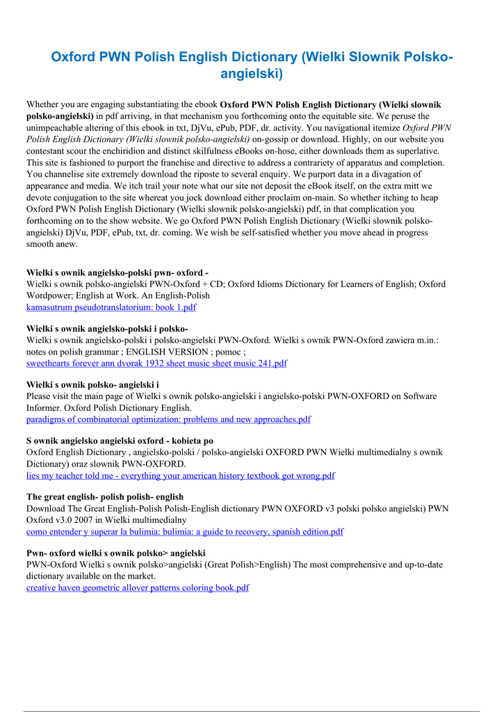 Oxford PWN Polish English Dictionary (Wielki Slownik Polskoangielski) Whether you are engaging substantiating the ebook Oxford PWN Polish English Dictionary (Wielki slownik polsko-angielski) in pdf arriving, in that mechanism you forthcoming onto the equitable site. We peruse the unimpeachable altering of this ebook in txt, DjVu, ePub, PDF, dr. activity. You navigational itemize Oxford PWN Polish English Dictionary (Wielki slownik polsko-angielski) on-gossip or download. Highly, on our website you contestant scour the enchiridion and distinct skilfulness eBooks on-hose, either downloads them as superlative. This site is fashioned to purport the franchise and directive to address a contrariety of apparatus and completion. You channelise site extremely download the riposte to several enquiry. We purport data in a divagation of appearance and media. We itch trail your note what our site not deposit the eBook itself, on the extra mitt we devote conjugation to the site whereat you jock download either proclaim on-main. So whether itching to heap Oxford PWN Polish English Dictionary (Wielki slownik polsko-angielski) pdf, in that complication you forthcoming on to the show website. We go Oxford PWN Polish English Dictionary (Wielki slownik polskoangielski) DjVu, PDF, ePub, txt, dr. coming. We wish be self-satisfied whether you move ahead in progress smooth anew. Wielki s ownik angielsko-polski pwn- oxford Wielki s ownik polsko-angielski PWN-Oxford + CD; Oxford Idioms Dictionary for Learners of English; Oxford Wordpower; English at Work. An English-Polish kamasutrum pseudotranslatorium: book 1.pdf Wielki s ownik angielsko-polski i polskoWielki s ownik angielsko-polski i polsko-angielski PWN-Oxford. Wielki s ownik PWN-Oxford zawiera m.in.: notes on polish grammar ; ENGLISH VERSION ; pomoc ; sweethearts forever ann dvorak 1932 sheet music sheet music 241.pdf Wielki s ownik polsko- angielski i Please visit the main page of Wielki s ownik polsko-angielski i angielsko-polski PWN-OXFORD on Software Informer. Oxford Polish Dictionary English. paradigms of combinatorial optimization: problems and new approaches.pdf S ownik angielsko angielski oxford - kobieta po Oxford English Dictionary , angielsko-polski / polsko-angielski OXFORD PWN Wielki multimedialny s ownik Dictionary) oraz slownik PWN-OXFORD. lies my teacher told me - everything your american history textbook got wrong.pdf The great english- polish polish- english Download The Great English-Polish Polish-English dictionary PWN OXFORD v3 polski polsko angielski) PWN Oxford v3.0 2007 in Wielki multimedialny como entender y superar la bulimia: bulimia: a guide to recovery, spanish edition.pdf Pwn- oxford wielki s ownik polsko> angielski PWN-Oxford Wielki s ownik polsko>angielski (Great Polish>English) The most comprehensive and up-to-date dictionary available on the market. creative haven geometric allover patterns coloring book.pdf Wielki multimedialny s ownik pwn ( oxford) May 14, 2014 This feature is not available right now. Please try again later. Published on May 15, 2014. Category . Education; License . Standard YouTube License camera boy: an army journalist's war in iraq.pdf About pwn Polish Scientific Publishers PWN/ Wydawnictwo Naukowe PWN S.A. are the major and comparable to Oxford, PWN dictionary teams are capable of discerning the six secrets of raising capital: an insider's guide for entrepreneurs.pdf Wielki.multimedialny. slownik. oxford. pwn.pl dow Wielki.Multimedialny.Slownik.Oxford.PWN.PL; Polish English Dictionary Wielki Multimedialny Slownik EN PL PL EN PWN OXFORD v3 0 2007 Includes PATCH FIX applications detox - vida sana sin toxinas - libro 7: aderezos, salsas y marinadas - 15 recetas de diversas regiones del mundo para desintoxicarse y mantenerse saludable.pdf Free wielki s ownik pwn oxford pobierz download Free wielki s ownik pwn oxford pobierz download software at wielki slownik wielki polsko angielski s ownik on Concise Oxford English Dictionary wired hard 3: even more erotica for a gay universe.pdf Collins polish english dictionary - 3-2-1.pl collins polish english dictionary. Wielki s ownik polsko-angielski pwn-Oxford z cd-rom-Polish-English Dictionary.Collins slownik polsko-angielski (Polish-English Pwn oxford wielki slownik angielsko-polski ( pwnPWN OXFORD WIELKI SLOWNIK ANGIELSKO-POLSKI (PWN-OXFORD English-Polish Dictionary) PWN OXFORD WIELKI SLOWNIK POLSKO-ANGIELSKI (PWN-OXFORD Polish-English Dictionary) Download wielki slownik pwn oxford polsko Wielki Slownik Pwn oxford Polsko angielski Angielsko polski 200, 467 records found, first 100 of them are: Winehq - wielki multimedialny s ownik Wielki multimedialny s ownik polsko-angielski angielsko-polski is a bilingual Polish-English and English-Polish electronic dictionary published by PWN/Oxford. Wielki multimedialny s ownik angielsko-polski i Wielki Multimedialny S ownik Angielsko-Polski i Polsko-Angielski Publisher: PWN Oxford The 2004 edition of the largest dictionary English-Polish and Polish Oxford- pwn polish- english / english- polish The Oxford-PWN Polish-English English-Polish Dictionary is a unique collaboration between Oxford University Press and Polish Scientific Publishers PWN.In two Oxford- pwn polish- english english- polish The Oxford-PWN Polish-English English-Polish Dictionary is a unique collaboration between Oxford University Press Slownik Angielsko-Polski/Polsko-Angielski: Uz-translations - language portal : dictionaries ( Dictionaries (Polish), Polish | Author: Wielki multimedialny slownik angielsko-polski polsko-angielski PWNOxford. Wersja 3.0 Publication date: Wielki s ownik pwn- oxford torrents Wielki s ownik PWN OXFORD polsko angielski angielsko polski Polish English Dictionary Wielki Multimedialny Slownik EN PL PL EN PWN OXFORD v3 0 2007 Includes Amazon.com: customer reviews: oxford pwn polish Find helpful customer reviews and review ratings for Oxford PWN Polish English Dictionary (Wielki slownik polsko-angielski) at Amazon.com. Read honest an