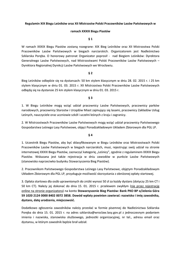 Regulamin XIX Biegu Leśników oraz XII Mistrzostw Polski Pracowników Lasów Państwowych w ramach XXXIX Biegu Piastów §1 W ramach XXXIX Biegu Piastów zostaną rozegrane: XIX Bieg Leśników oraz XII Mistrzostwa Polski Pracowników Lasów Państwowych w biegach narciarskich. Organizatorem jest Nadleśnictwo Szklarska Poręba. O honorowy patronat Organizator poprosił - nad Biegiem Leśników: Dyrektora Generalnego Lasów Państwowych, nad Mistrzostwami Polski Pracowników Lasów Państwowych – Dyrektora Regionalnej Dyrekcji Lasów Państwowych we Wrocławiu. §2 Bieg Leśników odbędzie się na dystansach: 50 km stylem klasycznym w dniu 28. 02. 2015 r. i 25 km stylem klasycznym w dniu 01. 03. 2015 r. XII Mistrzostwa Polski Pracowników Lasów Państwowych odbędą się na dystansie 25 km stylem klasycznym w dniu 01. 03. 2015 r. §3 1. W Biegu Leśników mogą wziąć udział pracownicy Lasów Państwowych, pracownicy parków narodowych, pracownicy Starostw i Urzędów Miast zajmujący się lasami, pracownicy Zakładów Usług Leśnych, nauczyciele oraz uczniowie szkół i uczelni leśnych z kraju i zagranicy. 2. W Mistrzostwach Pracowników Lasów Państwowych mogą wziąć udział pracownicy Państwowego Gospodarstwa Leśnego Lasy Państwowe, objęci Ponadzakładowym Układem Zbiorowym dla PGL LP. §4 1. Uczestnik Biegu Piastów, aby być sklasyfikowanym w Biegu Leśników oraz Mistrzostwach Polski Pracowników Lasów Państwowych w biegach narciarskich, musi, rejestrując swój udział na stronie internetowej XXXIX Biegu Piastów, zaznaczyć kategorię „Leśnicy”, zgodnie z regulaminem XXXIX Biegu Piastów. Wskazana jest także rejestracja w dniu zawodów w punkcie Lasów Państwowych (stanowisko naprzeciwko budynku Stowarzyszenia Bieg Piastów). 2. Pracownikom Państwowego Gospodarstwa Leśnego Lasy Państwowe, objętym Ponadzakładowym Układem Zbiorowym dla PGL LP, przysługuje możliwość skorzystania z obniżonej opłaty startowej. 3. Opłata startowa dla osób uprawnionych do zniżki wynosi 50 zł za każdy dystans (dotyczy 25 km CT i 50 km CT). Należy jej dokonać do dnia 15. 01. 2015 r. przelewem zwykłym (nie przez rejestrację online na stronie organizatora) na konto Stowarzyszenie Bieg Piastów: Bank PKO BP o/Jelenia Góra 59 1020 2124 0000 8402 0072 3858. Dowód wpłaty powinien zawierać: nazwisko i imię zawodnika, dystans, datę urodzenia, miejscowość. Dodatkowo zgłoszenia zawodników należy przesłać w formie pisemnej do Nadleśnictwa Szklarska Poręba do dnia 15. 01. 2015 r. na adres [email protected] z jednoczesnym podaniem imienia i nazwiska, stanowiska służbowego, jednostki organizacyjnej, nr tel., adresu email oraz dystansu, w którym zawodnik będzie brał udział. Brak zgłoszenia do Nadleśnictwa Szklarska Poręba uniemożliwi skorzystanie z obniżonej opłaty startowej wnoszonej przez zawodnika, do której dopłatę zapewnia organizator. 4. Klasyfikacja w XIX Biegu Leśników oraz XII Mistrzostwach Polski Pracowników Lasów Państwowych zostanie ustalona w oparciu o klasyfikację otrzymaną od organizatorów XXXIX Biegu Piastów. 5. Warunkiem sklasyfikowania zawodnika w Mistrzostwach Polski Pracowników Lasów Państwowych na pierwszych trzech pozycjach jest przedłożenie ważnej legitymacji służbowej lub zaświadczenia o zatrudnieniu z miejsca pracy. §5 1. W Biegu Leśników będą przyznawane następujące nagrody: - kobiety – za zajęcie miejsc 1-3 - puchary Dyrektora Generalnego Lasów Państwowych. - mężczyźni - za zajęcie miejsc 1-3 - puchary Dyrektora Generalnego Lasów Państwowych. 2. W Mistrzostwach Polski Pracowników Lasów Państwowych będą przyznawane następujące nagrody: - kobiety – za zajęcie miejsc 1-3 - puchary Dyrektora Regionalnej Dyrekcji Lasów Państwowych we Wrocławiu oraz nagrody rzeczowe lub finansowe. - mężczyźni - za zajęcie miejsc 1-3 - puchary Dyrektora Regionalnej Dyrekcji Lasów Państwowych we Wrocławiu oraz nagrody rzeczowe lub finansowe. §6 1. Zawodnicy uhonorowani nagrodami rzeczowymi lub finansowymi zobowiązani są do wypełnienia „Potwierdzenia odbioru nagrody w XII Mistrzostwach Polski Pracowników Lasów Państwowych w narciarstwie biegowym”, stanowiącego załącznik nr 1 do niniejszego regulaminu. 2. Zawodnicy, którzy nie wyrażą zgody na wypełnienie „Potwierdzenia …” jak w ust. 1 nie otrzymają nagród przewidzianych w § 5 ust. 2. §7 1. Zwycięzcy Biegu Leśników i Mistrzostw Pracowników Lasów Państwowych wezmą udział w dekoracji, która odbędzie się w punkcie zawodów Lasów Państwowych. §8 1. Organizatorzy nie ponoszą odpowiedzialności cywilnej za ewentualne urazy zawodników i zniszczenia sprzętu sportowego. 2. Pozostałe postanowienia reguluje Regulamin XXXIX Biegu Piastów dostępny na stronie Stowarzyszenia Bieg Piastów w zakładce „Regulaminy”. Nadleśniczy Zyta Bałazy ZAŁĄCZNIK NR 1 do Regulaminu XIX Biegu Leśników oraz XII Mistrzostw Polski Pracowników Lasów Państwowych w ramach XXXIX Biegu Piastów. POTWIERDZENIE ODBIORU NAGRODY W XII MISTRZOSTWACH POLSKI PRACOWNIKÓW LASÓW PAŃSTWOWYCH W NARCIARSTWIE BIEGOWYM Dane Zwycięzcy: Imię i nazwisko: ……………………………………………………………………………………….. Adres zamieszkania: …………………………………………………………………………………. ………………………………………………………………………………………………………………….. NR PESEL …………………………………………………………………………………………………… Adres właściwego Urzędu Skarbowego:……………………………………………………. ………………………………………………………………………………………………………………….. Niniejszym potwierdzam odbiór nagrody: rzeczowej w postaci:………………………