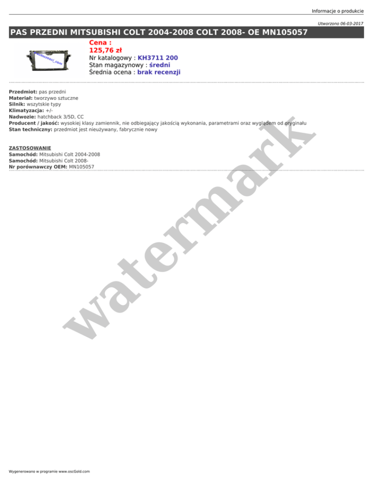Informacje o produkcie Utworzono 06-03-2017 PAS PRZEDNI MITSUBISHI COLT 2004-2008 COLT 2008- OE MN105057 Cena : 125,76 zł Nr katalogowy : KH3711 200 Stan magazynowy : średni Średnia ocena : brak recenzji w at ZASTOSOWANIE Samochód: Mitsubishi Colt 2004-2008 Samochód: Mitsubishi Colt 2008Nr porównawczy OEM: MN105057 er m ar k Przedmiot: pas przedni Materiał: tworzywo sztuczne Silnik: wszytskie typy Klimatyzacja: +/Nadwozie: hatchback 3/5D, CC Producent / jakość: wysokiej klasy zamiennik, nie odbiegający jakością wykonania, parametrami oraz wyglądem od oryginału Stan techniczny: przedmiot jest nieużywany, fabrycznie nowy Wygenerowano w programie www.oscGold.com
