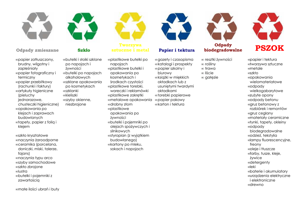 Odpady zmieszane • papier zatłuszczony, brudny, wilgotny i zapleśniały • papier fotograficzny i termiczny • papier przebitkowy (rachunki i faktury) • artykuły higieniczne (pieluchy jednorazowe, chusteczki higieniczne) • opakowania po klejach i zaprawach budowlanych • tapety, papier z folią i klejem • szkło kryształowe • naczynia żaroodporne • ceramika (porcelana, doniczki, miski, talerze, fajans) • naczynia typu arco • szyby samochodowe • szkło zbrojone • lustra • butelki i pojemniki z zawartością • małe ilości ubrań i buty Szkło • butelki i słoiki szklane po napojach i żywności • butelki po napojach alkoholowych • szklane opakowania po kosmetykach • szklanki • kieliszki • szyby okienne, niezbrojone Tworzywa sztuczne i metal • plastikowe butelki po napojach • plastikowe butelki i opakowania po kosmetykach i środkach czystości • plastikowe torebki, woreczki i reklamówki • plastikowe zakrętki • metalowe opakowania • drobny złom • plastikowe opakowania po żywności • butelki i pojemniki po olejach spożywczych i silnikowych • styropian (z wyjątkiem budowlanego) • kartony po mleku, sokach i napojach Odpady biodegradowalne Papier i tektura • gazety i czasopisma • katalogi i prospekty • papier szkolny i biurowy • książki w miękkich okładkach lub z usuniętymi twardymi okładkami • torebki papierowe • papier pakowy • karton i tektura • • • • • resztki żywności rośliny trawa liście gałęzie PSZOK • papier i tektura • tworzywa sztuczne • metale • szkło • opakowania wielomateriałowe • odpady wielkogabarytowe • zużyte opony • odpady betonu • gruz betonowy z rozbiórek i remontów • gruz ceglany • materiały ceramiczne • tynki, tapety, okleiny • odpady biodegradowalne • odzież, tekstylia • lampy fluorescencyjne, freony • oleje i tłuszcze • farby, tusze, kleje, żywice • detergenty • leki • baterie i akumulatory • urządzenia elektryczne i elektroniczne • drewno