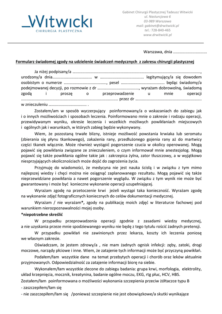 GabinetChirurgiiPlastycznejTadeuszWitwicki ul.Nasturcjowa6 03-989Warszawa mail:[email protected] tel.:728-840-465 www.drwitwicki.pl Warszawa,dnia.............................. Formularzświadomejzgodynaudzielenieświadczeńmedycznychzzakresuchirurgiiplastycznej Janiżejpodpisany/a…................................…............................................................................, urodzony/a dnia................................... w ….................................... legitymujący/a się dowodem osobistym o numerze …..................................., pesel ….................................... będąc świadomy/a podejmowanejdecyzji,porozmowiezdr…..................................,wyrażamdobrowolną,świadomą zgodą i proszę o przeprowadzenie u mnie operacji ......................................................................................przezdr…........................................................ wznieczuleniu…................................ Zostałem/am w sposób wyczerpujący poinformowany/a o wskazaniach do zabiegu jak ioinnychmożliwościachisposobachleczenia.Poinformowanomnieozakresieirodzajuoperacji, przewidywanym wyniku, okresie leczenia i wszelkich możliwych powikłaniach miejscowych iogólnychjakiwarunkach,wktórychzabiegbędziewykonywany. Wiem, że pozostaną trwałe blizny, istnieje możliwość powstania krwiaka lub seromatu (zbierania się płynu tkankowego), zakażenia rany, przedłużonego gojenia rany aż do martwicy części tkanek włącznie. Może również wystąpić pogorszenie czucia w okolicy operowanej. Mogą pojawić się powikłania związane ze znieczuleniem, o czym informował mnie anestezjolog. Mogą pojawićsiętakżepowikłaniaogólnetakiejak:zakrzepicażylna,zatortłuszczowy,awwyjątkowo niesprzyjającychokolicznościachmożedojśćdozagrożeniażycia. Przyjmuję do wiadomości, że medycyna nie jest nauka ścisłą i w związku z tym mimo najlepszej wiedzy i chęci można nie osiągnąć zaplanowanego rezultatu. Mogą pojawić się także nieprzewidziane powikłania a nawet pogorszenie wyglądu. W związku z tym wynik nie może być gwarantowanyimożebyćkoniecznewykonanieoperacjiuzupełniającej. Wyrażam zgodę na przetoczenie krwi jeżeli wystąpi taka konieczność. Wyrażam zgodę nawykonaniezdjęćfotograficznychkoniecznychdocelówdokumentacjimedycznej. Wyrażam / nie wyrażam*, zgody na publikację moich zdjęć w literaturze fachowej pod warunkiemnierozpoznawalnościmojejosoby. *niepotrzebneskreślić W przypadku przeprowadzenia operacji zgodnie z zasadami wiedzy medycznej, anieuzyskaniaprzezemniespodziewanegowynikuniebędęztegotytułurościćżadnychpretensji. W przypadku powikłań nie zawinionych przez lekarza, koszty ich leczenia poniosę wewłasnymzakresie. Oświadczam, że jestem zdrowy/a , nie mam żadnych ognisk infekcji: zęby, zatoki, drogi moczowe,narządypłcioweiinne.Wiem,żezatajenietychinformacjimożebyćprzyczynąpowikłań. Podałem/łamwszystkiedanenatematprzebytychoperacjiichoróborazlekówaktualnie przyjmowanych.Odpowiedzialnośćzazatajenieinformacjibioręnasiebie. Wykonałem/łamwszystkiezleconedozabiegubadania:grupakrwi,morfologia,elektrolity, układkrzepnięcia,mocznik,kreatynina,badanieogólnemoczu,EKG,rtgpłuc,HCV,HBS. Zostałem/łampoinformowanaomożliwościwykonaniaszczepieniaprzeciwżółtaczcetypuB -zaszczepiłem/łamsię -niezaszczepiłem/łamsię/ponieważszczepienieniejestobowiązkowe/askutkiwynikające ztejdecyzjibioręnawłasnąodpowiedzialność. Wciąguostatnichsześciumiesięcy: -byłem/łamoperowany/a..................................................................................................................... -miałem/łamprzetaczanąkrew/preparatypochodnekrwi/.............................................................. -miałem/łamwykonywanezabiegistomatologiczne…........................................................................ -miałem/łamwykonywanezabiegikosmetyczne….............................................................................. -miałem/łamwykonywanezabiegimedycynyestetycznej…............................................................... -pobieranomikrewnabadania…........................................................................................................ Zostałem/łam poinformowany o trybie sprawowania opieki pooperacyjnej na którą wyraziłem/łam zgodę i otrzymałem/łam zalecenia pooperacyjne. W trakcie rozmowy z dr …............................ zadałem/łam interesujące mnie pytania , na które uzyskałem/łam wyczerpująceizrozumiałedlamnieodpowiedzi. Ponadto wyrażam zgodę na wykonanie oprócz w/w zabiegu, także wszelkich innych niemożliwychdoprzewidzeniaprocedur,koniecznychdoosiągnięciazaplanowanegorezultatulub usunięciawynikłychwtrakcieoperacjinieprawidłowości.Wsytuacjiwystąpieniaumniewtrakcie zabiegu stanu ograniczenia świadomości uniemożliwiającego w pełni świadome podejmowanie decyzji, wyrażam też zgodę na wykonanie u mnie kolejnych operacji, które zespól lekarski uzna zaniezbędne. Jestemświadomy/a,żeoperatormaprawodoodwołaniaoperacjilubjejprzełożenia,może teżzlecićwykonaniekontroliinnemuspecjaliście.Mojazgodajestdobrowolnainiewywieranona mnieżadnegonaciskuaninienamawianodozabiegu.Oświadczam,żeniezataiłamprzedlekarzem żadnego faktu, który mógłby mieć wpływ na przebieg leczenia i jego wynik. Moja motywacja do zabiegu jest świadoma. Zgody udzielam w pełni świadoma, nie będąc pod wpływem leków aniżadnychinnychśrodków. Oświadczam, że będę przestrzegać wszelkich otrzymanych zaleceń lekarskich, zgłoszę się na wyznaczoną kontrolną wizytę lekarską . Nie będę prowadzić pojazdów przez 24 godziny powykonanymzbieguoperacyjnym. OŚWIADCZENIEPACJENTA Niniejszym potwierdzam, iż przeczytałem/am uważnie i zrozumiałem/am treści zawarte wpowyższym formularzu. Oświadczam również, iż cel zaproponowanego zabiegu operacyjnego,orazdaj