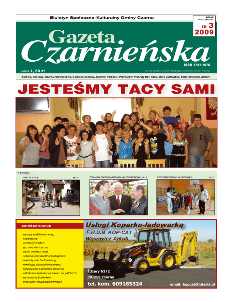 ROK VII maj-czerwiec nr 3 2009 JESTEŚMY TACY SAMI w numerze: WIZYTA Z FIDE str. 4 Szeroki zakres usług: - wykopy pod fundamenty, kanalizację; instalacje wodne; gazowe, elektryczne; oczka wodne, stawy; szamba, oczyszczalnie biologiczne; - remonty oraz budowa dróg; - niwelację, odwodnienia terenu; - korytowanie pod kostkę brukową; - załadunek /rozładunek towaru na paletach/; - wyburzanie budynków; - oraz wiele innych prac ziemnych ZOFIA JABŁONOWSKA-RATAJSKA W PRZYBOROWIU str. 8 FESTYN RODZINNY W BOROWEJ str. 2 Gazeta Czarnieńska Fotoreportaż nr 3 str. 3 Sesje Rady Gminy (fot. St. Zieliński) FESTYN RODZINNY W BOROWEJ W niedzielne popołudnie w ostatnią niedzielę maja młodzież z Zespołu Szkół w Borowej zaprosiła rodziców na festyn rodzinny. Pogoda pokrzyżowała troszeczkę plany organizatorom, którzy musieli przenieść część oficjalną okraszoną występami szkolnego teatrzyku do Gazeta Czarnieńska nr 3 Sali gimnastycznej. Do zorganizowania tej rodzinnej imprezy przyczyniło się wielu sponsorów, a o smakołyki tradycyjnej borowskiej kuchni zadbały panie z Koła Aktywnych Kobiet. Stoły uginały się od smacznego jadła i wypieków, a przed wejściem na rozżarzonych grillach piekły się smakowite kiełbaski i krupnioki. Zabawa, przeciąganie liny i strzelanie z łuku pod bacznym okiem przybyłych z Dębicy słowiańskich wojów trwały do wieczora. Zobaczcie Państwo jak bawiła się Borowa na Festynie Rodzinnym. ABSOLUTRIUM UDZIELONE Rada Gminy na posiedzeniu w dniu 27 kwietnia 2009r. udzieliła wójtowi absolutorium za wykonanie budżetu za rok 2008. Podjęcie uchwały o udzieleniu absolutorium poprzedziło wystąpienie przewodniczącego Komisji Rewizyjnej Kazimierza Lenczewskiego oraz przewodniczącego Komisji Budżetu i Finansów Kazimierza Kłosa. Radni zapoznali się także z opiniami Regionalnej Izby Obrachunkowej w tej sprawie. Następnie radni uchwalili uchwały dotyczące: wyrażenia zgody na zawarcie porozumienia z powiatem i przekazanie kwoty 30 tysięcy złotych na dokończenie budowy Oddziału Paliatywnego w Szpitalu w Straszęcinie. Odział ten jest niezwykle potrzebny. Obecnie istniejący w budynku Oddziału Zakaźnego w Dębicy będzie zlikwidowany, nie odpowiada przepisom. Stąd konieczność zorganizowania oddziału, który zapewniłby opiekę pacjentom w stanach ciężkich. Kolejne uchwały dotyczyły wykupu nieruchomości przewidzianych pod realizację zadań gminnych, dróg gminnych oraz parkingów. Podjęto również uchwałę o zmianach w budżecie. Następnym zagadnieniem, którym zajęła się rada było wysłuchanie informacji o selektywnej zbiórce odpadów na terenie gminy złożonej przez kierownika Zakładu Gospodarowania Odpadami w Paszczynie p. Bolesława Babiarza. Ze złożonego sprawozdania wynikało, iż z roku na rok zwiększa się na terenie gminy ilość gospodarstw domowych, które podpisują umowy z zakładem o odbiór odpadów segregowanych. Nie wszyscy zrozumieli, że odpady należy oddawać specjalizującemu się w ich zagospodarowaniu przedsiębiorstwu. Publikowane odezwy, ulotki informacyjne nie odnoszą oczekiwanego skutku, choć z roku na rok postęp w zwiększeniu podpisywania umów jest notowany na terenie gminy. Radni nie wnosili istotnych uwag dotyczących funkcjonowania zakładu i sposobu odbierania nieczystości. Z przeprowadzonej w tej kwestii dyskusji wysnuć należy następujące wnioski: selektywna zbiórka odpadów staje się coraz bardziej powszechna, należy wydawać worki plastikowe każdemu, kto chce, a zarazem upowszechniać odbiór odpadów, włączyć młodzież szkolną do szeroko zakrojonej akcji agitacyjnej dotyczącej prowadzenia selektywnej zbiórki odpadów. Padały również głosy dotyczące karania tych, którzy nie przestrzegają uchwalonego prawa miejscowego w tym zakresie a dotyczącego zachowania porządku i czystości w gminie. „Jest prawo i leży w szufladzie” podkreślał jeden z radnych, nie ma sankcji za nieprzestrzeganie przepisów, a śmieci wyrzuca się do lasu. O głos poprosiła radę p. Wanda Lasota z Lądka Zdroju, właścicielka posesji w Żdżarach. Jej wypowiedź zawierającą szereg pretensji w stosunku do radnych i sołtysów oraz wójta została zignorowana, sołtysi i radni zaczęli opuszczać salę obrad, w związku z tym przewodniczący zakończył posiedzenie rady. Kolejna sesja odbyła się w dniu 25 maja. Przed rozpoczęciem obrad prezes zarządu Polskiego Czerwonego Krzyża w Dębicy lek. med. Janusz Bieniasz zbierał datki do puszki, które przeznaczone będą na letni wypoczynek dla dzieci z naszego powiatu. (jak poinformował nas zarząd PCK zebrano kwotę 493 złote). Obrady otworzył przewodniczący, który zatwierdził porządek obrad. Jednym z pierwszych realizowanym w tym dniu punktów było sprawozdanie wójta z działalności międzysesyjnej. Przekazał radnym, iż w powiecie odbył się przetarg, otwarcie ofert na przebudowę drogo powiatowej Pilzno – Róża na odcinku Pilzno do przejazdu kolejowego w Czarnej. Na przebudowę tej drogi środki z Unii Europejskiej wyniosą 5 milionów złotych. W kolejnym punkcie radni wysłuchali sprawozdania lek. med. Piotra Dobródzkiego - dyrektora Samodzielnego Publicznego Gminnego Zakładu Opieki Zdrowotnej dotyczącego działalności kierowanej przez niego placówki służby zdrowia w roku 2008. Przedłożone sprawozdanie finansowe zostało przyjęte jednogłośnie przez radę. Radni przyjęli uchwały: program profilaktyki rozwiązywania problemów alkoholowych Gminy Czarna na rok 2009, o zmniejszeniu liczby punktów sprzedaży alkoholu do 21 (powyżej 4,5% alkoholu), o powołaniu Międzyszkolnego Klubu Sportowego „Żabka” w Czarnej, o zakupie: 2,11 ha gruntu w Róży pod rozbudowę boiska sportowego i 29 a, w Żdżarach oraz w Grabinach na uregulowanie i poszerzenie drogi gminnej. Podjęto również uchwałę o zmianach w budżecie w związku z otrzymana dotacją w kwocie 20 tysięcy złotych z 