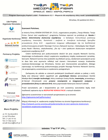 Wrocław, 02 październik 2012 r. Szanowni Państwo, w imieniu firmy VENOM SYSTEMS SP. Z O.O., organizatora projektu „Twoja Wiedza. Twoja Firma. Zarzuć sieci współpracy”, pragniemy Państwa zaprosić na prelekcje pt. Nauka i biznes- determinanty skutecznej współpracy o tematyce: Komunikacja podstawą współpracy, Inwentyka, Rzetelność i zaufanie w transferze technologii, Specyfika prowadzenia firmy B+R - zagadnienia księgowe odbywające się na konferencji podsumowującej projekt Naszego Partnera Network Sunrise – Dolnośląska Sieć Współpracy Nauki i Biznesu, zatytułowanej: „Da się — sieci społeczne skutecznym narzędziem wspierania współpracy B+R”. Celem konferencji jest podsumowanie dwóch lat prac zespołu Network Sunrise, skupionego na budowaniu relacji i wspieraniu współpracy między naukowcami i przedsiębiorcami. Network Sunrise chce podzielić się efektami pracy, działaniami powziętymi przez te dwa lata oraz wysnucie refleksji nad stanem i kierunkami rozwoju środowiska naukowo-biznesowego we Wrocławiu. Koniec jest równocześnie początkiem, dlatego zapraszając na konferencję podsumowującą projekt Naszego Partnera Network Sunrise, nie proponujemy uczestnictwa w wydarzeniu pożegnalnym. Zachęcamy do udziału w czterech prelekcjach (możliwość udziału w jednej z nich). Będą one dotyczyć takich zagadnień jak: psychologia biznesu (prowadząca Kamila Madeja-Bień) transfer technologii, który zrealizuje Cezary Rutka, inwentyka, prowadzący: dr Henryk Chrostowski oraz prawne rozwiązania w księgowości związane z prowadzeniem firmy w zakresie B+R, który poprowadzi Katarzyna Stoncel-Lebiedź. Przed warsztatami, jak i bezpośrednio po nich uczestnicy warsztatów będą mieli możliwość zapisania się na BEZPŁATNE KONSULTACJE z rożnych dziedzin. Zgłoszenia uczestnictwa w warsztatach przyjmowane są na stronie: http://zgloszenia.twtf.pl/formularz/ Więcej informacji nt. wydarzenia znajdą Państwo na stronie Organizatora konferencji : http://network.sunrise.wroclaw.pl/wydarzenia/da-sie-sieci-spoleczne-skutecznymnarzedziem-wspierania-wspolpracy/ Data wydarzenia: 10. października 2012 r. Miejsce: ArtHotel, ul. Kiełbaśnicza 20, Wrocław Konferencja zostanie podzielone na dwie części. Pierwsza poświęcona będzie podsumowaniu projektu Network Sunrise. Natomiast druga, to cztery równoległe PRELEKCJE prowadzone w ramach projektu „Twoja wiedza. Twoja firma. Zarzuć sieci współpracy” Program konferencji: 09.30 – 10.00 10.00 – 10.45 10.45 – 11.45 11.45 – 12.00 12.00 – 14.30 14.30 – 15.30 Rejestracja Wypowiedzi przedstawicieli partnerów Podsumowanie projektu Przerwa kawowa Prezentacje zaproszonych beneficjentów Lunch 15.30 – 17.00 PRELEKCJE: 1. Komunikacja podstawą współpracy, Kamila Madeja-Bień, właścicielka firmy PsychoEdukacja Uczestnicy podczas warsztatów będą podejmowali próbę odpowiedzi na pytanie Czy efektywne przywództwo to klucz do sukcesu? Poznają znaczenie komunikacji jako podstawy współpracy oraz rozwoju przedsiębiorstwa, dowiedzą się jak mechanizmy wpływu społecznego warunkują skuteczny marketing. 2. Inwentyka, dr inż. Henryk Chrostowski, Politechnika Wrocławska Na te warsztaty zapraszamy szczególnie osoby poszukujące twórczych rozwiązań. Prowadzący przedstawi ścieżkę powstawania innowacyjnych pomysłów oraz podpowie jak i gdzie szukać pomysłów. 3. Rzetelność i zaufanie w transferze technologii, Cezary Rutka właściciel firmy Alnair, członek Dolnośląskiej Rady Przedsiębiorczości i Nauki, członek Loży Dolnośląskiej BCC Połączenie biznesu z nauką wymaga nie tylko solidnego przygotowania merytorycznego ale również stworzenia odpowiednich warunków współpracy. Uczestnicy warsztatu dowiedzą się jakie warunki muszą zaistnieć aby zwiększyć szansę skuteczności procesu transferu technologii. 4. Specyfika prowadzenia firmy B+R - zagadnienia księgowe, Katarzyna Stoncel-Lebiedź, właścicielka Biura Usług Księgowych Komercjalizacja wyników badań oraz zawiązywanie współpracy pracowników naukowych z przedsiębiorstwami sprzyja powstawaniu firm w sektorze B+R. Na warsztatach, osoby zainteresowane rozwojem tego sektora, poznają praktyczne zagadnienia księgowe związane z prowadzeniem firmy.