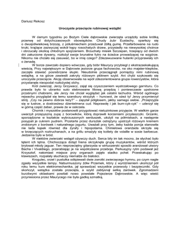 Dariusz Rekosz Uroczyste przecięcie rubinowej wstążki W ósmym tygodniu po Bożym Ciele dąbrowskie zwierzęta urządziły sobie krótką przerwę od dotychczasowych obowiązków. Chudy żubr Eustachy, oparłszy się o dwuipółwiekową brzozę, z półuśmiechem przeżuwał żółtą gumę. Przefarbowane na rudo kruki, krążące zazwyczaj wokół kępy rosochatych drzew, przysiadły na niewysokiej choince i obrzucały okolicę chłodnym spojrzeniem. Brzuchaty misiek Szczepan, trzepiący od dwóch dni zakurzone dywany, rozłożył swoje brunatne futro na ścieżce prowadzącej na wzgórze. Nikomu nie chciało się zasuwać, bo w imię czego? Zdezawuowane hulanki przyprawiały ich o żenadę. W borze zawrzało dopiero wówczas, gdy bóbr Maurycy przybiegł z ekstrazaskakującą wieścią. Przy największym w Dąbrowie jeziorze grupa fachowców, na oko majster-klepków, zaczęła stawiać posrebrzane słupki. Nieudolnie przeciągnęli pomiędzy nimi rubinową wstążkę, a na górze zawiesili zakryty różowym płótnem szyld. Ani chybi szykowało się uroczyste przecięcie. Akcję obserwowała na wpół zdezorientowana grupa rowerzystów, która przystanęła nieopodal rozłożystej olchy. Król zwierząt, Jerzy Grzywacz, zajął się czyszczeniem wystrzałowego garnituru. Co prawda było to ubranko suto stebnowane liliową przędzą i poniewczasie upstrzone przaśnymi chabrami, ale Jerzy nie chciał wyglądać jak ostatni łachudra. Wśród ogólnego rejwachu przyglądał się temu szarobury strzyżyk – huncwot, że ożeż ty! Jerzy przymierzył strój. „Czy na pewno dobrze leży?” – zapytał półgłosem, jakby samego siebie. „Przejrzyjże się w lustrze, a dostrzeżesz dżentelmena cud. Naprawdę i jak bum-cyk-cyk” – uderzył się w górną część żeber, prawie że w oskrzela. Chomik i myszołów postanowili przygotować nietuzinkowe przyjęcie. W wielkim garze uwarzyli przepyszną zupę z borowików, którą doprawili korzeniami przylaszczki. Grzanki, sporządzone w kształcie wybrzuszonych serduszek, ułożyli na półmiskach, a następnie posypali je cukrem pudrem. Przetarte przez durszlak ostrężyny upstrzyli różowym kremem zrobionym z borówek i naturalnego jogurtu. Uważali przy tym, żeby każda porcja stanowiła nie lada kąsek również dla żyrafy i hipopotama. Chmielowa oranżada skrzyła się w brzęczących roztruchanach, a na grillu smażyły się kotlety de volaille w sosie barbecue. Jedzenia było w bród. W niektóre zwierzaki wstąpił ożywczy duch. Serca biły im tak mocno, że słychać było tętent ich tętna. Chichocząca dotąd hiena skrzyknęła grupę muzykantów, wśród których brylował młody jaguar. Ten nieprzeciętny gitarzysta w wirtuozerski sposób aranżował utwory Bacha i Vivaldiego, przerabiając je na współczesne przeboje. Perkusyjny rytm podawał jeż Krzysztof, natomiast miejsce przy organach zajęło stadko pcheł. Przeskakując po klawiszach, rozpalały słuchaczy niemalże do białości. Krogulec, orzeł i pustułka odśpiewali dwie zwrotki zwierzęcego hymnu, po czym nagle zgasły wszystkie lampy. Naburmuszony żółw Przemek, który z wyróżnieniem ukończył pół roku temu kurs elektromechanika, jął sprawdzać wszystkie przewody i bezpieczniki. Gdy skończył, wstążka została przecięta, a szyld zabłysnął setką żarówek. Zgromadzeni burzliwymi oklaskami powitali nowo powstałe Pojezierze Dąbrowskie. A więc wieść przyniesiona przez Maurycego nie była gadką szmatką.