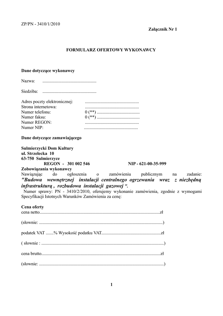 ZP/PN - 3410/1/2010 Załącznik Nr 1 FORMULARZ OFERTOWY WYKONAWCY Dane dotyczące wykonawcy Nazwa: ................................................ Siedziba: ................................................ Adres poczty elektronicznej: Strona internetowa: Numer telefonu: Numer faksu: Numer REGON: Numer NIP: ................................................ ................................................ 0 (**) ...................................... 0 (**) ...................................... ................................................ ................................................ Dane dotyczące zamawiającego Sulmierzycki Dom Kultury ul. Strzelecka 10 63-750 Sulmierzyce REGON - 301 002 546 Zobowiązania wykonawcy Nawiązując do ogłoszenia NIP - 621-00-35-999 o zamówieniu publicznym na zadanie: "Budowa wewnętrznej instalacji centralnego ogrzewania wraz z niezbędną infrastrukturą , rozbudowa instalacji gazowej ". Numer sprawy: PN - 3410/2/2010, oferujemy wykonanie zamówienia, zgodnie z wymogami Specyfikacji Istotnych Warunków Zamówienia za cenę: Cena oferty cena netto...........................................................................................................zł (słownie: ..............................................................................................................) podatek VAT .......% Wysokość podatku VAT.....................................................zł ( słownie : .............................................................................................................) cena brutto..........................................................................................................zł (słownie: ...............................................................................................................) 1 Oświadczam, że: Wykonam zamówienie publiczne w terminie do dnia: ……………………. Termin płatności:...................... dni Okres gwarancji (wyrażony w liczbie miesięcy):............. Reklamacje będą załatwiane w terminie:………….......... .......... dni - sposób zgłaszania problemów w przypadku uzasadnionych reklamacji: .......... .......... .................... .......... .......... .......... .......... .......... .......... .......... .......... .......... .......... .................... .......... .......... .......... .......... .......... .......... - załatwienie wykonania reklamacji: .......... .......... .......... .......... .......... .................... .......... .......... .......... .......... .......... .......... .......... .......... .......... Osoby do kontaktów z Zamawiającym Osoba / osoby do kontakt ów z Zamawiającym odpowiedzialne za wykonanie zobowiązań umowy: .......... .......... .......... .......... .......... .......... .......... .......... .......... tel. kontaktowy, faks: .......... .......... ... zakres odpowiedzialności .......... .......... .......... .......... .......... .......... .......... .......... .......... tel. kontaktowy, faks: .......... .......... ... zakres odpowiedzialności Pełnomocnik w przypadku składania oferty wspólnej Nazwisko, imię .................................................................................................... Stanowisko ........................................................................................................... Telefon...................................................Fax......................................................... Zakres*: - do reprezentowania w postępowaniu - do reprezentowania w postępowaniu i zawarcia umowy - do zawarcia umowy Oświadczenie dotyczące postanowień specyfikacji istotnych warunków zamówienia. 1. Oświadczamy, że zapoznaliśmy się ze specyfikacją istotnych warunków zamówienia, nie wnosimy żadnych zastrzeżeń oraz uzyskaliśmy niezbędne informacje do przygotowania oferty. 2. Oświadczamy, że uważamy się za związanych z ofertą przez czas wskazany w specyfikacji istotnych warunków zamówienia. 3. Poświadczam wniesienie wadium w wysokości 6000,- zł w formie............................................................................................................................... 4. Oświadczamy, że załączone do specyfikacji istotnych warunków zamówienia postanowienia umowy / wzór umowy zostały przez nas zaakceptowane bez zastrzeżeń i zobowiązujemy się w przypadku wyboru naszej oferty do zawarcia umowy w miejscu i terminie wyznaczonym przez Zamawiającego. 2 Dokumenty Na potwierdzenie spełnienia wymagań do oferty załączam: .......... .......... .......... .......... .......... .......... .......... .......... .......... .......... .......... .......... .......... .......... .......... .......... .......... .......... .......... .......... .......... .......... .......... .......... .......... .......... .......... .......... .......... .......... .......... .......... .......... .......... .......... .......... .......... .......... .......... .......... .......... .......... .......... .......... .......... Zabezpieczenie należytego wykonania umowy: w wysokości: 5 % wartości ofertowej brutto tj. ................................................................................zł , w formie................................................................................................................................ Zastrzeżenie wykonawcy Niżej wymienione dokumenty składające się na ofertę nie mogą być ogólnie udostępnione: ……………………………………………………………………………………………… ................................................................................................................................................................ ................................................................................................................................................................ ............................................................