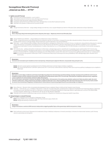 Szczegółowe Warunki Promocji „Internet za ZŁO... – ETTH” 1. Ogólne warunki Promocji 1.1. Promocja trwa od dnia 01.08.2011 r. do 31.10.2011 r. 1.2. Zastrzegamy prawo do skrócenia czasu obowiązywania Promocji. 1.3. Z Promocji może skorzystać wyłącznie Nowy Abonent. 1.4. Integralną częścią Promocji jest Netia Spot, który udostępniamy na warunkach opisanych poniżej. 1.5. Wszystkie ceny podane w dokumencie są cenami brutto. 2. Definicje 2.1. Usługa Internetowa (Internet) – usługa stałego dostępu do internetu, wraz z opcjami Bezpieczny Internet i Wirtualny Dysk, realizowana na łączu Operatora. Komentarz: Wraz z aktywacją Usługi Internetowej jednocześnie włączamy dwie opcje – Bezpieczny Internet oraz Wirtualny Dysk. 2.2. Usługa Telefoniczna (Telefon) – usługa telefoniczna realizowana na łączu Operatora. 2.3. Pakiet – Usługa Internetowa oraz Usługa Telefoniczna zakupione łącznie na warunkach niniejszej Promocji albo zakupienie jednej z Usług wraz z jednoczesnym przedłużeniem Umowy na drugą Usługę; Usługi świadczone są przez Operatora w tej samej lokalizacji. 2.4. Netia Spot – router bezprzewodowy będący własnością Operatora, udostępniony Abonentowi w ramach Umowy o świadczenie usług telekomunikacyjnych w zakresie Usługi Internetowej; w przypadku rozwiązania Umowy przez Abonenta lub Operatora, Abonent zobowiązany jest do odesłania urządzenia, wraz z wszystkimi przekazanymi elementami w stanie nieuszkodzonym, na adres: Internetia Sp. z o.o., ul. Piłsudskiego 49-57, 50-032 Wrocław, w terminie do 14 dni od dnia rozwiązania Umowy. 2.5. Wi-Fi Community – aplikacja domyślnie instalowana na Netia Spot, udostępniająca pasmo częstotliwości na potrzeby innych użytkowników Wi-Fi Community, umożliwiająca korzystanie z udostępnionego pasma w celu uzyskania dostępu do internetu, stworzona przez FON WIRELESS, Ltd., spółkę zarejestrowaną w Wielkiej Brytanii, o numerze 5661131, z siedzibą firmy znajdującą się na 8, Clifford Street, London W1S, 2LQ („Fon”); uruchomienie aplikacji planowane jest na 1 września 2011 r. 2.5.1. W momencie skorzystania z Netia Spot, router w ustawieniach fabrycznych automatycznie tworzy dodatkowy SSID udostępniający łącze członkom Wi-Fi Community. Komentarz: Stworzona sieć zewnętrzna jest niezależna od sieci wewnętrznej, z której korzysta wyłącznie Abonent, oraz posiada niższy priorytet ruchu. 2.5.2. Abonent wyraża zgodę na przekazanie do Fon Wireless informacji na temat miejsca instalacji urządzenia. 2.5.3. Aby zostać pełnoprawnym członkiem społeczności Wi-Fi Community, trzeba dokonać rejestracji Netia Spot za pomocą aplikacji znajdującej się na urządzeniu Netia Spot. Komentarz: Netia Spot to router dający możliwość automatycznej konfiguracji połączenia internetowego oraz łatwej obsługi i prostego rozwiązywania problemów technicznych. Urządzenie oferuje również możliwość korzystania z dodatkowych funkcjonalności (jak np. Wi-Fi Community). Netia Spot jest integralną częścią promocji, rezygnacja i zwrot urządzenia nie oznacza braku naliczania opłaty aktywacyjnej. Wi-Fi Community to sieć ponad 2 milionów hot spotów na całym świecie. Za korzystanie z hot spotów przez członków społeczności Netia nie pobiera opłat. By zostać członkiem społeczności, należy zarejestrować posiadane urządzenie Netia Spot wraz z aktywną aplikacją FON. Informacje dotyczące Wi-Fi Community można znaleźć na stronie www.internetia.pl. Rezygnacji z funkcjonalności można dokonać za pomocą oprogramowania zainstalowanego na urządzeniu. 2.6. Nowy Abonent –Abonent, który nie posiada obowiązującej Umowy w zakresie Usługi, na którą ma być zawarta nowa Umowa. 2.7. Operator – Internetia Sp. z o.o. z siedzibą w Warszawie, ul. Poleczki 13, 02-822 Warszawa, zarejestrowana w Rejestrze Przedsiębiorców Krajowego Rejestru Sądowego prowadzonym przez Sąd Rejonowy dla m.st. Warszawy w Warszawie, XIII Wydział Gospodarczy Krajowego Rejestru Sądowego pod numerem KRS 0000229688, wysokość kapitału zakładowego: 37 469 500 PLN, NIP 526-28-46-048, REGON 140063450. 2.8. Pozostałe terminy pisane wielką literą mają znaczenie określone w Regulaminie Świadczenia Usług przez Spółki Grupy Netia. 3. Usługi dostępne w ramach Promocji 3.1. W ramach niniejszej Promocji oferujemy następujące Usługi: 3.1.1. Usługę Telefoniczną z taryfą Non Stop, Non Stop Świat lub Lepszy Telefon 60. 3.1.2. Usługę Internetową w wariancie MAX. Komentarz: Usługa Internetowa w wariancie MAX oznacza maksymalnie osiągalną prędkość łącza, która gwarantuje stabilne korzystanie z Usługi. 3.2. Brak możliwości technicznych Operatora do świadczenia Usług w lokalizacji wskazanej w Umowie powoduje, iż Umowa nie może zostać zawarta, a jeśli Umowę zawarto, spowoduje jej rozwiązanie. internetia.pl 801 880 150 Szczegółowe Warunki Promocji „Internet za ZŁO... – ETTH” 4. Opłaty abonamentowe 4.1. W ramach niniejszej Promocji obniżamy opłaty abonamentowe za korzystanie z Usług, zgodnie z tabelami poniżej. 4.2. W przypadku wyboru faktury w formie elektronicznej (e-faktury) udzielamy dodatkowego rabatu na abonament za Usługę Internetową w wysokości 5,00 zł w każdym Okresie Rozliczeniowym korzystania z e-faktury, zgodnie z tabelami poniżej. Komentarz: E–faktura, którą wystawia Operator, stanowi dokument księgowy, który ma taką samą wartość jak faktura w wersji papierowej. W przypadku rezygnacji z e-faktury nie będziemy udzielali rabatu w wysokości 5 zł na abonament za Usługę Internetową oraz Usługę Mobilny Internet. 4.3. Dla usług świadczonych w technologii ETTH opłaty abonamentowe wynoszą: 4.3.1. W przypadku Pakietu: Opłata przez pierwsze 3 pełne Okresy Rozliczeniowe Opłata od 4. Okresu Rozliczeniowego Usługa Z rabatem za e-fakturę Bez e-faktury Z rabatem za e-fakturę Bez e-faktury Pakiet z Telefonem Non Sto