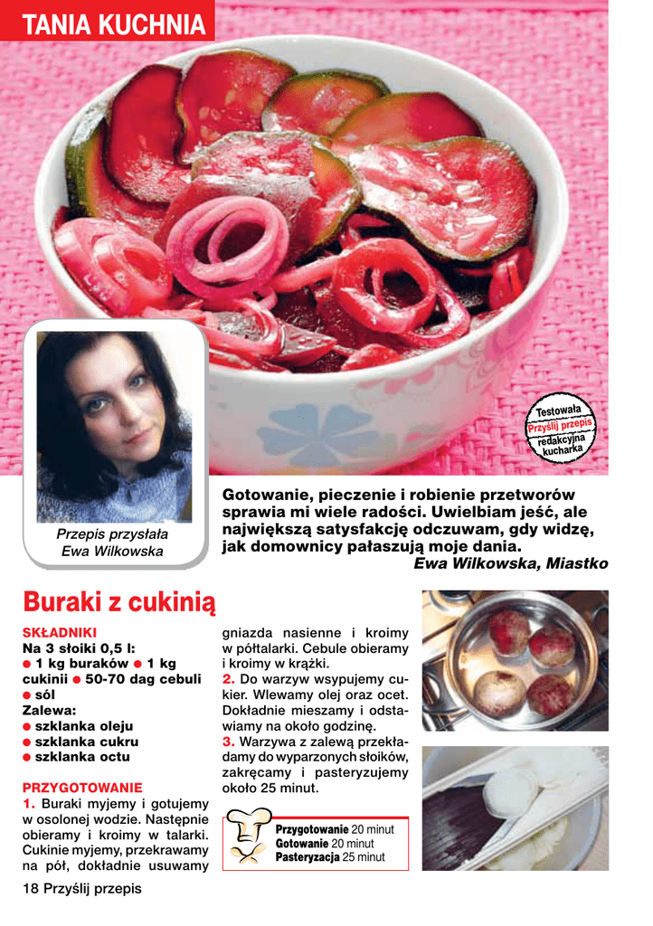 TANIA KUCHNIA Testowała pis Przyślij prze redakcyjna kucharka Przepis przysłała Ewa Wilkowska Gotowanie, pieczenie i robienie przetworów sprawia mi wiele radości. Uwielbiam jeść, ale największą satysfakcję odczuwam, gdy widzę, jak domownicy pałaszują moje dania. Ewa Wilkowska, Miastko Buraki z cukinią SKŁADNIKI Na 3 słoiki 0,5 l: ● 1 kg buraków ● 1 kg cukinii ● 50-70 dag cebuli ● sól Zalewa: ● szklanka oleju ● szklanka cukru ● szklanka octu PRZYGOTOWANIE 1. Buraki myjemy i gotujemy w osolonej wodzie. Następnie obieramy i kroimy w talarki. Cukinie myjemy, przekrawamy na pół, dokładnie usuwamy 18 Przyślij przepis gniazda nasienne i kroimy w półtalarki. Cebule obieramy i kroimy w krążki. 2. Do warzyw wsypujemy cukier. Wlewamy olej oraz ocet. Dokładnie mieszamy i odstawiamy na około godzinę. 3. Warzywa z zalewą przekładamy do wyparzonych słoików, zakręcamy i pasteryzujemy około 25 minut. Przygotowanie 20 minut Gotowanie 20 minut Pasteryzacja 25 minut