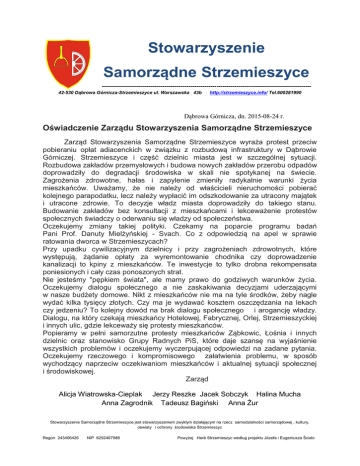 Stowarzyszenie Samorządne Strzemieszyce -------------------------------------------------------------------------------------------------------42-530 Dąbrowa Górnicza-Strzemieszyce ul. Warszawska 43b http://strzemieszyce.info/ Tel.600281990 Dąbrowa Górnicza, dn. 2015-08-24 r. Oświadczenie Zarządu Stowarzyszenia Samorządne Strzemieszyce Zarząd Stowarzyszenia Samorządne Strzemieszyce wyraża protest przeciw pobieraniu opłat adiacenckich w związku z rozbudową infrastruktury w Dąbrowie Górniczej. Strzemieszyce i część dzielnic miasta jest w szczególnej sytuacji. Rozbudowa zakładów przemysłowych i budowa nowych zakładów przerobu odpadów doprowadziły do degradacji środowiska w skali nie spotykanej na świecie. Zagrożenia zdrowotne, hałas i zapylenie zmieniły radykalnie warunki życia mieszkańców. Uważamy, że nie należy od właścicieli nieruchomości pobierać kolejnego parapodatku, lecz należy wypłacić im odszkodowanie za utracony majątek i utracone zdrowie. To decyzje władz miasta doprowadziły do takiego stanu. Budowanie zakładów bez konsultacji z mieszkańcami i lekceważenie protestów społecznych świadczy o oderwaniu się władzy od społeczeństwa. Oczekujemy zmiany takiej polityki. Czekamy na poparcie programu badań Pani Prof. Danuty Mielżyńskiej - Svach. Co z odpowiedzią na apel w sprawie ratowania dworca w Strzemieszycach? Przy upadku cywilizacyjnym dzielnicy i przy zagrożeniach zdrowotnych, które występują, żądanie opłaty za wyremontowanie chodnika czy doprowadzenie kanalizacji to kpiny z mieszkańców. Te inwestycje to tylko drobna rekompensata poniesionych i cały czas ponoszonych strat. Nie jesteśmy "pępkiem świata", ale mamy prawo do godziwych warunków życia. Oczekujemy dialogu społecznego a nie zaskakiwania decyzjami uderzającymi w nasze budżety domowe. Nikt z mieszkańców nie ma na tyle środków, żeby nagle wydać kilka tysięcy złotych. Czy ma je wydawać kosztem oszczędzania na lekach czy jedzeniu? To kolejny dowód na brak dialogu społecznego i arogancję władzy. Dialogu, na który czekają mieszkańcy Hotelowej, Fabrycznej, Orlej, Strzemieszyckiej i innych ulic, gdzie lekceważy się protesty mieszkańców. Popieramy w pełni samorzutne protesty mieszkańców Ząbkowic, Łośnia i innych dzielnic oraz stanowisko Grupy Radnych PiS, które daje szansę na wyjaśnienie wszystkich problemów i oczekujemy wyczerpującej odpowiedzi na zadane pytania. Oczekujemy rzeczowego i kompromisowego załatwienia problemu, w sposób wychodzący naprzeciw oczekiwaniom mieszkańców i aktualnej sytuacji społecznej i środowiskowej. Zarząd Alicja Wiatrowska-Cieplak Jerzy Reszke Jacek Sobczyk Halina Mucha Anna Zagrodnik Tadeusz Bagiński Anna Żur Stowarzyszenie Samorządne Strzemieszyce jest stowarzyszeniem zwykłym działającym na rzecz samodzielności samorządowej , kultury, oświaty i ochrony środowiska Strzemieszyc Regon 243406426 NIP 6292467988 Powyżej Herb Strzemieszyc według projektu Józefa i Eugeniusza Ścisło