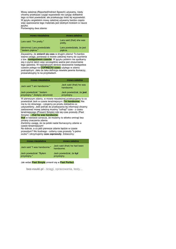 Mowy zależnej (Reported/Indirect Speech) używamy, kiedy chcemy przekazać czyjąś wypowiedź nie cytując dokładnie tego co ktoś powiedział, ale przekazując treść tej wypowiedzi. W języku angielskim mowy zależnej używamy bardzo często więc opanowanie tego materiału jest istotnym krokiem w nauce języka. Porównajmy dwa zdania: mowa niezależna mowa zależna Lara said: "I'm pretty." Lara said (that) she was pretty. (skromna) Lara powiedziała: "Jestem piękna." Lara powiedziała, że jest piękna. Zauważmy, że zmienił się czas w drugim zdaniu! To bardzo ważna uwaga, ponieważ w mowie zależnej mamy do czynienia z tzw. następstwem czasów. W języku polskim nie spotkamy się z czymś takim więc szczególnie ważne jest zrozumienie tego zjawiska. W największym skrócie stosowanie następstwa czasów polega na COFNIĘCIU czasu użytego w zdaniu podrzędnym. Jako że taka definicja niewiele pewnie tłumaczy, przeanalizujmy to na przykładach. mowa niezależna mowa zależna Jack said "I am handsome." Jack said (that) he was handsome. Jack powiedział: "Jestem przystojny." (kolejny skromniś) Jack powiedział, że jest przystojny. W pierwszym zdaniu, w mowie niezależnej przekazujemy to co powiedział Jack w czasie teraźniejszym: I'm handsome. Nie ma tu nic dziwnego - cytujemy po prostu dokładnie co usłyszeliśmy. Jeśli jednak do przekazania tej informacji chcemy zastosować mowę zależną musimy "cofnąć" czas - z czasu teraźniejszego (Present Simple) robi się czas przeszły (Past Simple): ...that he was handsome. that w nawiasie oznacza, że możemy to słówko ominąć bez zmiany znaczenia zdania. Zwróćmy uwagę, że na polski nadal tłumaczymy zdanie w czasie teraźniejszym! No dobrze, a co jeśli pierwsze zdanie będzie w czasie przeszłym? Nic trudnego - cofamy czas przeszły "o jedno oczko" i otrzymujemy czas zaprzeszły. Zobaczmy: mowa niezależna mowa zależna Jack said "I was handsome." Jack said (that) he had been handsome. Jack powiedział: "Byłem przystojny." Jack powiedział, że był przystojny. Jak widać Past Simple zmienił się w Past Perfect. bez-nauki.pl - ściągi, opracowania, testy... Oto zestawienie zmian czasów: mowa niezależna mowa zależna Present Simple » Past Simple » Sue said (that) she didn't like him. » Past Continuous » He said the sun was shining. » Past Perfect Monica said "I wrote a letter." » Monica said she had written a letter. Present Perfect » Past Perfect Sue said "I don't like him." Present Continuous "The sun is shining," he said. Past Simple "I have lost my keys," said Mike. Mike said (that) he had lost his keys. » Present Perfect Continuous » Past Perfect Continuous Mr Brown said "I've been working for this company for » 3 years." Mr Brown said he had been working for that company for 3 years. Future Simple "I will do it tomorrow," said Jenny. » Future in the Past Jenny said she would do it the next day. » Future Continuous » "She will be working on the project tomorrow at 5," said George. » Future Continuous in the Past George said she would be working on the project the next day at 5. Także czasowniki modalne się zmieniają: mowa niezależna mowa zależna will » would can » could may » might shall » should would » would could » could might » might should » should bez-nauki.pl - ściągi, opracowania, testy...