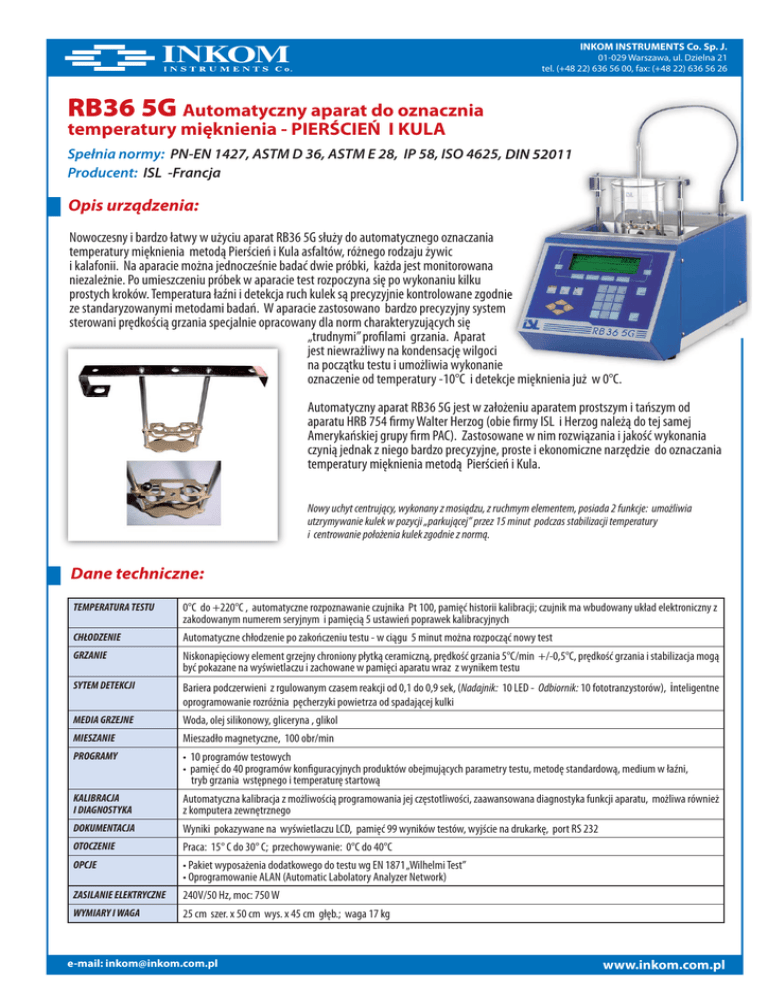 INKOM INSTRUMENTS Co. Sp. J. 01-029 Warszawa, ul. Dzielna 21 tel. (+48 22) 636 56 00, fax: (+48 22) 636 56 26 RB36 5G Automatyczny aparat do oznacznia temperatury mięknienia - PIERŚCIEŃ I KULA Spełnia normy: PN-EN 1427, ASTM D 36, ASTM E 28, IP 58, ISO 4625, DIN 52011 Producent: ISL -Francja Opis urządzenia: Nowoczesny i bardzo łatwy w użyciu aparat RB36 5G służy do automatycznego oznaczania temperatury mięknienia metodą Pierścień i Kula asfaltów, różnego rodzaju żywic i kalafonii. Na aparacie można jednocześnie badać dwie próbki, każda jest monitorowana niezależnie. Po umieszczeniu próbek w aparacie test rozpoczyna się po wykonaniu kilku prostych kroków. Temperatura łaźni i detekcja ruch kulek są precyzyjnie kontrolowane zgodnie ze standaryzowanymi metodami badań. W aparacie zastosowano bardzo precyzyjny system sterowani prędkością grzania specjalnie opracowany dla norm charakteryzujących się „trudnymi” profilami grzania. Aparat jest niewrażliwy na kondensację wilgoci na początku testu i umożliwia wykonanie oznaczenie od temperatury -10°C i detekcje mięknienia już w 0°C. Automatyczny aparat RB36 5G jest w założeniu aparatem prostszym i tańszym od aparatu HRB 754 firmy Walter Herzog (obie firmy ISL i Herzog należą do tej samej Amerykańskiej grupy firm PAC). Zastosowane w nim rozwiązania i jakość wykonania czynią jednak z niego bardzo precyzyjne, proste i ekonomiczne narzędzie do oznaczania temperatury mięknienia metodą Pierścień i Kula. Nowy uchyt centrujący, wykonany z mosiądzu, z ruchmym elementem, posiada 2 funkcje: umożliwia utzrymywanie kulek w pozycji „parkującej” przez 15 minut podczas stabilizacji temperatury i centrowanie położenia kulek zgodnie z normą. Dane techniczne: TEMPERATURA TESTU 0°C do +220°C , automatyczne rozpoznawanie czujnika Pt 100, pamięć historii kalibracji; czujnik ma wbudowany układ elektroniczny z zakodowanym numerem seryjnym i pamięcią 5 ustawień poprawek kalibracyjnych CHŁODZENIE Automatyczne chłodzenie po zakończeniu testu - w ciągu 5 minut można rozpocząć nowy test GRZANIE Niskonapięciowy element grzejny chroniony płytką ceramiczną, prędkość grzania 5°C/min +/-0,5°C, prędkość grzania i stabilizacja mogą być pokazane na wyświetlaczu i zachowane w pamięci aparatu wraz z wynikem testu SYTEM DETEKCJI Bariera podczerwieni z rgulowanym czasem reakcji od 0,1 do 0,9 sek, (Nadajnik: 10 LED - Odbiornik: 10 fototranzystorów), inteligentne oprogramowanie rozróżnia pęcherzyki powietrza od spadającej kulki MEDIA GRZEJNE Woda, olej silikonowy, gliceryna , glikol MIESZANIE Mieszadło magnetyczne, 100 obr/min PROGRAMY • 10 programów testowych • pamięć do 40 programów konfiguracyjnych produktów obejmujących parametry testu, metodę standardową, medium w łaźni, tryb grzania wstępnego i temperaturę startową KALIBRACJA I DIAGNOSTYKA Automatyczna kalibracja z możliwością programowania jej częstotliwości, zaawansowana diagnostyka funkcji aparatu, możliwa również z komputera zewnętrznego DOKUMENTACJA Wyniki pokazywane na wyświetlaczu LCD, pamięć 99 wyników testów, wyjście na drukarkę, port RS 232 OTOCZENIE Praca: 15° C do 30° C; przechowywanie: 0°C do 40°C OPCJE • Pakiet wyposażenia dodatkowego do testu wg EN 1871 „Wilhelmi Test” • Oprogramowanie ALAN (Automatic Labolatory Analyzer Network) ZASILANIE ELEKTRYCZNE 240V/50 Hz, moc: 750 W WYMIARY I WAGA 25 cm szer. x 50 cm wys. x 45 cm głęb.; waga 17 kg e-mail: [email protected] www.inkom.com.pl