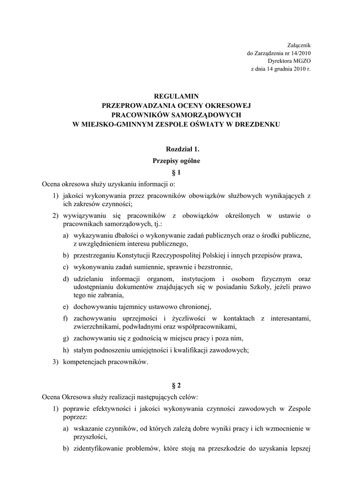 Załącznik do Zarządzenia nr 14/2010 Dyrektora MGZO z dnia 14 grudnia 2010 r. REGULAMIN PRZEPROWADZANIA OCENY OKRESOWEJ PRACOWNIKÓW SAMORZĄDOWYCH W MIEJSKO-GMINNYM ZESPOLE OŚWIATY W DREZDENKU Rozdział 1. Przepisy ogólne §1 Ocena okresowa służy uzyskaniu informacji o: 1) jakości wykonywania przez pracowników obowiązków służbowych wynikających z ich zakresów czynności; 2) wywiązywaniu się pracowników z obowiązków określonych w ustawie o pracownikach samorządowych, tj.: a) wykazywaniu dbałości o wykonywanie zadań publicznych oraz o środki publiczne, z uwzględnieniem interesu publicznego, b) przestrzeganiu Konstytucji Rzeczypospolitej Polskiej i innych przepisów prawa, c) wykonywaniu zadań sumiennie, sprawnie i bezstronnie, d) udzielaniu informacji organom, instytucjom i osobom fizycznym oraz udostępnianiu dokumentów znajdujących się w posiadaniu Szkoły, jeżeli prawo tego nie zabrania, e) dochowywaniu tajemnicy ustawowo chronionej, f) zachowywaniu uprzejmości i życzliwości w kontaktach z interesantami, zwierzchnikami, podwładnymi oraz współpracownikami, g) zachowywaniu się z godnością w miejscu pracy i poza nim, h) stałym podnoszeniu umiejętności i kwalifikacji zawodowych; 3) kompetencjach pracowników. §2 Ocena Okresowa służy realizacji następujących celów: 1) poprawie efektywności i jakości wykonywania czynności zawodowych w Zespole poprzez: a) wskazanie czynników, od których zależą dobre wyniki pracy i ich wzmocnienie w przyszłości, b) zidentyfikowanie problemów, które stoją na przeszkodzie do uzyskania lepszej efektywności pracy; 2) usprawnieniu zarządzania personelem, w tym: a) diagnozowaniu potrzeb i kierunków szkolenia personelu, b) stymulowaniu rozwoju zawodowego pracowników, c) motywowaniu pracowników do poprawy wyników pracy, d) usprawnieniu komunikacji wewnętrznej w Zespole. §3 Użyte w Regulaminie przeprowadzania oceny okresowej pracowników samorządowych w Miejsko-Gminnym Zespole Oświaty określenia, oznaczają: 1) Regulamin – Regulamin przeprowadzania oceny okresowej samorządowych w Miejsko-Gminnym Zespole Oświaty w Drezdenku; pracowników 2) Zespół – Miejsko-Gminny Zespół Oświaty w Drezdenku; 3) Dyrektor – Dyrektor Miejsko-Gminnego Zespołu Oświaty w Drezdenku, 4) Pracownik – pracownik samorządowy Miejsko-Gminnego Zespołu Oświaty w Drezdenku; 5) Kryteria obowiązkowe – wykaz obowiązkowych kryteriów oceny, na podstawie których dokonywana jest ocena okresowa pracownika; 6) Kryteria do wyboru – wykaz kryteriów oceny do wyboru. Kryteria wybrane przez oceniającego z wykazu uzupełniają kryteria obowiązkowe oceny okresowej; 7) Samoocena – samoocena dokonana przez ocenianego przy pomocy Formularza samooceny, której wyniki w trakcie rozmowy oceniającej są przepisywane do Formularza przebiegu rozmowy oceniającej; 8) Ocena przełożonego – ocena przełożonego, której wyniki są w trakcie rozmowy oceniającej wpisywane do Formularza przebiegu rozmowy oceniającej; 9) Ocena końcowa – ocena pracownika uzgodniona z Dyrektorem, której wyniki są wpisywane do Formularza przebiegu rozmowy oceniającej; 10) Ocena okresowa – pozytywna lub negatywna ocena okresowa pracownika kończąca procedurę oceniania, która jest wpisywana do Arkusza oceny okresowej; 11) Oceniający – Dyrektor; 12) Oceniany – pracownik; 13) Rozmowa wstępna – pierwsza rozmowa oceniającego z ocenianym, podczas której oceniany zostaje poinformowany o kryteriach oceny oraz terminach wynikających z procedury oceniania; 14) Rozmowa oceniająca – rozmowa oceniającego z ocenianym mająca na celu dokonanie oceny wykonywania obowiązków służbowych przez pracownika; 15) Formularz przebiegu rozmowy oceniającej – formularz pomocniczy wykorzystywany podczas rozmowy oceniającej oraz w trakcie ustalania ostatecznej oceny pracownika, który przechowuje oceniający; 16) Formularz samooceny – formularz pomocniczy, który wypełnia i przechowuje oceniany; 17) Arkusz oceny okresowej – arkusz oceny okresowej pracownika, który jest włączany do Akt osobowych pracownika. Rozdział 2. Tryb dokonywania oceny okresowej §4 1. Ocena okresowa przeprowadzana jest raz na dwa lata, w okresie od początku stycznia do końca marca, z zastrzeżeniem ust. 2-4. 2. W przypadku usprawiedliwionej nieobecności ocenianego uniemożliwiającej przeprowadzenie procedury oceny w okresie, o którym mowa w ust. 1, oceniający jest zobowiązany wyznaczyć nowy termin sporządzenia oceny. 3. W przypadku usprawiedliwionej nieobecności oceniającego w okresie dokonywania ocen w jego zastępstwie ocenę przeprowadza osoba zastępująca oceniającego lub termin oceny ulega przesunięciu, aż do powrotu oceniającego. Decyzję w tej sprawie podejmuje Dyrektor. 4. W szczególnie uzasadnionych przypadkach Dyrektor może podjąć decyzję o zmianie okresu przeprowadzania ocen pracowników, o którym mowa w ust. 1. §5 1. Ocena okresowa pracownika sporządzana jest na podstawie kryteriów obowiązkowych oraz kryteriów do wyboru (Załączniki nr 1 i 2 do Regulaminu). 2. Oceniający wybiera z wykazu kryteriów do wyboru sześć dodatkowych kryteriów oceny najistotniejszych dla prawidłowego wykonywania obowiązków na stanowisku pracy zajmowanym przez ocenianego. 3. Kryteria do wyboru wpisane przez oceniającego do Części A Arkusza oceny okresowej (Załącznik nr 3 do Regulaminu) podlegają zatwierdzeniu przez Dyrektora. 4. W przypadku otrzymania przez pracownika oceny negatywnej, jego ponowna ocena dokonywana jest według uprzednio wybranych kryteriów. §6 1. Podstawowym elementem oceny pracownika jest rozmowa oceniająca przeprowadzana z pracownikiem przez Dyrektora. 2. W rozmowie oceniającej biorą, z zastrzeżeniem § 12 ust. 5, udział dwie osoby: oceniany i oceniający. 3. Oceniający osobiście informuje ocenianego o terminie rozmowy oceniającej na co najmniej dwa tygodnie przed planowanym spotkaniem. Informacja ta jest