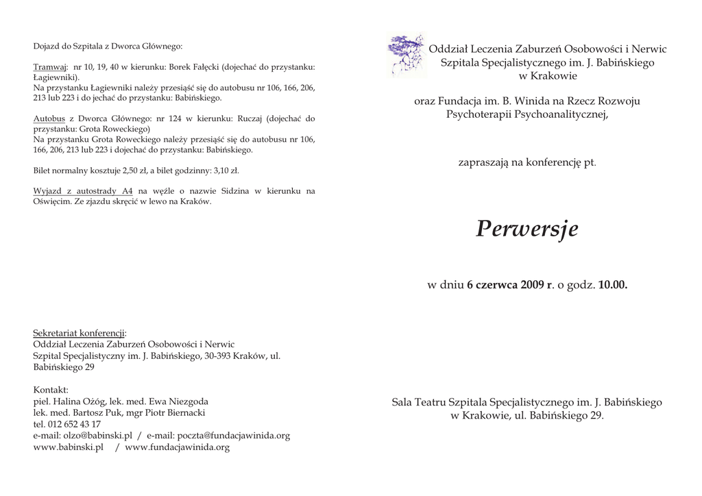 Dojazd do Szpitala z Dworca Głównego: Tramwaj: nr 10, 19, 40 w kierunku: Borek Fałęcki (dojechać do przystanku: Łagiewniki). Na przystanku Łagiewniki należy przesiąść się do autobusu nr 106, 166, 206, 213 lub 223 i do jechać do przystanku: Babińskiego. Autobus z Dworca Głównego: nr 124 w kierunku: Ruczaj (dojechać do przystanku: Grota Roweckiego) Na przystanku Grota Roweckiego należy przesiąść się do autobusu nr 106, 166, 206, 213 lub 223 i dojechać do przystanku: Babińskiego. Bilet normalny kosztuje 2,50 zł, a bilet godzinny: 3,10 zł. Oddział Leczenia Zaburzeń Osobowości i Nerwic Szpitala Specjalistycznego im. J. Babińskiego w Krakowie oraz Fundacja im. B. Winida na Rzecz Rozwoju Psychoterapii Psychoanalitycznej, zapraszają na konferencję pt. Wyjazd z autostrady A4 na węźle o nazwie Sidzina w kierunku na Oświęcim. Ze zjazdu skręcić w lewo na Kraków. Perwersje w dniu 6 czerwca 2009 r. o godz. 10.00. Sekretariat konferencji: Oddział Leczenia Zaburzeń Osobowości i Nerwic Szpital Specjalistyczny im. J. Babińskiego, 30-393 Kraków, ul. Babińskiego 29 Kontakt: piel. Halina Ożóg, lek. med. Ewa Niezgoda lek. med. Bartosz Puk, mgr Piotr Biernacki tel. 012 652 43 17 e-mail: [email protected] / e-mail: [email protected] www.babinski.pl / www.fundacjawinida.org Sala Teatru Szpitala Specjalistycznego im. J. Babińskiego w Krakowie, ul. Babińskiego 29. Osoby prezentujące referaty: Plan konferencji: 9.00. – 10.00. Rejestracja 10.00. – 10.15. Otwarcie konferencji: dyrektor szpitala Marzena Grochowska i ordynator oddziału Ewa Niezgoda. Wprowadzenie: Bartosz Puk. 10.15. – 11.00. Agnieszka Myśliwiec – Ferduła, referat pt. Widzieć – nie widzieć. Przykłady psychicznej korupcji. Prezentacja kliniczna. 11.00. – 11.20. Dyskusja 11.20. – 11.40. Przerwa na kawę. 11.40. – 12.25. Katarzyna Lenda – Woźniak, Ewa Niezgoda, referat pt. Perwersje, jako choroba zakaźna w społeczności szpitala – opis przypadku. 12.25. – 12.45. Dyskusja 12.45. – 13.30. Lunch 13.30. – 14.15. David Morgan, referat pt. Wewnętrzna para a kompleks Edypa w rozwoju identyfikacji seksualnej oraz seksualnej perwersji. (The internal couple and the Oedipus complex in the development of sexual identity and sexual perversion.) 14.15. - 14.35. Dyskusja. 14.35. - 15.20. Tomasz Fortuna, referat pt. Kiedy pojęcia wymykają się swoim znaczeniom - kilka słów o perwersji w relacji terapeutycznej. 15.20. - 16.00. Dyskusja i zamknięcie konferencji – prowadzenie: Bartosz Puk. Agnieszka Myśliwiec – Ferduła, psychoanalityk, członek Polskiego Towarzystwa Psychoanalitycznego, superwizor szkoleniowy Polskiego Towarzystwa Psychoterapii Psychoanalitycznej. Ewa Niezgoda, specjalista psychiatra, psychoterapeuta, superwizor Sekcji Naukowej Psychoterapii Polskiego Towarzystwa Psychiatrycznego; ordynator Oddziału Leczenia Zaburzeń Osobowości i Nerwic. Katarzyna Lenda – Woźniak, psycholog, psychoterapeuta w Oddziale Leczenia Zaburzeń Osobowości i Nerwic. David Morgan, psychoanalityk, psycholog kliniczny, konsultant w Portman Clinic w Londynie, członek Brytyjskiego Towarzystwa Psychoanalitycznego. Tomasz Fortuna, lekarz medycyny w trakcie specjalizacji z psychiatrii, psychoterapeuta; pracuje w Hallwick Specjalistycznym Ośrodku Leczenia Zaburzeń Osobowości Szpitala św. Anny w Londynie oraz na Oddziale Młodzieżowym w klinice Tavistock. Koszt konferencji: 180 zł, dla studentów*: 150 zł. Dla wpłacających do 30 kwietnia: 150 zł, dla studentów*: 120 zł. *studenci szkół wyższych oraz osoby szkolące się w psychoterapii. Opłatę prosimy przesłać na konto: Fundacja im. B. Winida na Rzecz Rozwoju Psychoterapii Psychoanalitycznej 31-061 Kraków, ul. Mostowa 2/13. Nr konta: 92 1500 1142 1211 4005 6976 0000 Dla uczestników konferencji przydzielane będą punkty edukacyjne Komisji Kształcenia Medycznego.