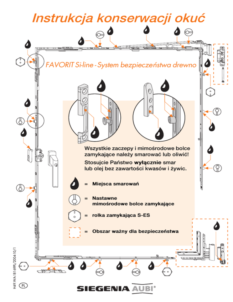 Instrukcja konserwacji okuÌ FAVORIT Si-line - System bezpiecze ństwa drewno Wszystkie zaczepy i mimo⁄rodowe bolce zamykaj¿ce nale¢y smarowaÌ lub oliwiÌ! Stosujcie Paœstwo wy°¿cznie smar lub olej bez zawarto⁄ci kwas†w i ¢ywic. = Miejsca smarowaœ = Nastawne mimo⁄rodowe bolce zamykaj¿ce = rolka zamykaj¿ca S-ES H49.WA-18169PL/2004-10/1 = Obszar wa¢ny dla bezpieczeœstwa PL FAVORIT Si-line System bezpiecze ństwa drewno Okno °ukowe Wszystkie zaczepy i mimo⁄rodowe bolce zamykaj¿ce nale¢y smarowaÌ lub oliwiÌ! Stosujcie Paœstwo wy°¿cznie smar lub olej bez zawarto⁄ci kwas†w i ¢ywic. = Miejsca smarowaœ = Nastawne mimo⁄rodowe bolce zamykaj¿ce = rolka zamykaj¿ca S-ES = Obszar wa¢ny dla bezpieczeœstwa FAVORIT Si-line System bezpiecze ństwa drewno Okno sko⁄ne Wszystkie zaczepy i mimo⁄rodowe bolce zamykaj¿ce nale¢y smarowaÌ lub oliwiÌ! Stosujcie Paœstwo wy°¿cznie smar lub olej bez zawarto⁄ci kwas†w i ¢ywic. = Miejsca smarowaœ = Nastawne mimo⁄rodowe bolce zamykaj¿ce = rolka zamykaj¿ca S-ES = Obszar wa¢ny dla bezpieczeœstwa Zawieszanie skrzyd°a uchylno - rozwiernego 1. Zawieszanie zawiasu ramy Przy zawieszaniu i zdejmowaniu skrzyd°a nale¢y zachowaÌ to samo po°o¢enie! 2. Zawieszanie zawiasu rozw†rki SW 8 UwzglõdniÌ po°o¢enie tulei wzglõdem wrõbu w zawiasie rozw†rki. Tuleja g†rna i dolna powinny byÌ po°o¢one r†wnolegle. Zawieszanie skrzyd°a rozwiernego z dociskiem krytym 1. Zawieszanie zawiasu ramy Przy zawieszaniu i zdejmowaniu skrzyd°a nale¢y zachowaÌ to samo po°o¢enie! 2. Zawieszanie zawiasu rozw†rki SW 8 UwzglõdniÌ po°o¢enie tulei wzglõdem wrõbu w zawiasie rozw†rki. Tuleja g†rna i dolna powinny byÌ po°o¢one r†wnolegle. Nale¢y zwr†ciÌ uwagõ: Okna i drzwi balkonowe wyposa¢one s¿ w wysokowarto⁄ciowe okucia SIEGENIA-AUBI. Aby niezawodne dzia°anie tych okuÌ by°o trwa°e nale¢y co najmniej raz w roku przeprowadziÌ nastõpuj¿ce czynno⁄ci: 1. SmarowaÌ lub oliwiÌ wszystkie ruchome czõ⁄ci oraz miejsca ryglowaœ ( ). 2. StosowaÌ wy°¿cznie smar lub olej bez zawarto⁄ci kwas†w i ¢ywic. 3. SprawdzaÌ wszystkie wa¢ne dla bezpieczeœstwa czõ⁄ci okuÌ ( ) w miejscach ich mocowania. W razie potrzeby w miejscach podatnych na zu¢ycie, dokrõciÌ ⁄ruby mocuj¿ce ewentuelnie wymieniÌ uszkodzone elementy. 4. W przypadku braku os°onek na Paœstwa oknach, proszõ koniecznie sprawdziÌ, czy trzpieœ w zawiasie g†rnym jest wsuniõty od do°u do oporu. 5. Do czyszczenia element†w okien stosowaÌ wy°¿cznie delikatne i pH-neutralne ⁄rodki czyszcz¿ce w formie rozcieœczonej. Nie stosowaÌ nigdy ⁄rodk†w czyszcz¿cych oraz szoruj¿cych zawieraj¿cych kwasy. Ich dzia°anie mo¢e naruszyÌ warstwõ ochronn¿ czõ⁄ci okuÌ. W celu zapobie¢enia zmian w pow°oce okuÌ zalecamy stosowanie ⁄rodk†w ochronnych. 6. Po wcze⁄niejszym oczyszczeniu powierzchni okuÌ proponujemy konserwacjõ olejami obojõtnymi nie zawieraj¿cymi silikon†w np. olej do maszyn do szycia. *UWAGA, grozi skaleczeniem podczas nieprawid°owego dzia°ania okna! W takim przypadku nie nale¢y dalej otwieraÌ okna, lecz zabezpieczyÌ je przed ewentualnym wypadniõciem skrzyd°a. Podane ni¢ej czynno⁄ci powinien wykonaÌ tylko i wy°¿cznie wyspecjalizowany personel: - wymiana czõ⁄ci okuÌ - zawieszanie i zdejmowanie skrzyd°a okiennego - regulacja okuÌ - w szczeg†lno⁄ci w obrõbie zawias†w: skrzyd°a, ramy i rozw†rek Nie wolno stosowaÌ substancji uszczelniaj¿cych/ pianek / silikon†w o odczynie kwa⁄nym lub octowym podczas monta¢u okien. Bezpo⁄redni kontakt z tymi substancjami oraz z jego oparami mog¿ mieÌ niekorzystny wp°yw na pow°okõ zamontowanych w oknie okuÌ. Podczas lakierowania i lazurowania okien i drzwi balkonowych nale¢y zabezpieczyÌ okucia, a przede wszystkim pow°okõ okuÌ przed ewentualnym ich zabrudzeniem. Instrukcja ta obowi¿zuje r†wnie¢ dla odmian okuÌ oraz typ†w okien, kt†re w tej instrukcji nie zosta°y wymienione. Adres producenta okien: Mo¢liwo⁄ci regulacji Nastõpuj¿ce nastawienia okuÌ powinny byÌ wykonane tylko przez wyspecjalizowany zak°ad: Rozw†rka Bolce mimo⁄rodowe Wa¢na wskaz†wka: W zale¢nosci od klasy bezpieczeœstwa regulacja wysoko⁄ci i regulacja boczna moga byÌ ogranicznone. Zawias dowrõbowy skrzyd°a i zawias ramy Bolce mimo⁄rodowe Bolce mimo⁄rodowe Rozw†rka i zawias rozw†rki Rozw†rka i zawias rozw†rki Naro¢nik i zawias ramy Naro¢nik i zawias ramy Najazd i zaczep uchy°u Najazd i zaczep uchy°u Regulowane elementy okuÌ Bolce mimo⁄rodowe Regulacja docisku skrzyd°a ± 1 mm Mo¢liwo⁄Ì regulacji ± 1 mm SW 4 ± 1 mm SW 11 ± 1 mm Regulowane elementy okuÌ Rozw†rka 7 Regulacja boczna ± 2 mm SW 4 Rozw†rka 7 Regulacja docisku ± 1 mm SW 4 Rozw†rka RB Regulacja docisku ± 1 mm SW 4 Regulowane elementy okuÌ Zawias rozw†rki RB Naro¢nik BSU S-ES ... SW 4 Regulacja wysoko⁄ci Regulacja boczna ± 2 mm Mocowanie ± 2 mm SW 2,5 Mocowanie Zawias dowrõbowy skrzyd°a SW 4 Regulacja wysoko⁄ci ± 2 mm Regulacja docisku ± 1 mm SW 10 Zawias ramy Najazd ± 2 mm Regulacja wysoko⁄ci ¨rubokrõt z szeroko⁄ci¿ ostrza max. 4 mm Regulacja boczna ± 2 mm SW 4