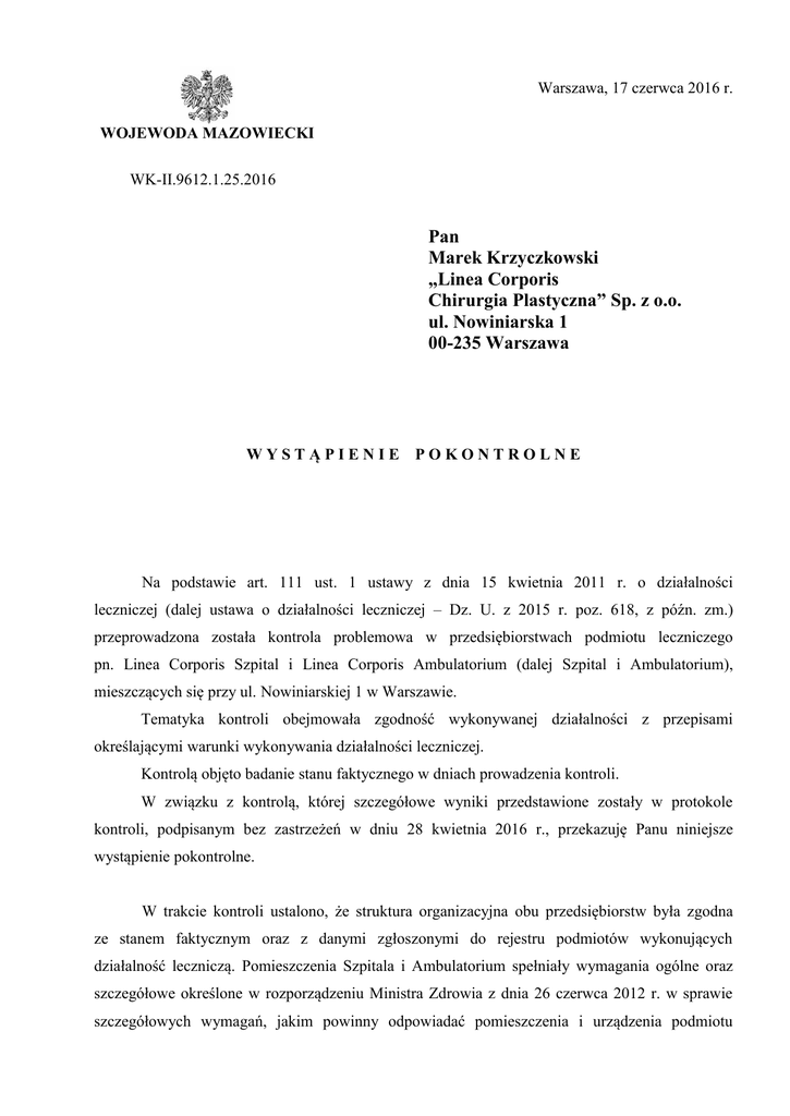 Warszawa, 17 czerwca 2016 r. WOJEWODA MAZOWIECKI WK-II.9612.1.25.2016 Pan Marek Krzyczkowski „Linea Corporis Chirurgia Plastyczna” Sp. z o.o. ul. Nowiniarska 1 00-235 Warszawa WYSTĄPIENIE POKONTROLNE Na podstawie art. 111 ust. 1 ustawy z dnia 15 kwietnia 2011 r. o działalności leczniczej (dalej ustawa o działalności leczniczej – Dz. U. z 2015 r. poz. 618, z późn. zm.) przeprowadzona została kontrola problemowa w przedsiębiorstwach podmiotu leczniczego pn. Linea Corporis Szpital i Linea Corporis Ambulatorium (dalej Szpital i Ambulatorium), mieszczących się przy ul. Nowiniarskiej 1 w Warszawie. Tematyka kontroli obejmowała zgodność wykonywanej działalności z przepisami określającymi warunki wykonywania działalności leczniczej. Kontrolą objęto badanie stanu faktycznego w dniach prowadzenia kontroli. W związku z kontrolą, której szczegółowe wyniki przedstawione zostały w protokole kontroli, podpisanym bez zastrzeżeń w dniu 28 kwietnia 2016 r., przekazuję Panu niniejsze wystąpienie pokontrolne. W trakcie kontroli ustalono, że struktura organizacyjna obu przedsiębiorstw była zgodna ze stanem faktycznym oraz z danymi zgłoszonymi do rejestru podmiotów wykonujących działalność leczniczą. Pomieszczenia Szpitala i Ambulatorium spełniały wymagania ogólne oraz szczegółowe określone w rozporządzeniu Ministra Zdrowia z dnia 26 czerwca 2012 r. w sprawie szczegółowych wymagań, jakim powinny odpowiadać pomieszczenia i urządzenia podmiotu wykonującego działalność leczniczą (Dz. U. z 2012 r. poz. 739). W dokumentacji kontrolowanych placówek zgromadzono dokumenty potwierdzające prawo wykonywania zawodu aktualnie zatrudnionej kadry lekarskiej i pielęgniarskiej. Podmiot posiadał umowę ubezpieczenia odpowiedzialności cywilnej, zgodnie z obowiązkiem ustalonym w art. 25 ust. 1 pkt 1 i ust. 2 ustawy o działalności leczniczej. W Szpitalu i Ambulatorium umieszczono informację o prawach pacjenta, zgodnie z wymogiem określonym w art. 11 ust. 1 ustawy z dnia 6 listopada 2008 r. o prawach pacjenta i Rzeczniku Praw Pacjenta (dalej ustawa o prawach pacjenta i Rzeczniku Praw Pacjenta – Dz. U. z 2016 r. poz. 186). Podmiot dysponował dokumentacją potwierdzającą sprawność techniczną aparatury i sprzętu wykorzystywanego przy udzielaniu świadczeń medycznych, do której posiadania i okazania organowi kontroli jest zobowiązany na podstawie art. 90 ust. 6, 7 i 9 ustawy z dnia 20 maja 2010 r. o wyrobach medycznych (Dz. U. z 2015 r. poz. 876, z późn. zm.). Dokumentacja medyczna przechowywana była zgodnie z normami ustalonymi w rozporządzeniu Ministra Zdrowia z dnia 9 listopada 2015 r. w sprawie rodzajów, zakresu i wzorów dokumentacji medycznej oraz sposobu jej przetwarzania (dalej rozporządzenie w sprawie rodzajów, zakresu i wzorów dokumentacji medycznej – Dz. U. z 2015 r. poz. 2069). W wyniku kontroli stwierdzono następujące nieprawidłowości: 1. Niezgłoszenie zmiany danych do rejestru podmiotów wykonujących działalność leczniczą w zakresie kodów resortowych charakteryzujących funkcje ochrony zdrowia, stanowiących część IX systemu resortowych kodów identyfikacyjnych – dotyczących sali operacyjnej (komórka organizacyjna 002). W sali operacyjnej wykonywane były wyłącznie zabiegi w trybie jednodniowym, a zgodnie z danymi zgłoszonymi do rejestru w Szpitalu powinny być wykonywane również całodobowe świadczenia stacjonarne. Takie działanie stanowi naruszenie art. 107 ust. 1 ustawy o działalności leczniczej, zgodnie z którym wymienione dane podmiot leczniczy zobowiązany był zgłosić do organu rejestrowego w terminie 14 dni od daty powstania zmiany. Jak ustalono na podstawie treści księgi rejestrowej, podmiot zgłosił do organu prowadzącego rejestr ww. zmianę. Wobec powyższego odstępuje się od sformułowania zalecenia pokontrolnego. 2. Nieustalenie regulaminu organizacyjnego podmiotu leczniczego, co jest niezgodne z art. 23 ustawy o działalności leczniczej. 3. Niezaopatrywanie pacjentów Szpitala w znaki identyfikacyjne, co stanowi naruszenie obowiązku ustalonego w art. 36 ust. 3 ustawy o działalności leczniczej. 2 4. Niewypełnienie obowiązku polegającego na noszeniu przez pracowników Szpitala identyfikatorów zawierających imię i nazwisko oraz pełnioną funkcję. Takim działaniem naruszono normę ustaloną w art. 36 ust. 1 ustawy o działalności leczniczej. 5. Niezamieszczenie w miejscu udzielania świadczeń zdrowotnych oraz na stronie internetowej placówki informacji o wysokości opłat za udostępnienie dokumentacji medycznej, co stanowi naruszenie art. 24 ust. 2 ustawy o działalności leczniczej. 6. Nieprowadzenie w Szpitalu Księgi głównej przyjęć i wypisów, Księgi chorych oddziału oraz Księgi zabiegów, a w Ambulatorium – Księgi przyjęć, co jest niezgodne z § 38 ust. 1 pkt 2 lit. a, c-d oraz § 39 pkt 3 lit. a rozporządzenia w sprawie rodzajów, zakresu i wzorów dokumentacji medycznej. 7. Nieprawidłowe prowadzenie zbiorczej dokumentacji medycznej – Księga sali operacyjnej nie zawierała kodu resortowego komórki organizacyjnej, w której pacjent przebywał, a także oznaczenia lekarza kierującego na zabieg albo operację, lekarza kwalifikującego pacjenta do zabiegu albo operacji, lekarza anestezjologa oraz osób wchodzących w skład zespołu operacyjnego i zespołu anestezjologicznego, w zakresie tytułu zawodowego, uzyskanych specjalizacji i numeru prawa wykonywania zawodu, co jest niezgodne z § 33 pkt 4, 6-7 oraz 12-13 rozporządzenia w sprawie rodzajów, zakresu i wzorów dokumentacji medycznej. 8. Nieprawidłowe prowadzenie indywidualnej dokumentacji medycznej. Sprawdzono dokumentację 50 pacjentów (20 Historii Choroby pacjentów Szpitala oraz 30 Historii Zdrowia i Choroby pacjentów Ambulatorium), stwierdzając: a) we wszystkich przypadkach – brak numerowania stron dokumentacji, oraz w 4 Historiach Zdrowia i Choroby – również oznaczenia ka