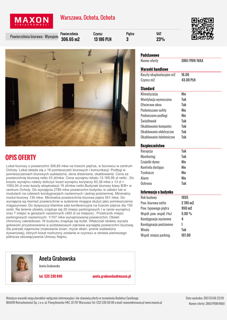 Warszawa, Ochota, Ochota Powierzchnia biurowa - Wynajem Powierzchnia 306.65 m2 Czynsz 13 186 PLN Piętro VAT 3 23% Podstawowe Numer oferty 2861/PBW/MAX Warunki handlowe Koszty eksploatacyjne m2 16.00 Czynsz m2 43.00 PLN Standard Klimatyzacja Nie Wentylacja wymuszona Tak Otwierane okna Tak Podwieszane sufity Nie Podnoszone podłogi Nie Światłowód Tak Okablowanie komputer. Tak Okablowanie elektryczne Tak Okablowanie telefoniczne Tak Bezpieczeństwo OPIS OFERTY Lokal biurowy o powierzchni 306,65 mkw na trzecim piętrze, w biurowcu w centrum Ochoty. Lokal składa się z 19 pomieszczeń biurowych i komunikacji. Podłogi w pomieszczeniach biurowych wykładzina, okna drewniane, okablowanie. Cena za powierzchnię biurową netto 43 zł/mkw. Cena wynajmu lokalu 13.185,95 zł netto . Do kosztu wynajmu należy doliczyć koszt wynajmu korytarzy 83,38 mkw x 13 zł = 1083,94 zł oraz koszty eksploatacji 16 zł/mkw netto.Budynek biurowy klasy B/B+ w centrum Ochoty. Do wynajęcia 2785 mkw powierzchni budynku w całości lub w modułach na czterech kondygnacjach naziemnych i jednej podziemnej. Minimalny moduł biurowy 130 mkw. Minimalna powierzchnia biurowa piętra 551 mkw. Do wynajęcia są również powierzchnie w suterenie mogące służyć jako pomieszczenia magazynowe. Do dyspozycji klientów sala konferencyjna na trzecim piętrze dla 150 osób. Na terenie obiektu znajduje się 20 miejsc parkingowych ( w cenie wynajmu) oraz 7 miejsc w garażach naziemnych (400 zł za miejsce) . Przelicznik miejsc parkingowych naziemnych: 1/107 mkw wynajmowanej powierzchni. Obiekt chroniony całodobowo. W budynku znajduje się bufet. Właściciel obiektu wyraża gotowość przystosowania w podstawowym zakresie wynajętej powierzchni biurowej dla potrzeb najemców (malowanie ścian, mycie okien, pranie wykładziny dywanowej), których koszt rozliczony zostanie w czynszu w okresie pierwszego półrocza obowiązywania Umowy Najmu. Recepcja Tak Monitoring Tak Czujniki dymu Nie Kontrola dostępu Nie Tryskacze Nie Alarm Nie Ochrona Tak Informacje o budynku Rok budowy 1955 Pow. biurowa netto 2 785 m2 Pow. typowego piętra 950 m2 Współ. pow. wspól. (%) 5.00 % Kondygnacje naziemne 4 Kondygnacje podziemne 1 Winda Tak Współ. miejsc parking. 107.00 Aneta Grabowska Aneta Grabowska tel. 525 230 840 [email protected] Niniejsze warunki mają charakter wyłącznie informacyjny i nie stanowią oferty w rozumieniu Kodeksu Cywilnego. MAXON Nieruchomości Sp. z o o. ul. Powązkowska 44C, 01-797 Warszawa Tel: (22) 530 60 00 e-mail: [email protected] www.maxon.pl Data wydruku: 2017-03-06 22:59 Numer oferty: 2861/PBW/MAX