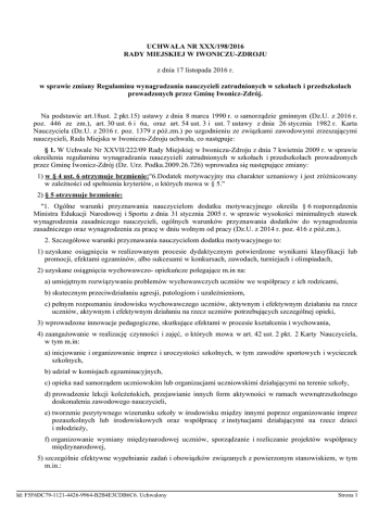 UCHWAŁA NR XXX/198/2016 RADY MIEJSKIEJ W IWONICZU-ZDROJU z dnia 17 listopada 2016 r. w sprawie zmiany Regulaminu wynagradzania nauczycieli zatrudnionych w szkołach i przedszkolach prowadzonych przez Gminę Iwonicz-Zdrój. Na podstawie art.18ust. 2 pkt.15) ustawy z dnia 8 marca 1990 r. o samorządzie gminnym (Dz.U. z 2016 r. poz. 446 ze zm.), art. 30 ust. 6 i 6a, oraz art. 54 ust. 3 i ust. 7 ustawy z dnia 26 stycznia 1982 r. Karta Nauczyciela (Dz.U. z 2016 r. poz. 1379 z póź.zm.) po uzgodnieniu ze związkami zawodowymi zrzeszającymi nauczycieli, Rada Miejska w Iwoniczu-Zdroju uchwala, co następuje: § 1. W Uchwale Nr XXVII/222/09 Rady Miejskiej w Iwoniczu-Zdroju z dnia 7 kwietnia 2009 r. w sprawie określenia regulaminu wynagradzania nauczycieli zatrudnionych w szkołach i przedszkolach prowadzonych przez Gminę Iwonicz-Zdrój (Dz. Urz. Podka.2009.26.726) wprowadza się następujące zmiany: 1) w § 4 ust. 6 otrzymuje brzmienie:"6.Dodatek motywacyjny ma charakter uznaniowy i jest zróżnicowany w zależności od spełnienia kryteriów, o których mowa w § 5." 2) § 5 otrzymuje brzmienie: "1. Ogólne warunki przyznawania nauczycielom dodatku motywacyjnego określa § 6 rozporządzenia Ministra Edukacji Narodowej i Sportu z dnia 31 stycznia 2005 r. w sprawie wysokości minimalnych stawek wynagrodzenia zasadniczego nauczycieli, ogólnych warunków przyznawania dodatków do wynagrodzenia zasadniczego oraz wynagrodzenia za pracę w dniu wolnym od pracy (Dz.U. z 2014 r. poz. 416 z póź.zm.). 2. Szczegółowe warunki przyznawania nauczycielom dodatku motywacyjnego to: 1) uzyskane osiągnięcia w realizowanym procesie dydaktycznym potwierdzone wynikami klasyfikacji lub promocji, efektami egzaminów, albo sukcesami w konkursach, zawodach, turniejach i olimpiadach, 2) uzyskane osiągnięcia wychowawczo- opiekuńcze polegające m.in na: a) umiejętnym rozwiązywaniu problemów wychowawczych uczniów we współpracy z ich rodzicami, b) skutecznym przeciwdziałaniu agresji, patologiom i uzależnieniom, c) pełnym rozpoznaniu środowiska wychowawczego uczniów, aktywnym i efektywnym działaniu na rzecz uczniów, aktywnym i efektywnym działaniu na rzecz uczniów potrzebujących szczególnej opieki, 3) wprowadzone innowacje pedagogiczne, skutkujące efektami w procesie kształcenia i wychowania, 4) zaangażowanie w realizację czynności i zajęć, o których mowa w art. 42 ust. 2 pkt. 2 Karty Nauczyciela, w tym m.in: a) inicjowanie i organizowanie imprez i uroczystości szkolnych, w tym zawodów sportowych i wycieczek szkolnych, b) udział w komisjach egzaminacyjnych, c) opieka nad samorządem uczniowskim lub organizacjami uczniowskimi działającymi na terenie szkoły, d) prowadzenie lekcji koleżeńskich, przejawianie innych form aktywności w ramach wewnątrzszkolnego doskonalenia zawodowego nauczycieli, e) tworzenie pozytywnego wizerunku szkoły w środowisku między innymi poprzez organizowanie imprez pozaszkolnych lub środowiskowych oraz współpracę z instytucjami działającymi na rzecz dzieci i młodzieży, f) organizowanie wymiany międzynarodowej uczniów, sporządzanie i rozliczanie projektów współpracy międzynarodowej, 5) szczególnie efektywne wypełnianie zadań i obowiązków związanych z powierzonym stanowiskiem, w tym m.in.: Id: F5F6DC79-1121-4426-9964-B2B4E3CDB6C6. Uchwalony Strona 1 a) systematyczne i rzetelne przygotowywanie się do przydzielonych obowiązków, b) podnoszenie kwalifikacji i umiejętności szkolnych, c) wzbogacanie własnego warsztatu pracy, d) dbałość o estetykę powierzonych pomieszczeń i sprawność pomocy dydaktycznych oraz urządzeń szkolnych, 6) aktywna działalność w strukturach związków zawodowych zrzeszających nauczycieli i pracowników oświaty. 3. Warunkiem przyznania dodatku motywacyjnego dla dyrektorów szkół jest odpowiednie realizowanie zadań edukacyjnych, wynikających z przyjętych przez organ prowadzący priorytetów w realizowanej lokalnej polityce oświatowej, w szczególności poprzez: 1) stałe podnoszenie jakości pracy szkoły, 2) dbałość o tworzenie pozytywnego wizerunku szkoły w środowisku, 3) organizowanie pracy szkoły zapewniającej bezpieczne i higieniczne warunki nauki i pracy, 4) prowadzenie polityki finansowej i kadrowej szkoły zgodnie z obowiązującym prawem oraz przestrzeganie dyscypliny finansów publicznych, 5) celowe i oszczędne wydatkowanie środków oraz racjonalne gospodarowanie majątkiem, 6) podejmowanie działań zmierzających do pozabudżetowych środków finansowych." wzbogacenia majątku szkoły, w tym pozyskiwania 3) § 7 otrzymuje brzmienie:" Nauczycielom realizującym dodatkowe zadania oraz zajęcia, przysługuje dodatek funkcyjny z tym, że nauczycielowi, któremu powierzono: 1) wychowawstwo klasy lub oddziału przedszkolnego liczącej poniżej 20 uczniów lub dzieci w kwocie 140,00 zł za jedną klasę lub oddział, 2) wychowawstwo klasy lub oddziału przedszkolnego liczącej od 20 i więcej uczniów lub dzieci w kwocie 160,00 zł za jedna klasę lub oddział, 3) funkcję opiekuna stażu nauczyciela stażysty lub nauczyciela kontraktowego w kwocie 100,00 zł." 4) w § 14 ust. 1 otrzymuje brzmienie :"1. Nauczycielowi zatrudnionemu w wymiarze nie niższym niż połowa tygodniowego obowiązkowego wymiaru godzin w szkołach prowadzonych przez Gminę IwoniczZdrój i posiadającemu kwalifikacje wymagane do zajmowanego stanowiska przysługuje nauczycielski dodatek mieszkaniowy uzależniony od stanu rodzinnego, zwany dalej ”dodatkiem„ wypłacany co miesiąc z dołu w wysokości: 1) przy 1 osobie w rodzinie - 1 zł, 2) przy 2 osobach w rodzinie - 3 zł, 3) przy 3 i więcej osobach w rodzinie - 5 zł." 5) w § 16 ust.3 pkt.a) otrzymuje brzmienie: "a) do 2 500,00 zł - w przypadku przyznania nauczycielowi nagrody Burmistrza", § 2. Wykonanie uchwały powierza się Burmistrzowi Gminy oraz Dyrektorom szkół. Id: F5F6DC79-1121-4426-9964-B2B4E3CDB6C6. Uchwalony Strona 2 § 3. Uchwała wch