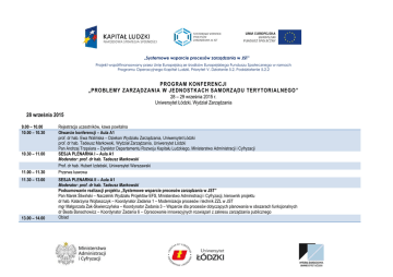 „Systemowe wsparcie procesów zarządzania w JST” Projekt współfinansowany przez Unię Europejską ze środków Europejskiego Funduszu Społecznego w ramach Programu Operacyjnego Kapitał Ludzki, Priorytet V, Działanie 5.2, Poddziałanie 5.2.2 PROGRAM KONFERENCJI „PROBLEMY ZARZĄDZANIA W JEDNOSTKACH SAMORZ ĄDU TERYTORIALNEGO ” 28 – 29 września 2015 r. Uniwersytet Łódzki, Wydział Zarządzania 28 września 2015 9.00 – 10.00 10.00 – 10.30 10.30 – 11.00 11.00 – 11.30 11.30 – 13.00 13.00 – 14.00 Rejestracja uczestników, kawa powitalna Otwarcie konferencji – Aula A1 prof. dr hab. Ewa Walińska – Dziekan Wydziału Zarządzania, Uniwersytet Łódzki prof. dr hab. Tadeusz Markowski, Wydział Zarządzania, Uniwersytet Łódzki Pan Andrzej Trzęsiara – Dyrektor Departamentu Rozwoju Kapitału Ludzkiego, Ministerstwo Administracji i Cyfryzacji SESJA PLENARNA I – Aula A1 Moderator: prof. dr hab. Tadeusz Markowski Prof. dr hab. Hubert Izdebski, Uniwersytet Warszawski Przerwa kawowa SESJA PLENARNA II – Aula A1 Moderator: prof. dr hab. Tadeusz Markowski Podsumowanie realizacji projektu „Systemowe wsparcie procesów zarządzania w JST” Pan Marek Śliwiński – Naczelnik Wydziału Projektów EFS, Ministerstwo Administracji i Cyfryzacji, kierownik projektu dr hab. Katarzyna Wojtaszczyk – Koordynator Zadania 1 – Modernizacja procesów i technik ZZL w JST mgr Małgorzata Żak-Skwierczyńska – Koordynator Zadania 3 – Wsparcie dla procesów dotyczących planowania w obszarach funkcjonalnych dr Beata Banachowicz – Koordynator Zadania 6 – Opracowanie innowacyjnych rozwiązań z zakresu zarządzania publicznego Obiad „Systemowe wsparcie procesów zarządzania w JST” Projekt współfinansowany przez Unię Europejską ze środków Europejskiego Funduszu Społecznego w ramach Programu Operacyjnego Kapitał Ludzki, Priorytet V, Działanie 5.2, Poddziałanie 5.2.2 14.00 – 15.00 15.15 – 16.45 SESJA PLENARNA III – Aula A1 Moderator: Prof. dr hab. Hubert Izdebski Prof. dr hab. Jerzy Stępień, Sędzia Trybunału Konstytucyjnego w stanie spoczynku, Prorektor Uczelni Łazarskiego Prof. dr hab. Tadeusz Markowski, Uniwersytet Łódzki SESJA PANELOWA I – sala 106 SESJA PANELOWA II – sala 109 ZARZĄDZANIE ZASOBAMI LUDZKIMI INNOWACJE W ZARZĄDZANIU PUBLICZNYM Moderator: dr hab. Katarzyna Wojtaszczyk dr Marzena Syper-Jędrzejczak, mgr Anna Michałkiewicz Uniwersytet Łódzki, „Efektywne zarządzanie zasobami ludzkimi w JST – wybrane praktyki” mgr Izabela Różańska-Bińczyk, Uniwersytet Łódzki, „Kierunki zmian w obszarze pozyskiwania pracowników w wybranych jednostkach samorządu terytorialnego” mgr Paweł Łuczak, Uniwersytet Łódzki „Rozwój zasobów ludzkich w JST” 16.45 – 17.15 19.00 – 22.00 Dyskusja Uroczysta kolacja Moderator: prof. UJK dr hab. Piotr Bury dr Małgorzata Kołodziejczak, dr Maciej Malarski, Uniwersytet Łódzki, „Kultura organizacyjna w JST” dr Magdalena Wiśniewska, Uniwersytet Łódzki, „Organizacje pozarządowe jako interesariusze jednostek samorządu terytorialnego – formalnoprawne ramy współpracy i wyniki badań” dr Monika Stachowicz, Uniwersytet Jana Kochanowskiego w Kielcach, „Holding jako forma organizacji usług komunalnych na przykładzie HOLDIKOM S.A. w Ostrowie Wielkopolskim” SESJA PANELOWA III – sala 206 WSPARCIE DLA PROCESÓW DOT. PLANOWANIA W OBSZARACH FUNKCJONALNYCH Moderator: prof. dr hab. Tadeusz Markowski dr Piotr Żuber, Strategia Rozwoju WarszawskoŁódzkiego Obszaru Funkcjonalnego – prezentacja dokumentu „Systemowe wsparcie procesów zarządzania w JST” Projekt współfinansowany przez Unię Europejską ze środków Europejskiego Funduszu Społecznego w ramach Programu Operacyjnego Kapitał Ludzki, Priorytet V, Działanie 5.2, Poddziałanie 5.2.2 29 września 2015 8.00 – 9.00 9.00 – 10.30 10.30 – 11.00 Rejestracja uczestników SESJA PANELOWA IV – sala 106 ZARZĄDZANIE ZASOBAMI LUDZKIMI SESJA PANELOWA V – sala 109 INNOWACJE W ZARZĄDZANIU PUBLICZNYM Moderator: prof. dr hab. Zdzisława Janowska Moderator: dr Agata Bury Agnieszka Piotrowska-Piątek, Urząd Statystyczny dr hab. Katarzyna Wojtaszczyk, Uniwersytet Łódzki, w Kielcach, „Standardy obsługi klienta w „Potrzeby szkoleniowe realizatorów zarzadzania jednostkach administracji publicznej na zasobami ludzkimi w jednostkach samorządu przykładzie Urzędu Statystycznego w Kielcach” terytorialnego” dr Anna Wasiak, Uniwersytet Łódzki, dr hab. Joanna Cewińska, dr Małgorzata Striker „Administrowanie czy zarządzanie w jednostkach Uniwersytet Łódzki, „Ewaluacja szkolenia „Procesy i samorządowej pomocy społecznej” techniki zarządzania zasobami ludzkimi w jednostkach samorządu terytorialnego”: przebieg, wyniki i wnioski” dr hab. Joanna Cewińska, dr Małgorzata Striker Uniwersytet Łódzki „Podnoszenie kwalifikacji zawodowych pracowników jednostek samorządu terytorialnego – analiza dotychczasowych rozwiązań i propozycje zmian zgłaszane przez uczestników projektu „Systemowe wsparcie procesów zarządzania w JST ” Przerwa kawowa SESJA PANELOWA VI – sala 206 WSPARCIE DLA PROCESÓW DOT. PLANOWANIA W OBSZARACH FUNKCJONALNYCH Moderator: Prof. dr hab. Aleksandra Nowakowska dr Zbigniew Przygodzki, Uniwersytet Łódzki, „Integracja procesu planowania rozwoju, uwagi metodyczne i sposoby wdrażania planowania zintegrowanego” dr Ewa Jastrzębska, dr Paulina LegutkoKobus, Szkoła Główna Handlowa w Warszawie, „Partycypacja w ramach obszarów funkcjonalnych (przykład Metropolii Poznań)” Dariusz Kantor, Urząd Miasta KędzierzynKoźle, „Planowanie rozwoju Subregionu Kędzierzyn-Koźle” „Systemowe wsparcie procesów zarządzania w JST” Projekt współfinansowany przez Unię Europejską ze środków Europejskiego Funduszu Społecznego w ramach Programu Operacyjnego Kapitał Ludzki, Priorytet V, Działanie 5.2, Poddziałanie 5.2.2 11.00 – 12.30 12.30 – 12.45 12.45 