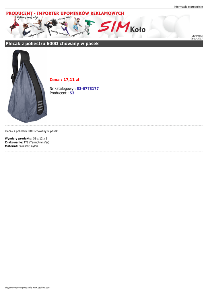 Informacje o produkcie Utworzono 06-03-2017 Plecak z poliestru 600D chowany w pasek Cena : 17,11 zł Nr katalogowy : S3-6778177 Producent : S3 Plecak z poliestru 600D chowany w pasek Wymiary produktu: 59 x 12 x 2 Znakowanie: TT2 (Termotransfer) Materiał: Poliester, nylon Wygenerowano w programie www.oscGold.com