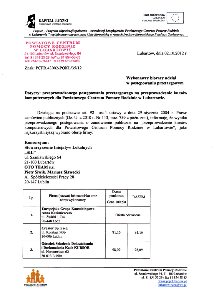 komputcrowych dla Powiatowęo Centnrm Ponocy Rodzinie v Lubartowie.