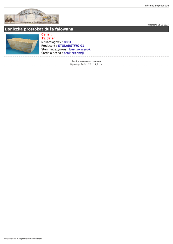 Informacje o produkcie Utworzono 06-03-2017 Doniczka prostokąt duża falowana Cena : 19,87 zł Nr katalogowy : 8881 Producent : STOLARSTWO 01 Stan magazynowy : bardzo wysoki Średnia ocena : brak recenzji Donica wykonana z drewna. Wymiary: 34,5 x 17 x 12,5 cm. Wygenerowano w programie www.oscGold.com