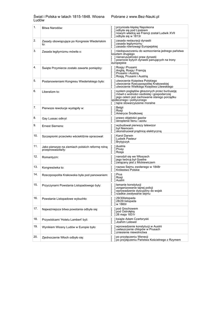 Świat i Polska w latach 1815-1848. Wiosna Ludów Pobrane z www.Bez-Nauki.pl 1. Bitwa Narodów: 2. Zasady obowiązujące po Kongresie Wiedeńskim to: 3. Zasada legitymizmu mówiła o: 4. Święte Przymierze zostało zawarte pomiędzy: 5. Postanowieniami Kongresu Wiedeńskiego było: 6. Liberalizm to: 7. Pierwsze rewolucje wystąpiły w: 8. Gay Lussac odkrył: 9. Ernest Siemens: 10. Szczepionki przeciwko wściekliźnie opracował: 11. Jako pierwsze na ziemiach polskich reformę rolną przeprowadziła/ły: 12. Romantyzm: 13. Kongresówka to: 14. Rzeczpospolita Krakowska była pod panowaniem: 15. Przyczynami Powstania Listopadowego były: 16. Powstanie Listopadowe wybuchło: 17. Najważniejsza bitwa powstania odbyła się: 18. Przywódcami 'Hotelu Lambert' byli: 19. Wynikiem Wiosny Ludów w Europie było: 20. Zjednoczenie Włoch odbyło się: [ ] przyniosła klęskę Napoleona [ ] odbyła się pod Lipskiem [ ] nowym władcą we Francji został Ludwik XVII [ ] odbyła się w 1813r [ ] zasada restauracji dynastii [ ] zasada legitymizmu [ ] zasada równowagi Europejskiej [ ] niedopuszczeniu do wzmocnienia jednego państwa kosztem drugiego [ ] nienaruszalności praw dynastii [ ] powrocie byłych dynastii panujących na trony europejskie [ ] Rosją i Prusami [ ] Anglią, Rosją i Francją [ ] Prusami i Austrią [ ] Rosją, Prusami i Austrią [ ] utworzenie Księstwa Polskiego [ ] utworzenie Rzeczpospolitej Krakowskiej [ ] utworzenie Wielkiego Księstwa Litewskiego [ ] system poglądów głoszonych przez burżuazję [ ] mówił o wolności osobistej i gospodarczej [ ] jego celem jest zachowanie starego porządku społecznego i politycznego [ ] tajne stowarzyszenie moralne [ ] Belgii [ ] Rosji [ ] Ameryce Środkowej [ ] prawo objętości gazów [ ] skroplenie tlenu i azotu [ ] wybudował pierwszy telewizor [ ] był Niemcem [ ] skonstruował prądnicę elektryczną [ ] Karol Darwin [ ] Ludwik Pasteur [ ] Brytyjczyk [ ] Austria [ ] Prusy [ ] Rosja [ ] narodził się we Włoszech [ ] jego twórcą był Goethe [ ] związany jest z Mickiewiczem [ ] nazwa Sejmu zwołanego w 1848r [ ] Królestwo Polskie [ ] Prus [ ] Rosji [ ] Austrii [ ] łamanie konstytucji [ ] zorganizowanie tajnej policji [ ] wprowadzenie dyscypliny do wojsk [ ] rzadkie zwoływanie sejmu [ ] 29/30listopada [ ] 28/29 listopada [ ] w 1860r [ ] pod Grochowem [ ] pod Ostrołęką [ ] 26 maja 1831r [ ] książe Adam Czartoryski [ ] Joahim Lelewel [ ] wprowadzenie konstytucji w Austrii [ ] uwłaszczenie chłopów w Prusach [ ] zniesienie niewolnictwa [ ] po przyłączeniu Wenecji [ ] po przyłączeniu Państwa Kościelnego z Rzymem Poprawne odpowiedzi 1. 3. 5. 7. 9. 11. 13. 15. 17. 19. przyniosła klęskę Napoleona, odbyła się pod Lipskiem, odbyła się w 1813r nienaruszalności praw dynastii utworzenie Rzeczpospolitej Krakowskiej 2. Belgii, Ameryce Środkowej był Niemcem, skonstruował prądnicę elektryczną Prusy 8. zasada restauracji dynastii, zasada legitymizmu, zasada równowagi Europejskiej Rosją, Prusami i Austrią system poglądów głoszonych przez burżuazję, mówił o wolności osobistej i gospodarczej prawo objętości gazów 10. Ludwik Pasteur 12. Królestwo Polskie łamanie konstytucji, zorganizowanie tajnej policji, wprowadzenie dyscypliny do wojsk, rzadkie zwoływanie sejmu pod Ostrołęką, 26 maja 1831r uwłaszczenie chłopów w Prusach 14. 16. jego twórcą był Goethe, związany jest z Mickiewiczem Austrii 29/30listopada 18. książe Adam Czartoryski 20. po przyłączeniu Wenecji, po przyłączeniu Państwa Kościelnego z Rzymem 4. 6.