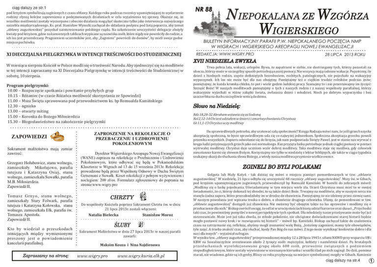 ciąg dalszy ze str.1 podkrzyż emsymbolizujązaginionychzczasuobławy.Każ degorokupodczasrocznicyupamiętniającejtowydarzenie rodziny słyszą kolejne zapewnienia o podejmowanych działaniach w celu wyjaś nienia tej sprawy. Okazuje się, ż e wszelkiemoż liwoś cizostaływyczerpaneiobecniedziałaniamogąbyć skutecznetylkojakointerwencjanajwyż szego szczeblamiędzyrządowego.Ks.prał.StanisławWysockizachęcałdoskładaniapodpisupodlistąpoparcia,abytemat „obławyaugustowskiej”pozyskałzainteresowaniepolskiegorządu.Nazakoń czenieuroczystoś cidelegacjezłoż yły kwiatypodkrzyż em,gdzienakamiennychtablicachwypisanesąnazwiskaosó b,któ renigdyniepowró ciłydorodzin,a ichlosjestprzemilczany.Pragnieniemuczestnikó wjest,aby„Zaginieni”powró cilidodomó w”,bymieliswojegodne miejscepochó wku. NR 88 XIDIECEZJALNAPIELGRZYMKAWINTENCJITREŚCIWOŚCIDOSTUDZIENICZNEJ REDAKCJA: WWW.WIGRY.PRO WmiesiącusierpniuKoś ció łwPolscemodlisięotrzeź woś ćNarodu.Abyzjednoczyć sięnamodlitwie wtejintencjizapraszamynaXIDiecezjalnaPielgrzymkęwintencjitreś ciwoś cidoStudzienicznejw sobotę,10sierpnia. Programpielgrzymki: 10.00–Rozpoczęciespotkaniaipowitanieprzybyłychgrup 10.15–Ró ż aniec(wczasieRó ż ań camoż liwoś ćskorzystaniazeSpowiedzi) 11.00–MszaSwiętasprawowanapodprzewodnictwemks.bpRomualdaKamiń skiego 12.30–ognisko 13.00–otwartymiting 15.00–KoronkadoBoż egoMiłosierdzia 15.30–Błogosławień stwonazakoń czeniepielgrzymki ZAPOWIEDZI Sakrament małżeństwa mają zamiar zawrzeć: Grzegorz Hołubowicz, stanu wolnego, zamieszkały Mikołajewo, parafia tutejsza i Katarzyna Osiej, stanu wolnego, zamieszkała Suwałki, parafia M.B. Miłosierdzia. Zapowiedź II. Tomasz Grnyo, stanu wolnego, zamieszkały Stary Folwark, parafia tutejsza i Katarzyna Kołowska, stanu wolnego, zamieszkała Ełk, parafia św. Tomasza Apostoła. Zapowiedź II. Kto by wiedział o przeszkodach istniejących między wymienionymi proszony jest o powiadomienie kancelarii parafialnej. Zapraszamy na stronę: ZAPROSZENIE NA REKOLEKCJE O PRZEBACZENIU I UZDROWIENIU POKOLENIOWYM Dyrektor Wigierskiego Areopagu Nowej Ewangelizacji (WANE) zaprasza na rekolekcje o Przebaczeniu i Uzdrowieniu Pokoleniowym, które odbywać się będą w Pokamedulskim Klasztorze w Wigrach od 13 do 15 września 2013r. Rekolekcje prowadzone będą przez Wspólnotę Odnowy w Duchu Świętym Getsemani z Suwałk. Koszt rekolekcji z pełnym wyżywieniem i noclegiem: 200 zł/os. Formularz zgłoszeniowy do poprania na stronie www.wigry.pro CHRZTY DowspólnotyKościołapoprzezSakramentChrztuśw.wdniu 21lipca2013r.zostaliwłączeni: NataliaBieleckaStanisławMoroz ŚLUBY SakramentMałż eń stwawdniu27lipca2013r.wnaszejparafii zawarli: MaksimKouzaiNinaNajdienowa www.wigry.pro www.wigry.kuria.elk.pl NIEPOKALANA ZE WZGÓRZA WIGIERSKIEGO BIULETYN INFORMACYJNY PARAFII P.W. NIEPOKALANEGO POCZĘCIA NMP W WIGRACH I WIGIERSKIEGO AREOPAGU NOWEJ EWANGELIZACJI 28 LIPCA 2013 ROKU XVII NIEDZIELA ZWYKŁA Trwapełnialata,wakacji,urlopó w.Bywa,ż ezapatrzeniwsiebie,niedostrzegamytych,któ rzypozostalina uboczu,któ rzymoż ewszczegó lnysposó bpotrzebująnaszejpomocy.Niewszyscymająradosnewakacje.Popatrzmy,ile dzieci z biednych rodzin, często dotkniętych bezrobociem, rozbitych, patologicznych, nie pojechało na wakacyjny wypoczynek. Ich los nie moż e być dla nas obojętny. Pamiętajmy też o cięż kim trudzie rolnikó w podczas ż niw; pamiętajmy,ż ekaż dakromkachleba,topotiwielegodzinludzkiejpracy.Szanujmytoinieprzestawajmyimż yczyć : Szczęś ć Boż e! W naszych modlitwach pamiętajmy o tych z naszych rodzin i z naszej wspó lnoty parafialnej, któ rzy wakacyjnie wyjechali w ró ż ne zakątki ś wiata, zwłaszcza dzieci i młodzież . Niech po dobrym wypoczynku i bez uszczerbkunaduchuszczęś liwiewró cądodomu. Słowo na Niedzielę: Rdz18,20-32AbrahamwstawiasięzaSodomą Kol2,12-14ChrzestudziałemwśmierciizmartwychwstaniuChrystusa Łk11,1-13Chrystusuczymodlitwy Ilusprawiedliwychpotrzeba,abyuratować całąspołecznoś ć?KsięgaRodzajumó winam,ż ejeś ligrzechuzyska akceptacjęspołeczną,tobyciesprawiedliwymudasięconajwyż ejjednostkom.Społecznaakceptacjagrzechupowoli przenikawszystkich.Dopieroodwołaniesiędokrzyż a,jaknampodpowiadaSwiętyPaweł,jestwstanienaswyrwać z kręguludziprzyjmującychgrzechjakocoś normalnego.Razprzyjętałaskapotrzebujejednakciągłejpomocywpostaci wytrwałejmodlitwy.Chrystusdajeuczniomwzó rdobrejmodlitwy.Takamodlitwastajesięmoż liwa,gdyczłowiek nieustanniekarmisięsłowemBoż ym.Korzystajmynietylkowniedzielęzlekturbiblijnych,aletakż ewciągutygodnia szukajmyokazjidosłuchaniasłowaBoż ego,awtedynaszamodlitwaprzyniesiewielkieowoce. ZGINELI BO BYLI POLAKAMI Golgota lub Mały Katyń - tak dzisiaj się mó wi o miejscu pamięci pomordowanych w tzw. „obławie augustowskiej.”Wniedzielę,21lipcaodbyłasięuroczystoś ć68rocznicy„obławyaugustowskiej”.Mszyś w.wGibach, podkrzyż emupamiętniającymzaginionych,przewodniczyłbpRomualdKamiń ski.Whomiliidozebranychmó wił: „Modlimysięołaskępojednania.Uś wiadamiamywtymmiejscuwielezła.Uczeń Chrystusamusimieć towswojej ś wiadomoś ci,ż eci,któ rzydokonalitejzbrodni,tosątakż edzieciBoż e.Trwajmynamodlitwie,abywnaszymsercunie stanęłaż adnazapora,któ raprzeszkodziłabyimwdrodzedozbawienia.Pamiętajmy,ż enieidziemyprzezziemięsami. Wnaszympowołaniujestwpisanatroskaodobro,ozbawieniedrugiegoczłowieka.Ufamy,ż epomordowaniwtzw. „obławieaugustowskiej”dostąpilijuż zbawienia.Niemoż emybyć obojętnitakż enalosoprawcó wimodlimysięo przebaczeniedlanich.”Biskupzwró ciłuwagę,ż eodlatwuroczystoś ciachbiorąudziałharcerzeorazskauci.„Przychodzi takiczas,ż epowinniś mypomyś leć onowejperspektywietychspotkań .Dlamłodzież ynaszeprzeż ywaniemoż ebyć już niezrozumiałe.Moż ejestjuż takachwila,ż emłodepokolenie,nieobciąż onedoś wiadczeniamistarejhistoriibędzie mogłopostawić nowykrokiwrozwiązan