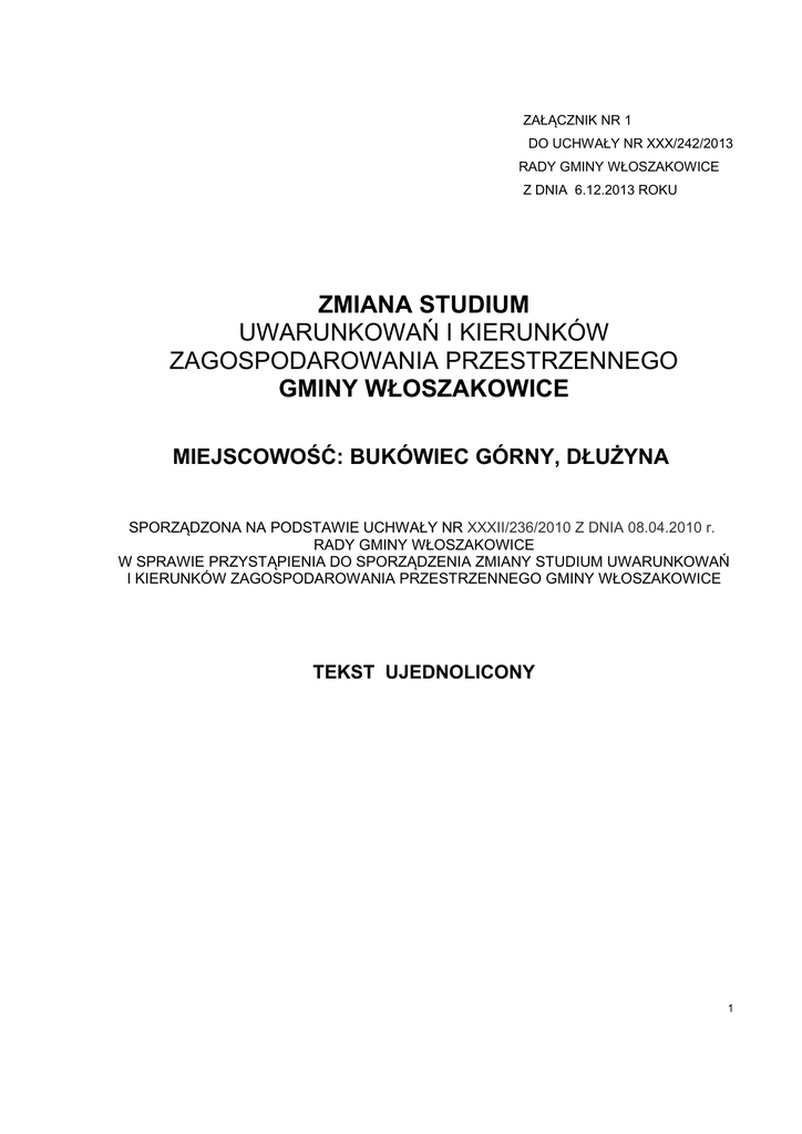 ZAŁĄCZNIK NR 1 DO UCHWAŁY NR XXX/242/2013 RADY GMINY WŁOSZAKOWICE Z DNIA 6.12.2013 ROKU ZMIANA STUDIUM UWARUNKOWAŃ I KIERUNKÓW ZAGOSPODAROWANIA PRZESTRZENNEGO GMINY WŁOSZAKOWICE MIEJSCOWOŚĆ: BUKÓWIEC GÓRNY, DŁUŻYNA SPORZĄDZONA NA PODSTAWIE UCHWAŁY NR XXXII/236/2010 Z DNIA 08.04.2010 r. RADY GMINY WŁOSZAKOWICE W SPRAWIE PRZYSTĄPIENIA DO SPORZĄDZENIA ZMIANY STUDIUM UWARUNKOWAŃ I KIERUNKÓW ZAGOSPODAROWANIA PRZESTRZENNEGO GMINY WŁOSZAKOWICE TEKST UJEDNOLICONY 1 ZMIANA STUDIUM UWARUNKOWAŃ I KIERUNKÓW ZAGOSPODAROWANIA PRZESTRZENNEGO GMINY WŁOSZAKOWICE SPIS TREŚCI I. Podstawa formalno-prawna zmiany Studium.....................................................................1 II. Przedmiot i obszar zmiany Studium...................................................................................1 III. Studium uwarunkowań i kierunków zagospodarowania przestrzennego gminy Włoszakowice – tekst ujednolicony ............................................................................4-136 IV. Wyszczególnienie zmiany Studium opracowanej na podstawie uchwały Nr XXXII/236/2010 Rady Gminy Włoszakowice z dnia 08 kwietnia 2010 r w sprawie przystąpienia do sporządzenia zmiany Studium uwarunkowań i kierunków zagospodarowania przestrzennego Gminy Włoszakowice...........................................................................................................140-146 I. Podstawa formalno-prawna zmiany Studium 1.1. Uchwała Nr XXXII/236/2010 Rady Gminy Włoszakowice z dnia 8 kwietnia 2010 r. w sprawie przystąpienia do sporządzenia zmiany Studium uwarunkowań i kierunków zagospodarowania przestrzennego Gminy Włoszakowice; 1.2. Ustawa z dnia 27 marca 2003 r. o planowaniu i zagospodarowaniu przestrzennym (tj.Dz. U. z 12.06.2012 r. poz.647); 1.3. Rozporządzenie Ministra Infrastruktury z dnia 28 kwietnia 2004 r. w sprawie zakresu projektu studium uwarunkowań i kierunków zagospodarowania przestrzennego gminy (Dz.U. z 2004 r. Nr 118, poz. 1233 z późniejszymi zmianami). II. Przedmiot i obszar zmiany Studium Przedmiotem zmiany Studium sporządzonej na podstawie uchwały Nr XXXII/236/2010 Rady Gminy Włoszakowice z dnia 8 kwietnia 2010 r. jest wprowadzenie do ustaleń Studium uwarunkowań i kierunków zagospodarowania przestrzennego Gminy Włoszakowice terenu lokalizacji turbin wiatrowych. Zmiana Studium obejmuje teren działek ewidencyjnych położonych w obrębie ewidencyjnym Bukówiec Górny i Dłużyna. W ramach zmiany Studium 2 wprowadza się możliwość lokalizacji elektrowni wiatrowych na terenach rolniczej przestrzeni produkcyjnej. Ustalenia, o których mowa w art. 10 ust. 2 ustawy z dnia 27 marca 2003 r. o planowaniu i zagospodarowaniu przestrzennym (tj. Dz. U. z 12.06.2012 r. poz.647), w zakresie objętym niniejszą zmianą Studium zostały wprowadzone do ujednoliconego tekstu Studium uwarunkowań i kierunków zagospodarowania przestrzennego Gminy Włoszakowice oraz wyszczególnione w rozdziale IV i wyróżnione szarym tłem. Obszar objęty zmianą Studium przedstawiono na rysunku Studium w skali 1 : 15 000 : 1. „Uwarunkowania zagospodarowania przestrzennego” 2. „Kierunki zagospodarowania przestrzennego” 3 WÓJT GMINY WŁOSZAKOWICE STUDIUM UWARUNKOWAŃ I KIERUNKÓW ZAGOSPODAROWANIA PRZESTRZENNEGO GMINY WŁOSZAKOWICE Studium uchwalone zostało Uchwałą Nr XXVIII/226/2005 Rady Gminy Włoszakowice z dnia 15.12.2005 r. Główny projektant mgr Marcin Englert ZOIU nr Z-364 mgr Maria Dobroń środowisko przyrodnicze mgr Andrzej Dobroń mgr Katarzyna Englert Środowisko kulturowe, i społeczne mgr inż.Janina Włodarczak infrastruktura techniczna inż. Maciej Kujawski opracowanie graficzne 4 WSTĘP 1. Cel i zakres opracowania Studium Uwarunkowań i Kierunków Zagospodarowania Przestrzennego Gminy Włoszakowice, zwane dalej Studium jest elementem systemu planowania przestrzennego ustalonego przepisami ustawy z dnia 27.03.2003 r. o planowaniu i zagospodarowaniu przestrzennym (Dz. U. Nr 80 poz. 717, z późn. zm.) Studium - obligatoryjne opracowanie planistyczne, dotyczące gminy w jej granicach administracyjnych, sporządzane jest na podstawie Uchwały Nr XXV/210/98 Rady Gminy Włoszakowice z dnia 18.06.1998 r. w sprawie przystąpienia do sporządzenia studium uwarunkowań i kierunków zagospodarowania przestrzennego gminy Włoszakowice. Podstawowym założeniem ustawy o zagospodarowaniu przestrzennym jest to, że zagospodarowanie przestrzeni, niezależnie od rodzaju, znaczenia i rozmiaru inwestycji lub przedsięwzięcia jak również ich realizatora, odbywa się zawsze na obszarze gminy. Oczywiście realizacja tych przedsięwzięć jest możliwa jedynie na terenach przeznaczonych na ten cel bowiem, zgodnie z przepisami Kodeksu Cywilnego, właściciel może korzystać z nieruchomości zgodnie z jej społeczno - gospodarczym przeznaczeniem. Tak więc w przepisach prawnych ustalono kompetencje w zakresie decydowania o przeznaczeniu terenów. I tak, stosownie do przepisów ustawy o samorządzie terytorialnym jak i ustawy o zagospodarowaniu przestrzennym, kompetencje w zakresie kształtowania ładu przestrzennego przez określanie przeznaczenia terenów oraz sposobu ich zabudowy i zagospodarowania, powierzono gminom. To tylko rada gminy przez uchwalenie miejscowych planów zagospodarowania przestrzennego stanowi o społeczno - gospodarczym przeznaczeniu terenów, które wraz z innymi przepisami prawa kształtują sposób wykonywania prawa własności. To dopiero po ustaleniu przeznaczenia terenów i warunków ich zabudowy i zagospodarowania mogą być realizowane określone przedsięwzięcia. Przedsięwzięcia takie planowane są, oczywiście, w różnym czasie i na różnych, często odległych od siebie terenach. Tak więc dla ich realizacji niezbędnym będzie wyprzedzające sporządzenie odpowiednich miejscowych planów zagospodarowania przestrzennego. Wychodząc z założenia, że zagospodarowanie terenów odbywać się może w oparciu o wiele miejscowych plan