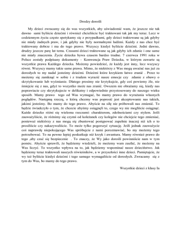 Drodzy dorośli My dzieci zwracamy się do was wszystkich, aby uświadomić wam, że jeszcze nie tak dawno sami byliście dziećmi i również chcieliście być traktowani tak jak my teraz. Lecz w codziennym życiu często spotykamy się z przypadkami, gdy dzieci traktowane są jak gdyby nie miały żadnych praw, i jak gdyby nie były normalnymi ludźmi. Każdy z nas chce być traktowany dobrze i ma do tego prawo. Wszyscy kiedyś byliście dziećmi. Jedni dawno, drudzy jeszcze parę lat temu. Czasami dzieci traktowane są jak gdyby ich zdanie i one same nie miały znaczenia. Życie dziecka bywa czasem bardzo trudne. 7 czerwca 1991 roku w Polsce zostały podpisany dokumenty – Konwencja Praw Dziecka, w którym zawarte są wszystkie prawa Każdego dziecka. Możemy powiedzieć, że każdy jest inny, lecz wszyscy równi. Wszyscy mamy takie same prawa. Mimo, że niektórzy z Was mogą uważać nas już za dorosłych to my nadal jesteśmy dziećmi. Dziećmi które krzykiem łatwo zranić . Przez to możemy się zamknąć w sobie i z trudem wyrazić nasze emocje czy zdanie z obawy o skrytykowanie lub wyśmianie. Dlatego prosimy nie krytykujcie, gdy coś powiemy źle, nie śmiejcie się z nas, gdyż to wszystko może nas zranić. Owszem nie obrażamy się, kiedy nas poprawiacie czy skrytykujecie w delikatny i odpowiednio przystosowany do naszego wieku sposób. Mamy prawo tego od Was wymagać, bo mamy prawo do wyrażania własnych poglądów. Następną rzeczą, o którą chcemy was poprosić jest akceptowanie nas takich, jakimi jesteśmy. Bo mamy do tego prawo. Abyście na siłę nie próbowali nas zmienić. To będzie świadczyło o tym, że chcecie abyśmy osiągnęli to, czego wy nie mogliście osiągnąć. Każde dziecko różni się wieloma rzeczami: charakterem, zdolnościami czy stylem. Jeśli zauważyliście, że różnimy się czymś od koleżanek czy kolegów nie chciejcie tego zmieniać, ponieważ niektórzy z nas mogą się zbuntować postępować zupełnie inaczej niż ich o to prosiliście czy nakazywaliście. To może tylko pogorszyć sytuację. Jeśli jednak zauważycie coś naprawdę niepokojącego Was spróbujcie z nami porozmawiać, bo my możemy tego potrzebować. To na pewno lepiej poskutkuje niż krzyk i awantura. Mamy również prawo do tego ,aby czuć się bezpiecznie . To znaczy, że Wy jako dorośli powinniście nam w tym pomóc. Abyście sprawili, że będziemy wiedzieli, że możemy wam zaufać, że możemy na Was liczyć. To wszystko wpływa na to, jak będziemy wspominać nasze dzieciństwo. Jak będziemy teraz traktowali naszych rówieśników, a w przyszłości inne dzieci. Pamiętajcie, że wy też byliście kiedyś dziećmi i tego samego wymagaliście od dorosłych. Zwracamy się z tym do Was, bo mamy do tego prawo. Wszystkie dzieci z klasy Ia Świnice Warckie 18 Listopada 2015 rok Kochani Dorośli ! Kierujemy do was ten list, aby przypomnieć wam o naszych prawach. My też je mamy ! Każdy od momentu urodzenia, pomimo że nie jest pełnoletni, jest przecież człowiekiem. 6 stycznia 2000 roku powstał pewien niezwykle ważny ( dla nas dzieci dokument ). A mianowicie Ustawa Rzecznika Praw Dziecka. Zawarte w niej przepisy stanowią dla was pewną wskazówkę dotyczącą sposobu naszego traktowania. Jednakże pragniemy wam przedstawić NASZE odczucia i przemyślenia w tej sprawie. Chcemy mieć prawo do własnego zdania i wyrażania opinii na różne tematy. Oczekujemy że zrozumiecie iż mamy poglądy odmienne niż Wy dorośli. Nie zawsze będziemy zgadzać się z waszym zdaniem a Wy z naszym. Postarajcie się to zrozumieć, bądźcie bardziej tolerancyjni i wspólnie egzystujmy w obopólnym poszanowaniu. Mamy prawo do wolnego czasu i rozrywki. Ważne dla nas jest aby wolny czas spędzać według własnego uznania a rozrywka niech sprawia nam przyjemność i zadowolenie:). Pragniemy kierować się w życiu własnymi uczuciami i emocjami. To my chcemy swoich przyjaciół i znajomych i otaczać się osobami, w których wybierać towarzystwie czujemy się dobrze, a przede wszystkim doskonale się rozumiemy. Pragniemy abyście zaakceptowali nasze samodzielne wybory. Chcielibyśmy abyście pozwolili nam decydować o naszej przyszłości. Niech nasze marzenia będą naszymi, a nie waszymi. Nie starajcie się ułożyć nam życia, ponieważ sami chcemy uczyć się na własnych błędach, bo taka nauka jest najlepszą szkołą życia. Nie chcemy żyć pod szklanym kloszem i parawanem waszej opiekuńczości. Reasumując chcemy korzystać z porad i doświadczeń was dorosłych, ale każdy z nas ma tylko 1 życie i ważne jest aby przeżyć je zgodnie z własnymi marzeniami i wyborami. Kiedyś my też będziemy dorośli i z przyszłym pokoleniem chcielibyśmy żyć w zgodzie, harmonii i zrozumieniu. Ważne, aby zanikał konflikt pokoleń, a młodzi ze starszymi zawsze mogli znaleźć ''nutę'' wzajemnego porozumienia. Bo tylko wtedy podtrzymamy międzypokoleniowy dialog. Ten list pisaliśmy my czyli wasze dzieci klasa Ib Drodzy dorośli ! Bardzo trudno jest w tych czasach zrozumieć świat młodego człowieka. Zdarza się, że sami siebie nie rozumiemy. Każdy nieletni pragnie więcej wyrozumiałości z Waszej strony. Dopiero wkraczamy w dorosłość, więc chcielibyśmy otrzymać od Was wskazówki. Dojrzewanie wiąże się ze zmianami nastroju, więc w ten czas ważne jest również wsparcie. Testujemy w tym okresie Waszą cierpliwość, sprawdzamy, czy jesteście w stanie w pełni zaakceptować to zachowanie. Czasami zdarza się, że odizolowujemy się od środowiska, chcemy przebywać samotnie. Jest to również jedna z forum buntu, który przechodzimy. W dzisiejszych czasach motto „Ja i mój komputer” jest codziennością. Dzięki wam uczymy się żyć tak, by te rzeczy nie były najważniejsze, choć czasami się temu przeciwstawiamy. Popełniamy również błędy, których nie da się już naprawić, ale przecież Wy też tak mieliście. Chcemy, byście pogodzili 