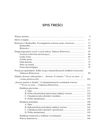 SPIS TREŚCI Wykaz skrótów 9 Słowo wstępne 13 Różewicz i Bonhoeffer. Na marginesie wiersza nauka chodzenia Bonhoeffer Różewicz 17 19 39 Druga noga poety (czyli o czym milczy Tadeusz Różewicz) Zwierzę (człowiek niewierzący) Łaska wiary Zwłoki poety Głód dziecka Palec na ustach Poeta (bez)religijny 65 66 69 71 73 76 79 Poezja po apokalipsie. Kilka uwag o katastroficznych źródłach twórczości Tadeusza Różewicza 89 Między słowem, milczeniem i… słowem. O wierszu ***[Czas na mnie…] z tomu płaskorzeźba 103 „Jeszcze jestem w drodze”. O rękopiśmiennych wariantach wiersza ***[Czas na mnie…] Tadeusza Różewicza 115 Redakcja pierwotna A. Opis B. Próba rekonstrukcji pierwotnej redakcji wiersza C. Charakterystyka skreśleń i korektur D. Próba interpretacji 117 117 118 123 124 Redakcja pośrednia A. Opis B. Rekonstrukcja pośredniej redakcji wiersza C. Charakterystyka skreśleń i przeniesień D. Próba interpretacji 140 140 142 143 143 Redakcja ostateczna a redakcje wcześniejsze Wiersz fantomowy 144 146 8 Aneks 155 Anioł w majtkach polixeny. O Miłoszu i Różewiczu rozmawiają Przemysław Dakowicz i Jan Stolarczyk 157 Bibliografia 185 Nota bibliograficzna 189 Indeks 191